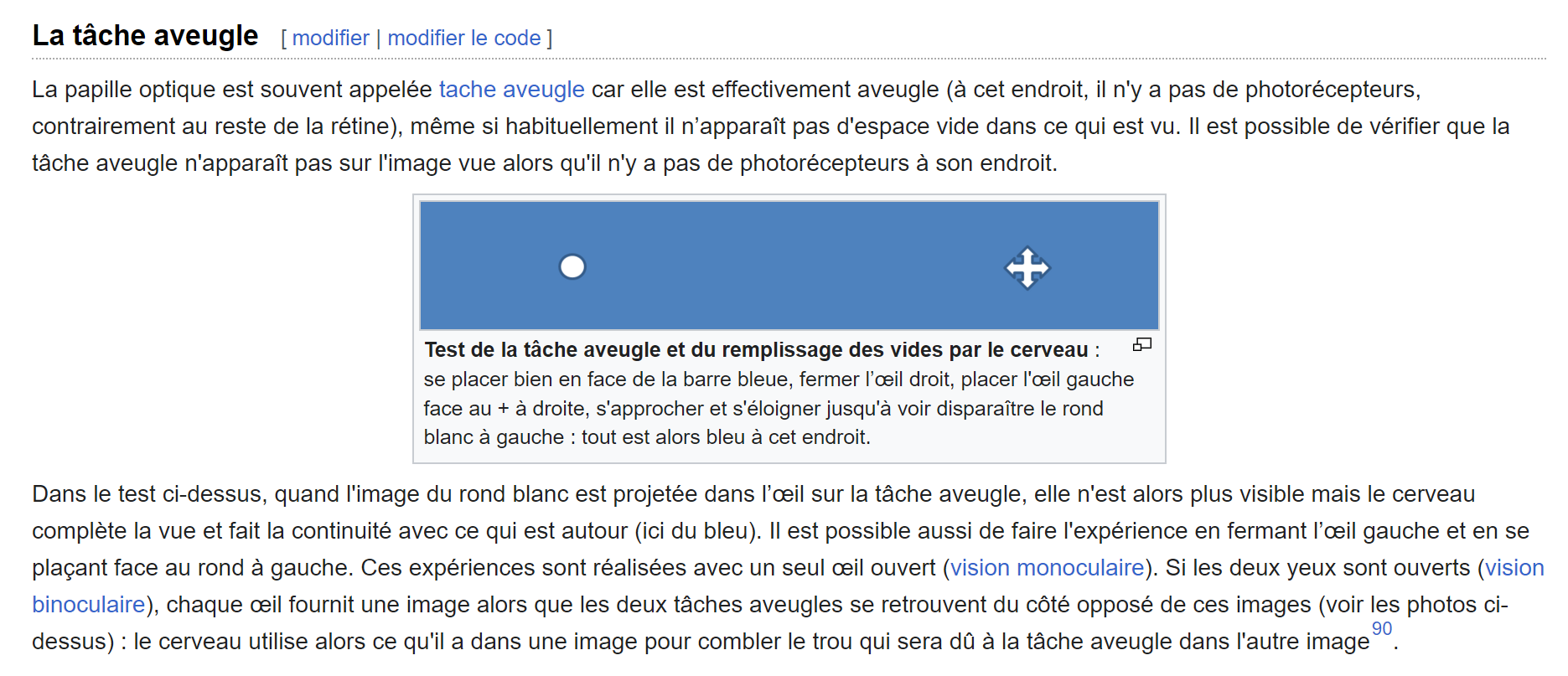 Et pourtant! j'avais vaguement fait connaissance avec ce sujet communément admis et documenté par la science en étudiant la stéréoscopie. Je ne peux pas trouver une documentation complète sur le sujet en quelques minutes mais voici quelques pistes collectées rapidement: 1: En stéréoscopie de style anaglyphe (une image rouge et une image bleue superposées), certains vois la couleur des objets bien qu'elle n'est souvent plus visible. c'est en fait le cerveau qui compense ce manque information. D'ailleurs, pour les gens chez qui la stéréoscopie fonctionne, il est évident a tous qu'aucun objet ne sort de l'écran 3D, c'est le cerveau qui interprète les infos qu'il reçois du système optique! 2: Connaissez le test de la tâche aveugle? Ici, le cerveau se base sur le reste de l'image pour compléter le morceau manquant, ici de la couleur bleue mais ça pourrait aussi fonctionner avec un quadrillage bien que je n'ai pas fait le test: https://fr.wikipedia.org/wiki/Vision_humaine 3: une super vidéo que je viens de trouver sur la vision humaine. Je viens grâce à elle de comprendre le fonctionnement de la vision décalée, rien que pour ça, je vous la recommande chaudement, elle vaudrait l'ouverture d'un nouveau sujet à elle toute seule! 🤩 La vidéo donne aussi quelques pistes sur comment le cerveau compense le manque de couleur en vision périphérique Voila voila, après je dit pas que c'est un truc magique qui va permettre de faire des miracles et tout voir en observation astronomique mais ça reste un paramètre intéressant à étudier pour quelqu'un de curieux comme moi. J'ai déjà renoncé à la voir mais Franchement, si j'ai Orion dans le viseur pour voir la grande nébuleuse, c'est pas perdre un temps fou que de faire un petit détour même en étant conscient que je ne verrais rien. 😇 Pour moi c'est un rêve d'enfant que je n'ai pas su réaliser à l'époque, je croyais pouvoir le faire en achetant ce télescope et maintenant, je réalise que ce n'est toujours pas possible parce-qu'il faut un diamètre encore plus grand alors laissez moi un peu de temps pour digérer l'info. 😓