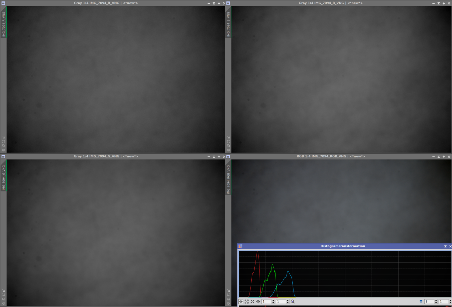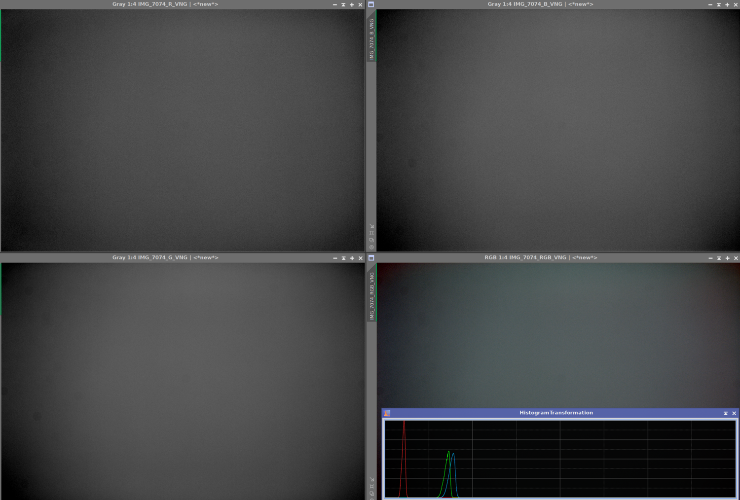 Hello @nico1038 NB: j'ai changé le filtre hier pour mettre un triband (car ma prochaine cible sera une nébuleuse) - le filtre est tri-band de altair astro J'ai fait un petit test : j'ai regénéré des flats cette fois-ci en mettant un papier blanc au bout de mon tube, et en l'eclairant avec une lampe de poche (A led, donc normalement elle emet tout le spectre) - bon ca donnera pas des flats uniformes/utilisables, mais pour le test ca me paraissait bien comme approche! Ca semble un peu mieux, mais j'ai toujours un gros décalage sur le vert (et un léger entre rouge et bleu) : J'ai refait avec ma boite a flats, mais cette fois ci une expo plus courte (0.4s) - je pense que mon vert etait brulé... La aussi le résultat semble meilleur même si je vois encore ces décalages! Pour le vert brulé, je me demande s'il n'y a pas un traitement fait par l'asiair : mon APN est 14bits et l'asiair me sort du 16bits --> est-ce possible que l'asiair "comble" l'histograme plutot que de l'étirer? Pour avoir le coeur net et savoir si le décalage du vert ne viendrait pas de l'asiair, je me suis dit "tiens, et si j'analysais le RAW de l'APN plutot que le fit sorti de l'asiair?" - voila donc l'analyse avec le raw qui est exactement la meme photo que ci-dessus (0.4s avec boite a flats) : Etrange... l'histogramme n'a rien a voir...!! Le décalage du rouge peut être du au filtre tri-band Allez, soyons fous : un dernier test en enlevant l'APN du tube et en mettant un objectif - donc toujours 0.4s, APN+18mm (ouverture a 16 sinon je suis trop haut dans l'histo) et ma boite a flats Bon du coup on voit la mauvaise qualité du papier calque mais pour le test c'est pas grave! J'avouerais que la j'ai un peu du mal!!! - Le décalage du vert semble provenir de l'asiair, non? - Le vert brulé (meme si mon histo ne le montre pas) avec une expo de 800ms ou 600ms peut-il lui aussi venir de l'asair? - Le décalage du rouge peut venir soit de mon APN, soit de ma boite a flats, soit des 2 (il est plus leger avec le papier blanc + asiair, mais toujours présent)