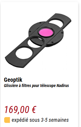Cette question ne s'adresse que pour ceux qui connaissent les Dobson Taurus Bonjour Pour mon Dobson Taurus 350, je recherche une roue à filtre. Il y en a une chez Geoptik. Elle se positionnerait à l'intérieur de la cage du secondaire au niveau du porte oculaire. L'intérieur de la tête du Taurus est en plastique (et non en bois) recouvert de feutrine. Peut-on installer la glissière pour fitres (qu'il faut apparemment visser) ? (Par ailleurs, je ne vois pas comment peut fonctionner cette glissière sur un tube de po rentrant et sortant)