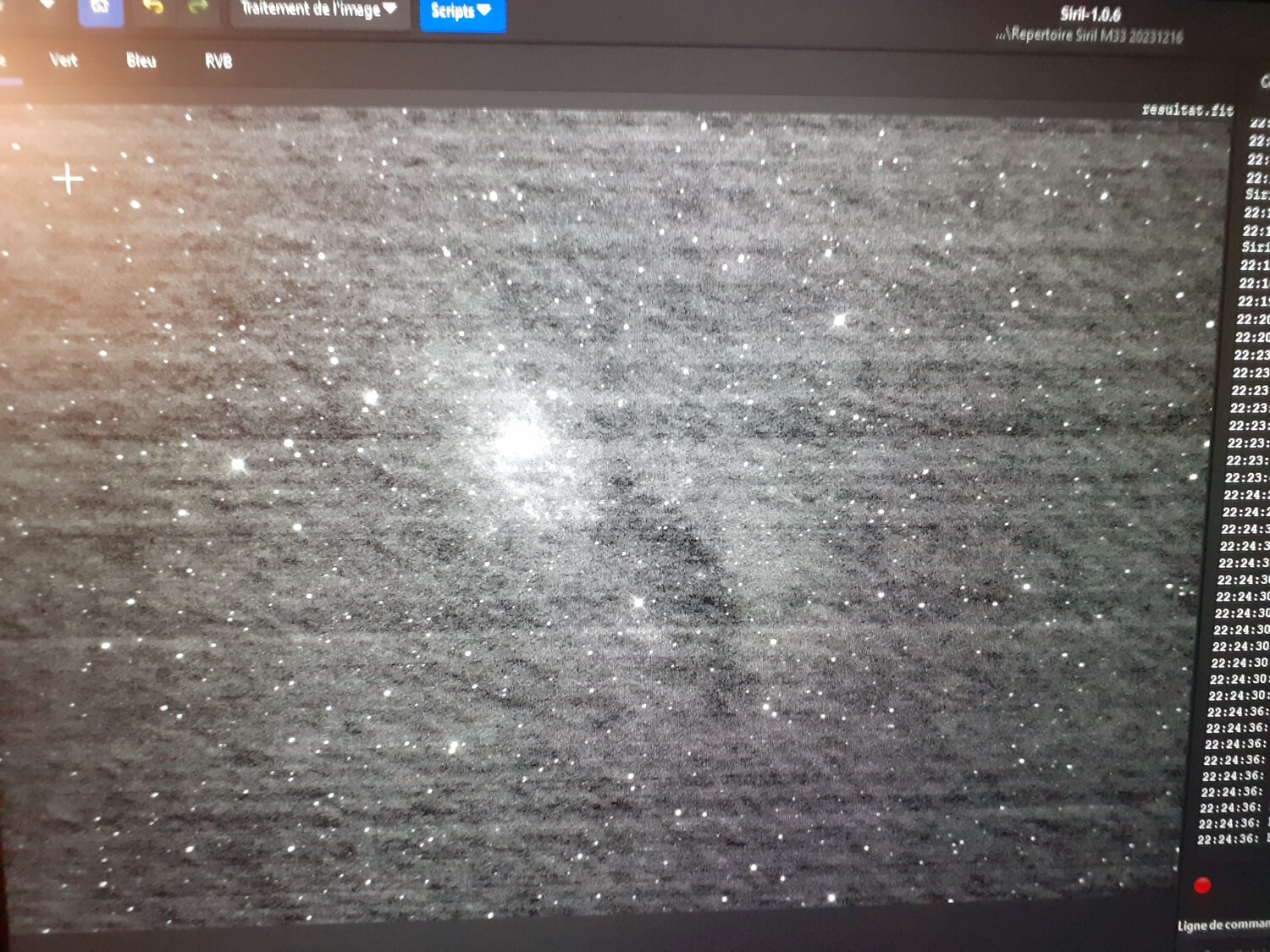 5. Merci de te pencher sur mon problème. Voici une image brute M33 et aussi, éventuellement le résultat après traitement siril J ajoute que j ai fait 80 pauses d une minute iso 800. Encore merci et bonne soirée