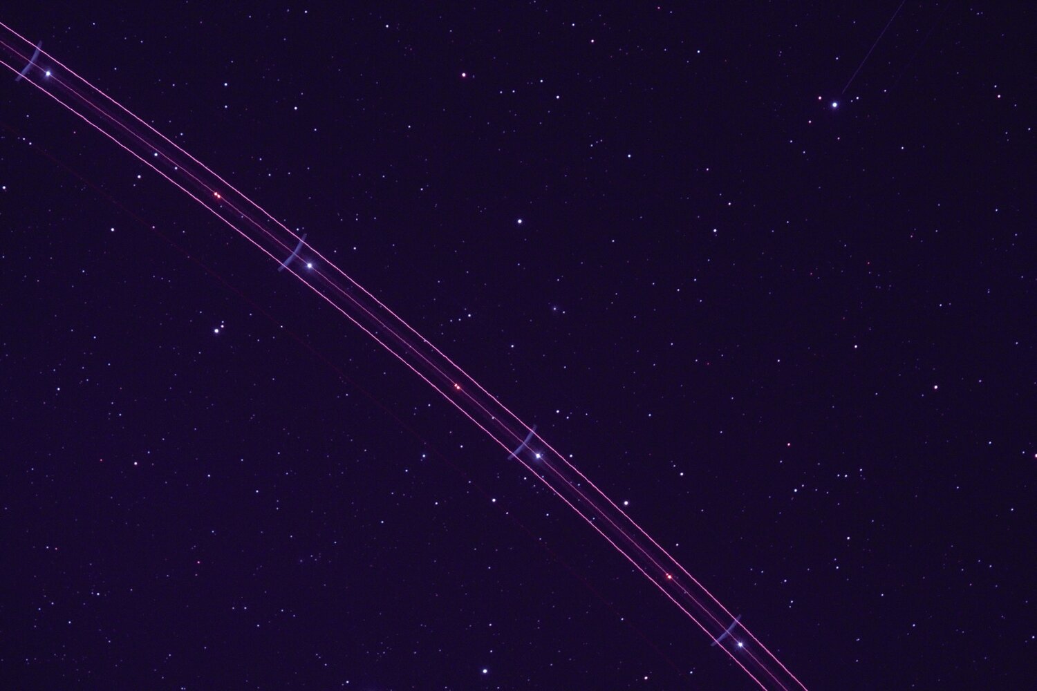2. Merci pour vos réponses. Il s'agit d'un avion, donc ,tout bêtement. Mais pourquoi ces 2 lignes parallèles de part et d'autre de la trajectoire de l'avion? Sinon, ce sont bien des poseslongues de 2 minutes sur une nébuleuse. En haut à droite, je ne pense pas que ce soit un satellite, sinon il y aurait un filé sur 2 minutes de pose comme pour l'avion ... Bon ciel.