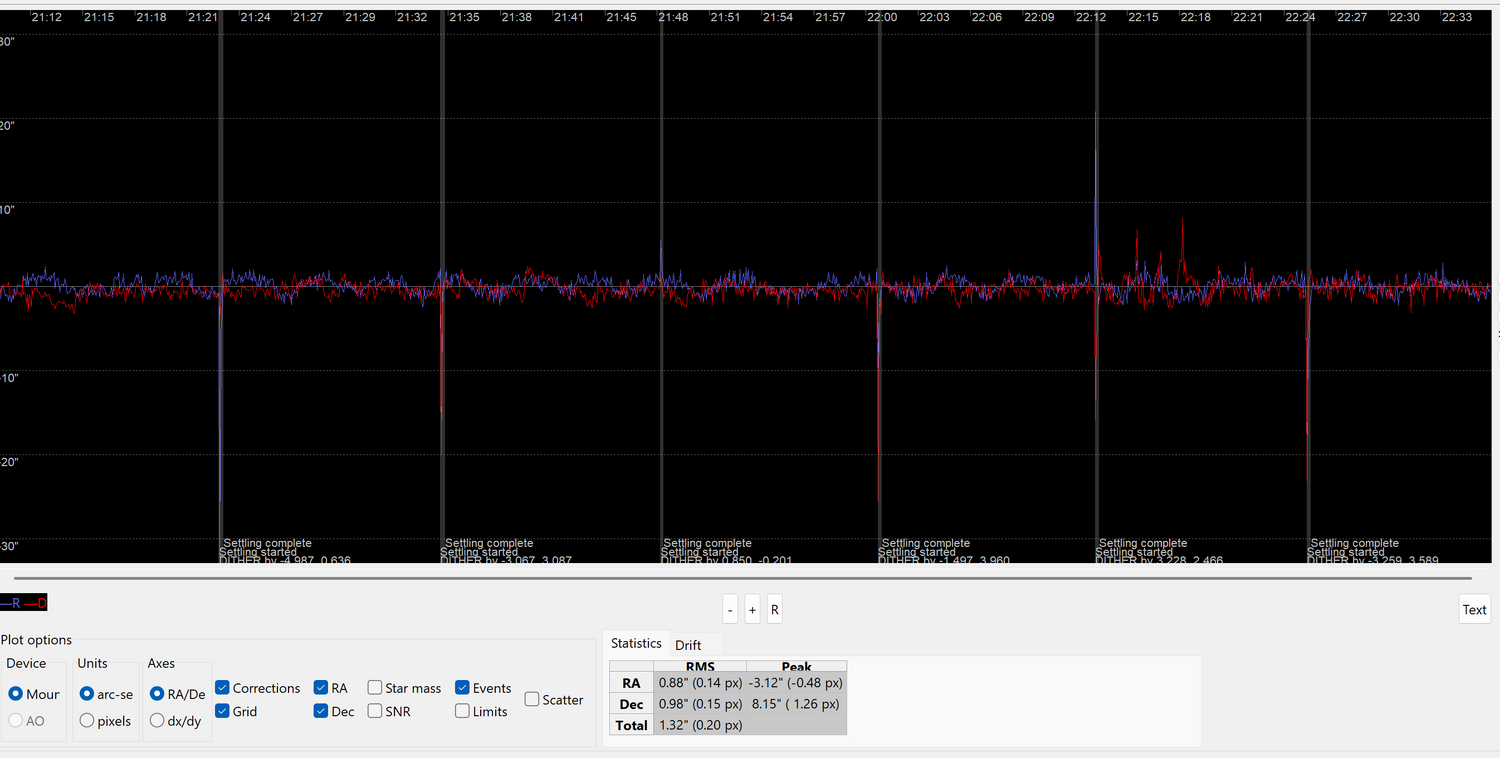 Bonjour à tous. J'ai besoin d'aide car mon guidage part en cacahuète... Matériel : SA GTI, Camera Player One Poseidon C-pro + Canon EF 400 5.6, ASI 120 mini + ZWO 30/f4 Guidage PHD2 + GSS + NINA J'ai travaillé sur l'équilibrage, la GTI a un très léger backlash (besoin de le corriger ?). Ce qui m'embête c'est que ça guide correct pendant un moment puis tout d'un coup ça part en vrille et bis repetita. Un dirait un problème cyclique qui semble venir de la monture. L'autre soir, guidage correct, retournement au méridien puis guidage catastrophique (inverser la sortie DEC après retournement est coché) Je vous laisse admirer les courbes, c'est pathétique. Une explication ? Guidage avant et après retournement :