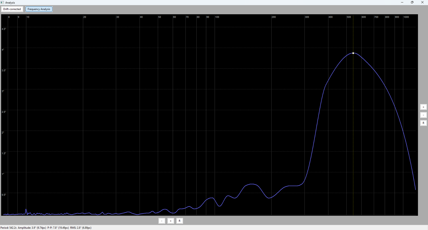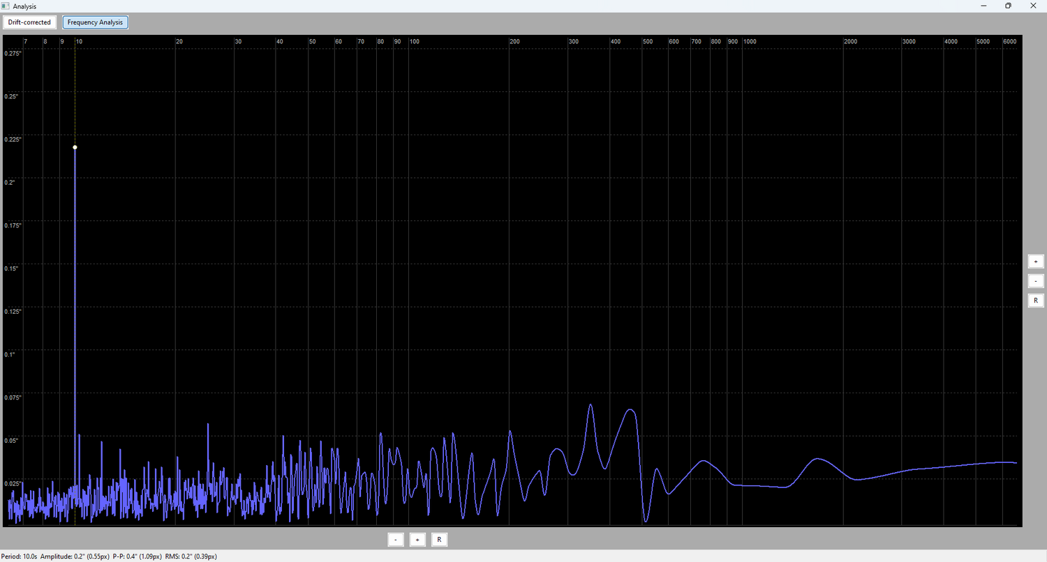 Bonjour les pros des montures skywatcher, Comme le ciel commence à être moins clément, je vais me lancer dans un peu de maintenance sur mon matériel. J'essaie de comprendre s'il faut que je me lance dans le réglage de ma monture. J'ai donc fait une petite séance de mesure ce week-end dont voici les résultats. Je suis néophyte sur le guidage et l'AZEQ6, je m'en remets à votre expérience. Tout d'abord, le matériel : Monture : AZEQ6, achetée d'occasion ll y a 6 mois Tube: Celestron C9.25, réducteur 0.63 Guidage : Off Axis Je suis sur-échantillonné.... C'est difficile de trouver des caméras avec des gros pixels à des prix raisonnables.. La mesure : Et l'analyse de fréquences : On voit la plus importante période à 542,2 s, avec une amplitude de 3,9". Est-ce que ça vous semble correct pour une AZ-EQ6 ? Merci ! Laurent