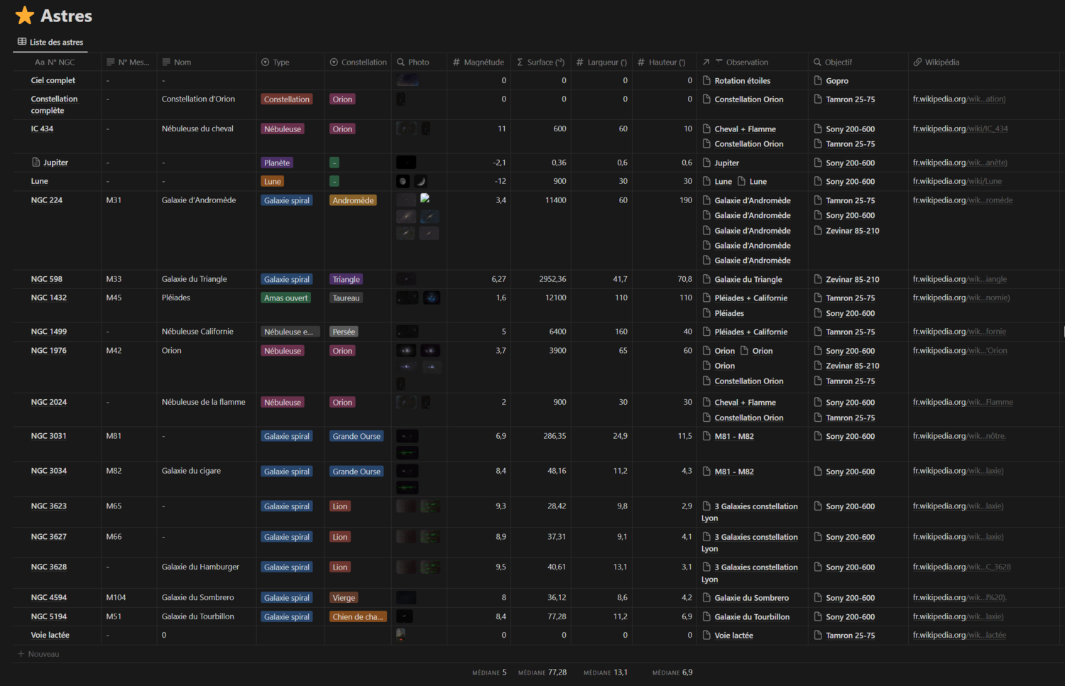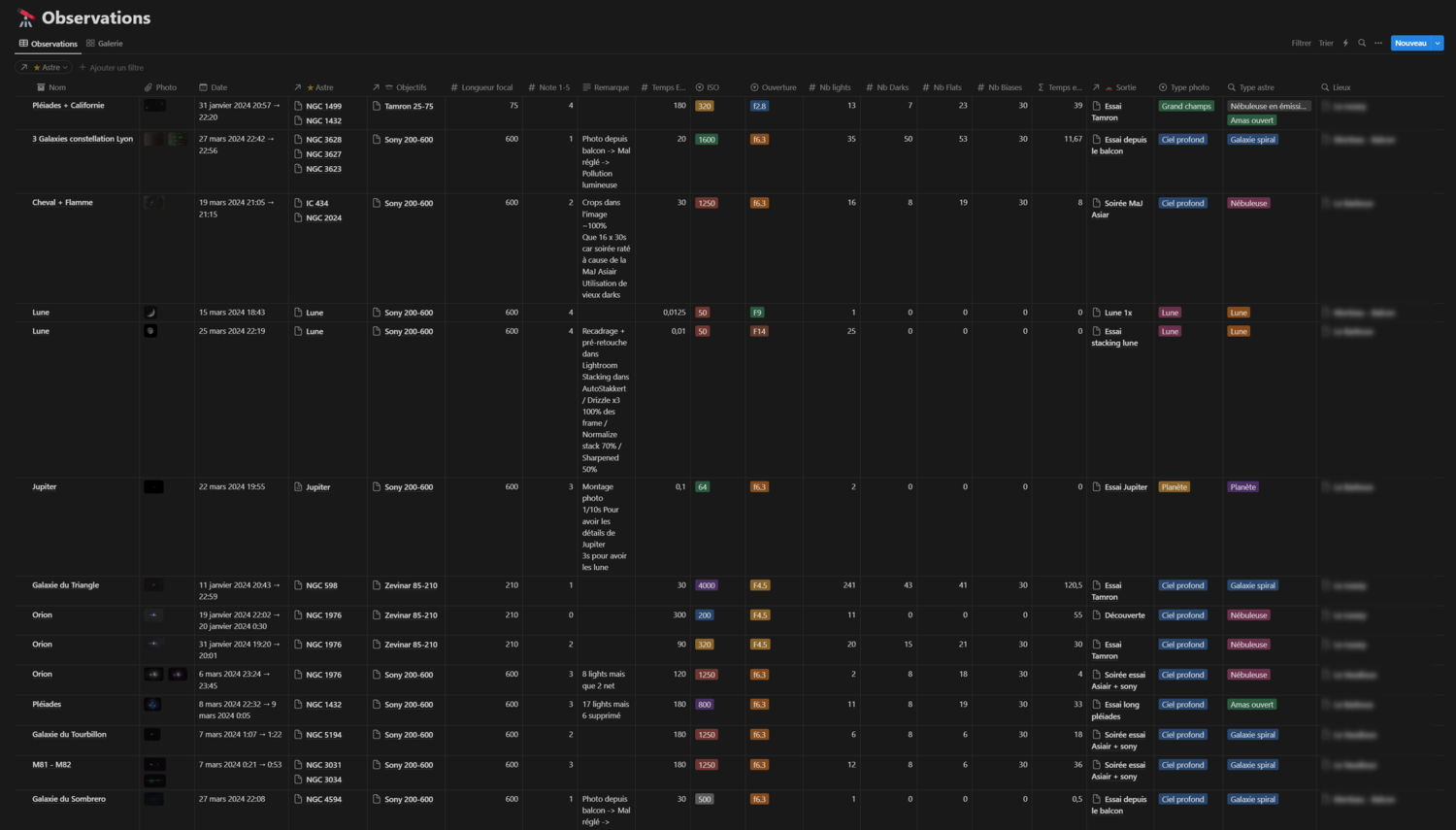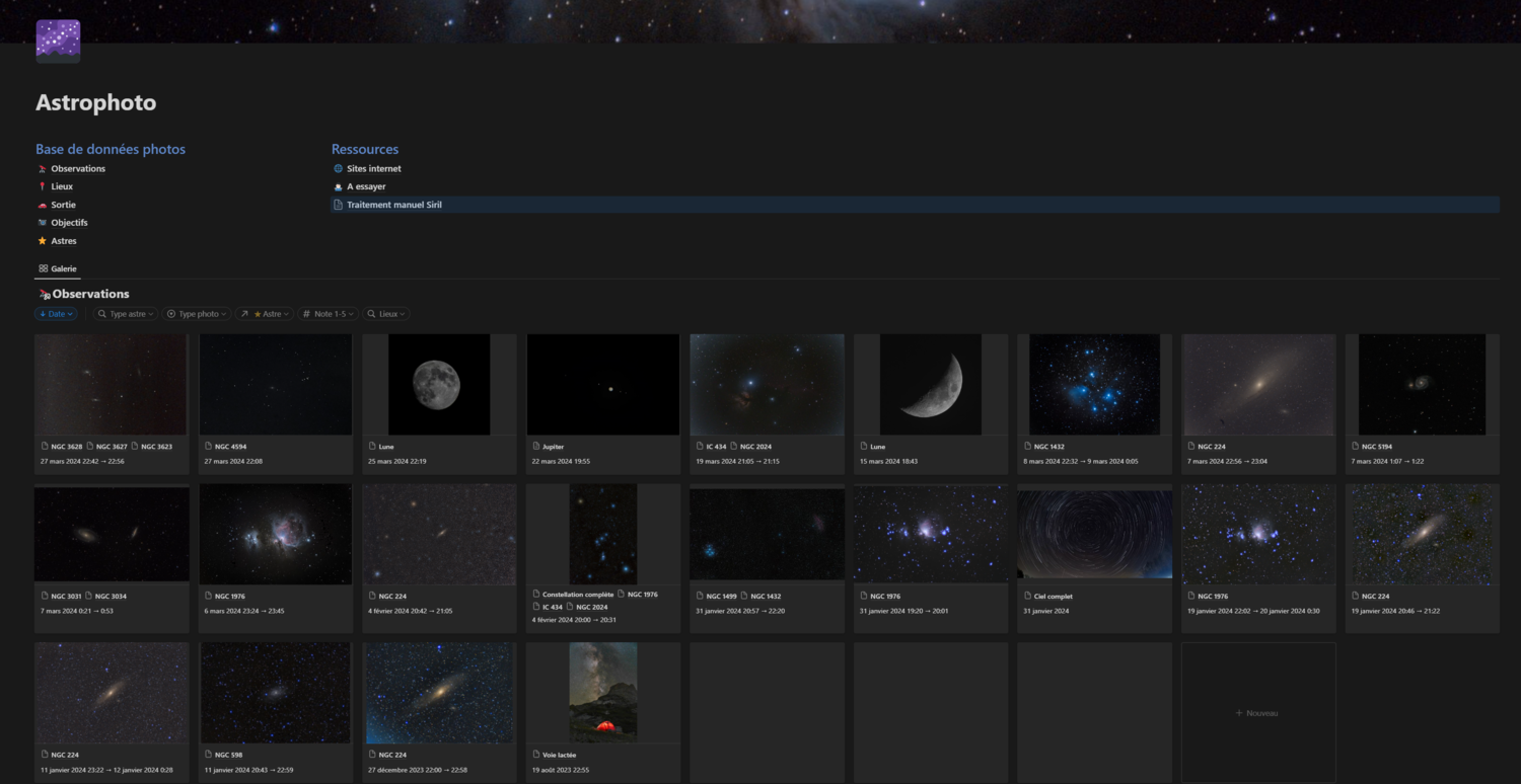 Bonjour, J'espère que tout le monde va bien !? Merci pour vos retours ! Entre-temps j'ai changé de méthode d'archivage, je suis passer de l'outil OneNote, à l'outil Notion C'est un logiciel de prise de note assez interactif, je n'avais jamais essayé jusqu'à présent. La version de base, qui gèrent les tables est gratuite, cependant j'ai tout de même payé un abonnement (50€/ ans) pour me permettre de charger les photos. (Limité à 5mo pour la version gratuite) L'idée est de créer des tables, qui vont pouvoir interagir entre elles, tout en ayant une solution simple pour renseigner et trouver les informations. Mais pas pour stocker l'ensemble des mes fichiers photos (darks / lights etc), ça je laisse sur mes disques durs. Quelques images valent plus que 1000 mots ! Si vous voyez que j'ai fais quelques fautes, n'hésitez pas à me le dire ! Je me cherche encore, donc tout commentaire est bon a prendre ! Au besoin je peux donner + de détails, et si d'entre vous veulent ce lancer la dedans on peut voir ça ensemble Pour info, la mise en place de l'outil a du me prendre 1/2 journée. ------ La fonction utilisé ce trouve dans Base de données -> Vue "table" Lorsqu'un colonne affiche "" cela veux dire que l'information est importée d'une autre table La 1er table gère les lieux de prise de vues : La 2nd table gère les sorties : La 3ième table gère les objectifs photo utilisés La 4ième table gère les astres photographiés Et enfin la dernière table correspond aux "observations", pour faire simple, le cumul de toutes les autres tables avec les paramètres utilisés Les tables, c'est bien, mais c'est loin d'être la choses la + facile à lire, cependant il est possible d'afficher la table sous forme de galeries, ce qui est beaucoup plus simple ! L'avantage c'est qu'il est aussi possible d'appliquer des filtres (lieux / type / objectifs / bref la colonne que l'on veux), aujourd'hui je n'ai que quelques photos donc c'est simple de m'y retrouver, mais si je commence à augmenter le nombre de sessions... Si je clique sur une vignette j'obtient tout les informations du tableau liée à l'observation Si je clique sur la photo (4ième ligne), elle s'affiche en grand Cerise sur le gâteau, pour renseigner une nouvelle observation ou autres, il est possible de créer une page simple, vide, dans lequel il suffit de cocher les cases et remplir les quelques informations, En plus de ça il est assez malin, pour plusieurs attributs, il me propose tout de suite des valeurs des tables Pour rendre l'interface encore plus simple, j'ai pu créer une page de garde avec les liens vers les différentes tables et l'affichage des observations, J'ai aussi ajouté d'autres pages qui sont des petits pense bêtes -