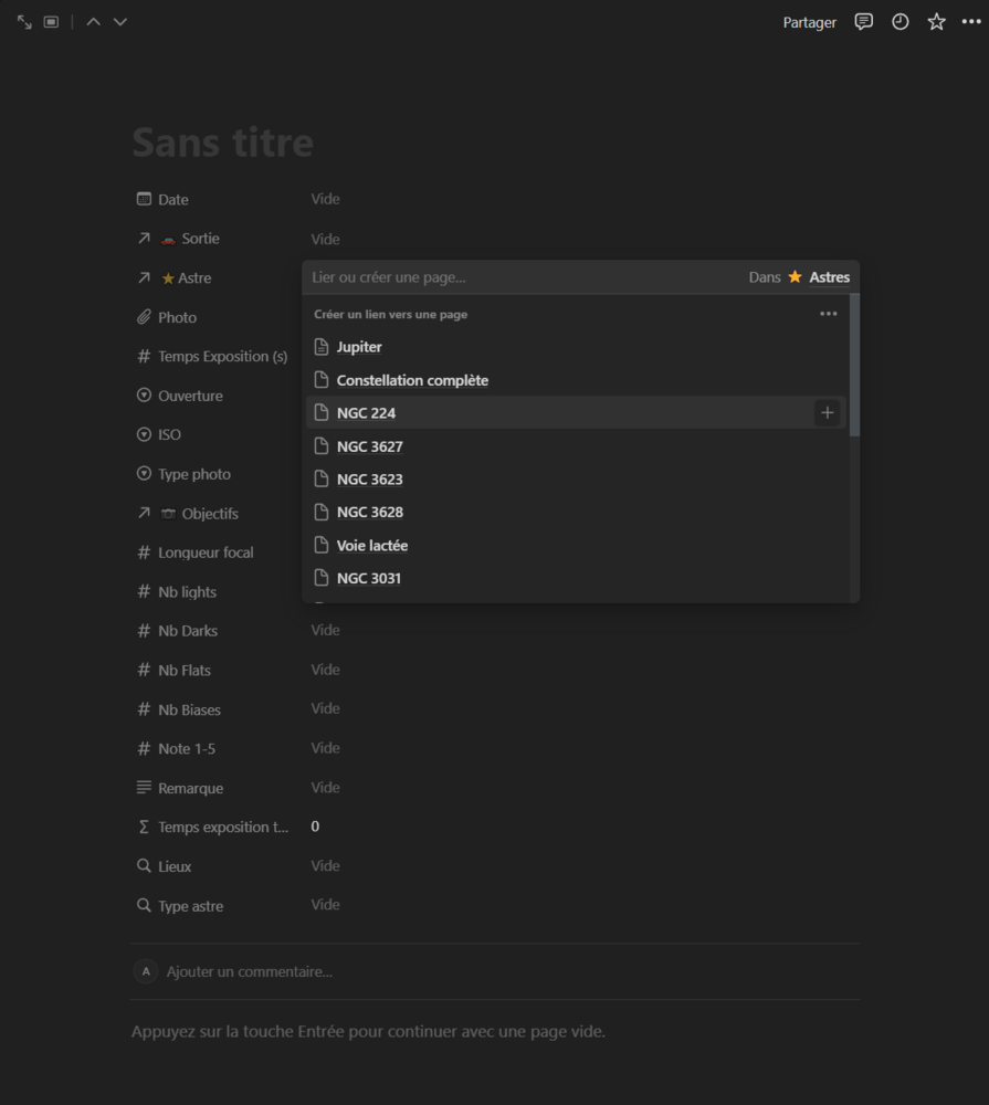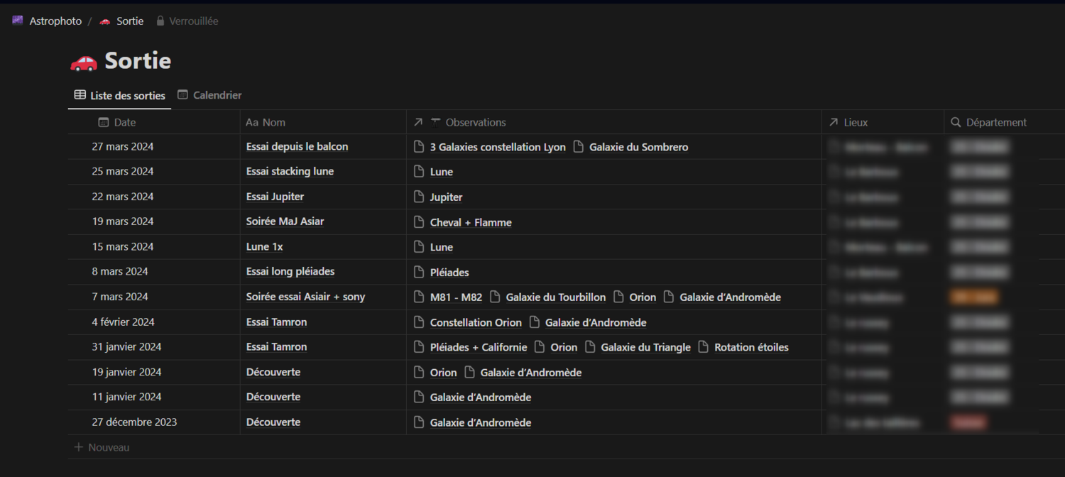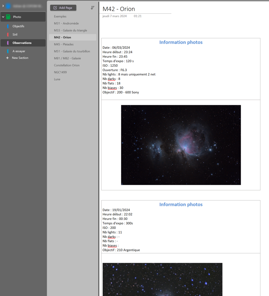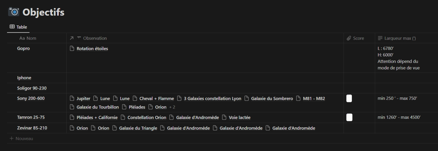 Bonjour, J'espère que tout le monde va bien !? Merci pour vos retours ! Entre-temps j'ai changé de méthode d'archivage, je suis passer de l'outil OneNote, à l'outil Notion C'est un logiciel de prise de note assez interactif, je n'avais jamais essayé jusqu'à présent. La version de base, qui gèrent les tables est gratuite, cependant j'ai tout de même payé un abonnement (50€/ ans) pour me permettre de charger les photos. (Limité à 5mo pour la version gratuite) L'idée est de créer des tables, qui vont pouvoir interagir entre elles, tout en ayant une solution simple pour renseigner et trouver les informations. Mais pas pour stocker l'ensemble des mes fichiers photos (darks / lights etc), ça je laisse sur mes disques durs. Quelques images valent plus que 1000 mots ! Si vous voyez que j'ai fais quelques fautes, n'hésitez pas à me le dire ! Je me cherche encore, donc tout commentaire est bon a prendre ! Au besoin je peux donner + de détails, et si d'entre vous veulent ce lancer la dedans on peut voir ça ensemble Pour info, la mise en place de l'outil a du me prendre 1/2 journée. ------ La fonction utilisé ce trouve dans Base de données -> Vue "table" Lorsqu'un colonne affiche "" cela veux dire que l'information est importée d'une autre table La 1er table gère les lieux de prise de vues : La 2nd table gère les sorties : La 3ième table gère les objectifs photo utilisés La 4ième table gère les astres photographiés Et enfin la dernière table correspond aux "observations", pour faire simple, le cumul de toutes les autres tables avec les paramètres utilisés Les tables, c'est bien, mais c'est loin d'être la choses la + facile à lire, cependant il est possible d'afficher la table sous forme de galeries, ce qui est beaucoup plus simple ! L'avantage c'est qu'il est aussi possible d'appliquer des filtres (lieux / type / objectifs / bref la colonne que l'on veux), aujourd'hui je n'ai que quelques photos donc c'est simple de m'y retrouver, mais si je commence à augmenter le nombre de sessions... Si je clique sur une vignette j'obtient tout les informations du tableau liée à l'observation Si je clique sur la photo (4ième ligne), elle s'affiche en grand Cerise sur le gâteau, pour renseigner une nouvelle observation ou autres, il est possible de créer une page simple, vide, dans lequel il suffit de cocher les cases et remplir les quelques informations, En plus de ça il est assez malin, pour plusieurs attributs, il me propose tout de suite des valeurs des tables Pour rendre l'interface encore plus simple, j'ai pu créer une page de garde avec les liens vers les différentes tables et l'affichage des observations, J'ai aussi ajouté d'autres pages qui sont des petits pense bêtes -