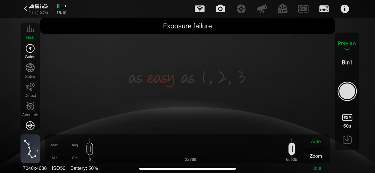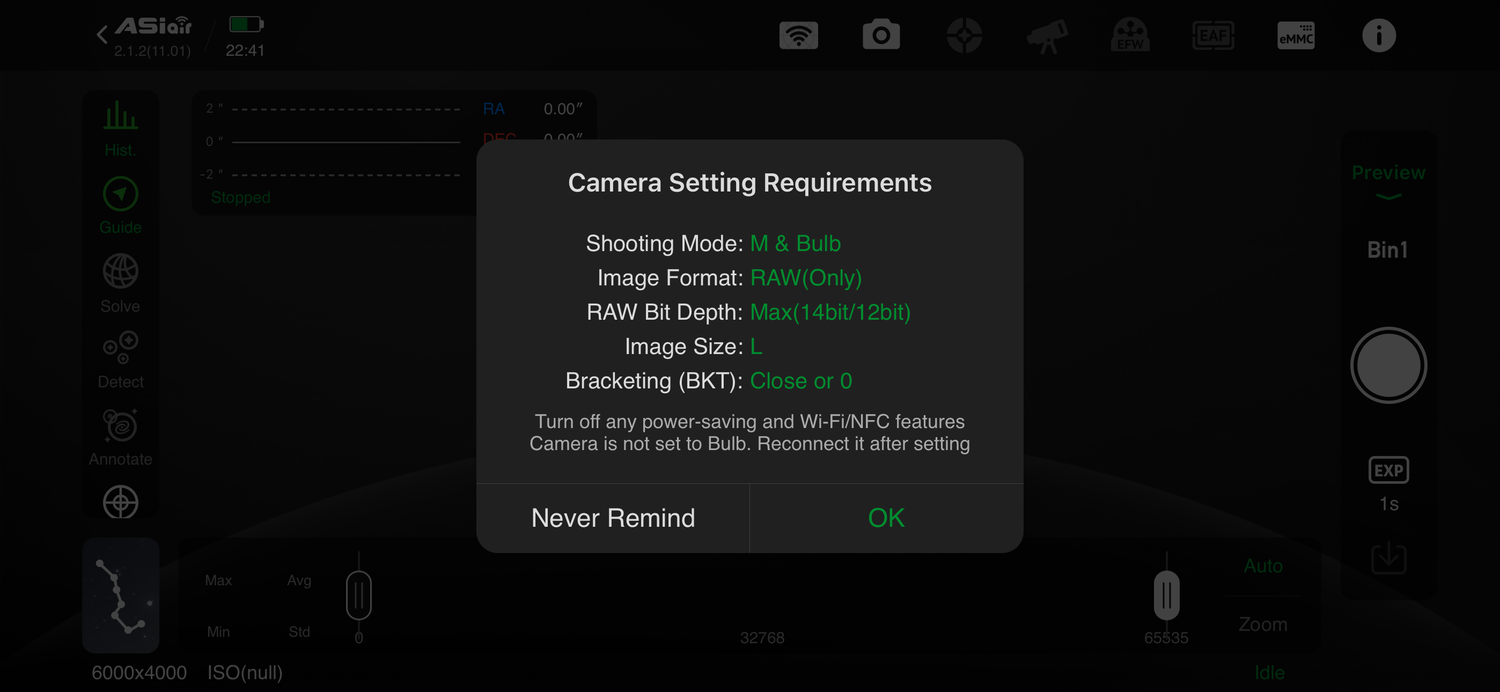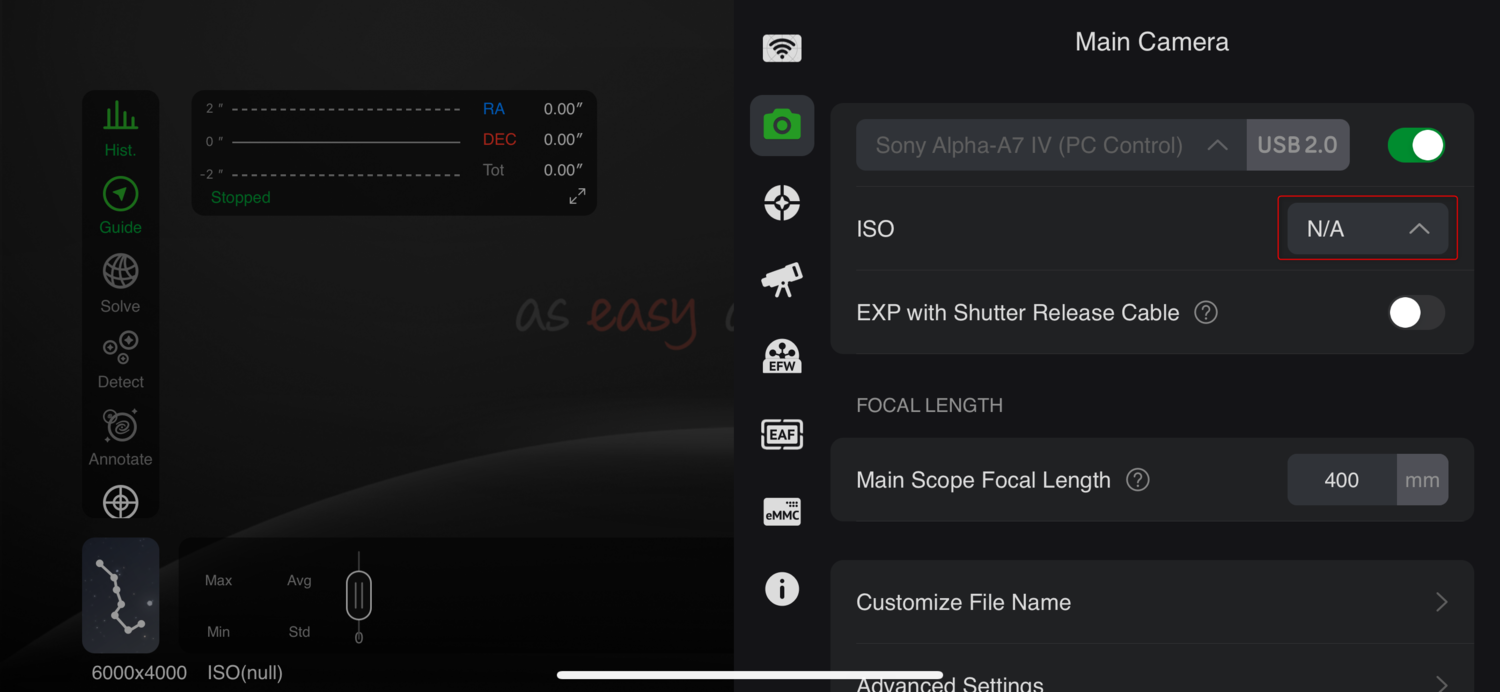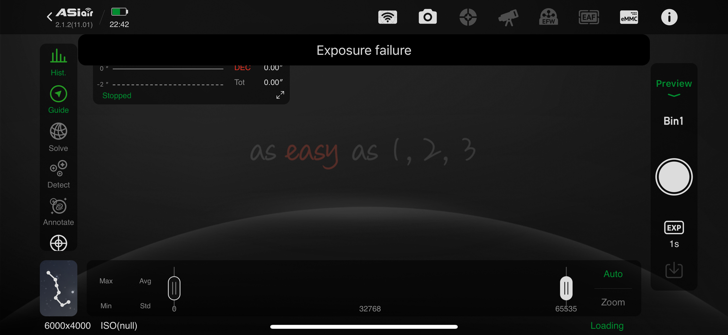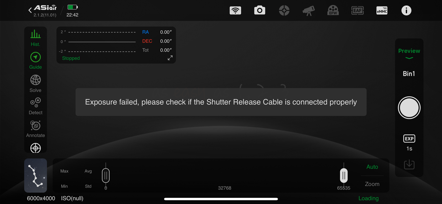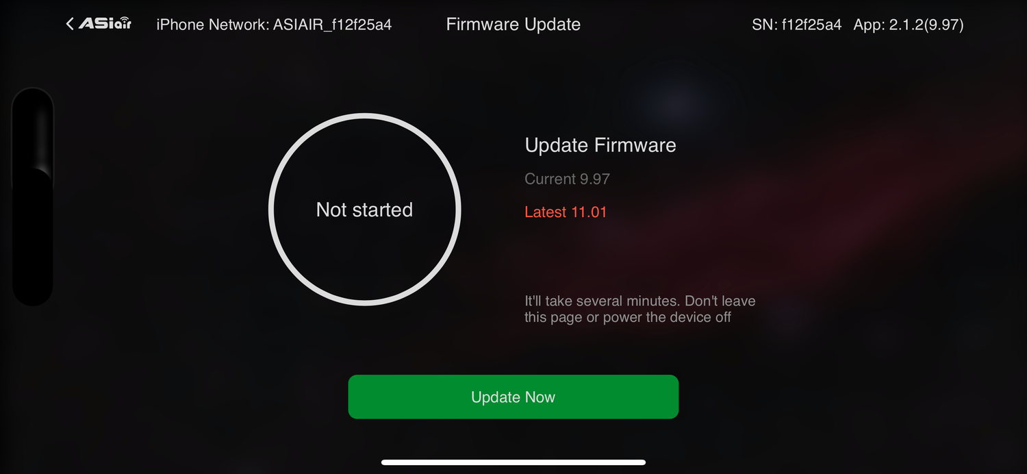 Bonjour à tous ! Visiblement en 1 semaine il c'est passé des choses ! Puisque .. plus rien ne semble fonctionner ! Ce soir .. Ciel parfais, je me déplace sur un site d'observation pas trop loin de chez moi... Mais une fois arrivé sur place l'Asiair m'impose une mise à jour (9.97 -> 11.01 pour l'Asiair et 2.1.2 pour le téléphone) , depuis ça ... Plus aucune possibilité de lancer la prise de photos, j'ai essayé de régler le soucis sur place mais impossible de trouver la solution, j'ai du rentrer à la maison sans aucun cliché 😪 Si je branche uniquement le câble USB (Asiar) / USB C (Sony A7IV) en décochant la case de câble shutter release -> Message "Exposure failure" Si je branche le USB (Asiar) / USB C (Sony A7IV) + le câble shutter release, en cochant la case dans les paramètres -> Message "Exposure failed, please check if the shutter release cable is connected properly" Dans aucun des 2 cas je ne peux choisir le temps d'exposition de la photo. Je trouve aussi bizarre que les ISO n'apparaissent plus, auparavant la valeur était figée, mais au moins elle était affichée. J'ai comme l'impression qu'ils n'arrivent plus du tout à communiquer en eux. Je pense que le soucis provient provient de la MaJ puisque, suite à ce sujet, j'avais fais des tests samedi dernier et tout fonctionnait Pour ceux qui utilisent aussi un appareil Sony avez-vous les mêmes types d'erreurs ? Je mets ici quelques images des-fois que vous identifiez une de mes erreurs Merci La mise à jours en question coté Asiair : (Impossible à passer outre) La mise à jours coté Apple : (Impossible pour moi de revenir sur une version antérieur) Le message lors de la connexion : Le message d'erreur 1 : Le message d'erreur 2 : Le fait que les ISO ne s'affiche plus : Mes paramètres sur l'appareil : -
