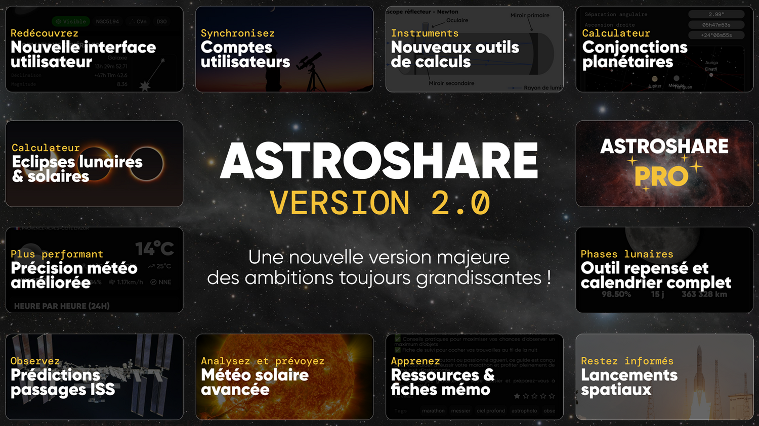 Bonjour à toutes et à tous 👋 Il y a quelques mois, j’avais posté ici pour vous présenter Astroshare, une application mobile d’astronomie que je développe depuis un bon moment (mon premier post est toujours dispo ici). Depuis, beaucoup de choses ont évolué, vos retours m’ont aidé à améliorer l’app, et aujourd’hui je suis très heureux de vous annoncer la sortie de la version 2 d’Astroshare 🚀 Quoi de neuf dans cette V2 ? Cette mise à jour est une vraie version majeure, avec : Une nouvelle interface utilisateur, repensée pour être plus claire et agréable L’arrivée des comptes utilisateurs, qui permettront d’avoir de nouvelles possibilités (davantage à venir dans les prochaines mises à jour !) Un outil de calculs d’éclipses lunaires & solaires → savoir précisément où et quand les observer Un outil de calcul des prochaines conjonctions planétaires Des prévisions météo plus précises et de nouvelles données dans le module de météo solaire Un outil de prédiction des passages de l’ISS au-dessus de votre position Un outil de phases lunaires totalement repensé De nouveaux outils de calculs astronomiques pour préparer vos observations et vos instruments 🔭 L’objectif reste le même : rendre l’astronomie simple et accessible, que vous soyez débutant ou passionné confirmé. Astroshare PRO Avec cette V2, j’introduis aussi Astroshare PRO, une version premium qui débloque des fonctionnalités avancées pour ceux qui veulent aller encore plus loin (outils d’aide à l’observation, suivi plus détaillé de certains phénomènes, etc.). Téléchargement La mise à jour est déjà disponible sur Android : 👉 https://play.google.com/store/apps/details?id=fr.eavagliano.astroshare 📱 Une sortie iOS est bien prévue, mais elle est malheureusement retardée. Plus d'infos Pour avoir plus d'infos je vous invite à consulter le nouveau site internet qui accompagne cette mise à jour ! 👉 https://astroshare.fr Contact Je suis aussi disponible par email si besoin 👉 contact@astroshare.fr N’hésitez pas à me dire ce que vous pensez de cette nouvelle version, et surtout à partager vos retours et suggestions : c’est grâce à ça qu’Astroshare évolue et s’améliore 🙏