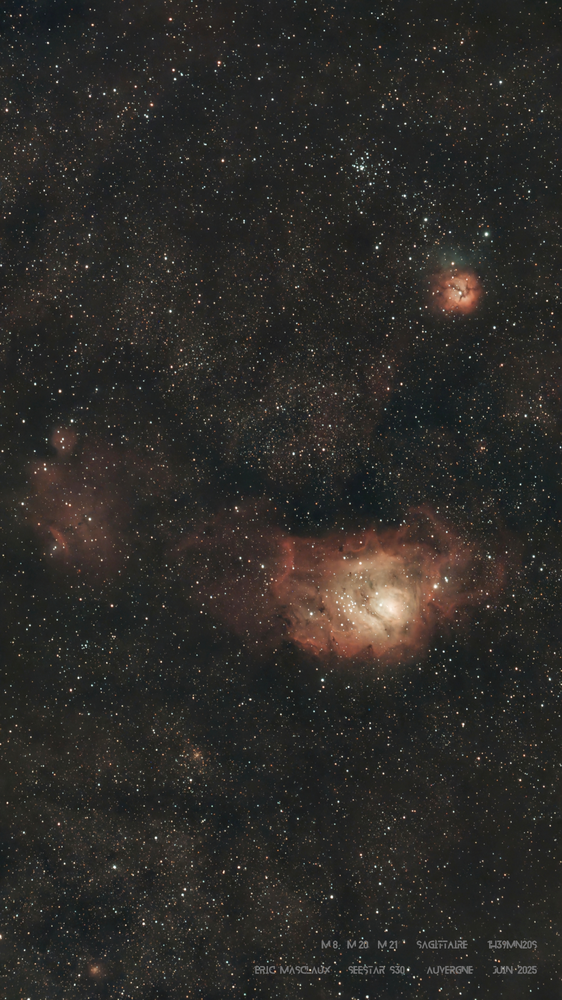 Le petit Seestar 30 millimètres à défaut d'apporter des détails permet de réaliser d'assez grands champs. Je l'ai donc pointé la nuit dernière dans le Sagittaire pour englober M8,M20 & M21 ainsi que pas mal d'autres objets. Le mode mosaïque a étté de mise en utilisant le champ maximal ce qui m'a valu pas mal de rejets même en mode équatorial avec des poses unitaires de 20 secondes. Au total à peine 1h40mn d'acquisitions traitées cette fois exclusivement avec Astrosurface. M8 M20 M21 et + (Sagittaire) Pradelles (Haute-Loire) 23 Juin 2025 Pas de Lune -dégagé Seestar S30 en mode équatorial Total d'acquisition de 1h39mn40secsec après rejets Pose unitaires de 20 secondes Traitement Astrosurface Eric "appiantiqua