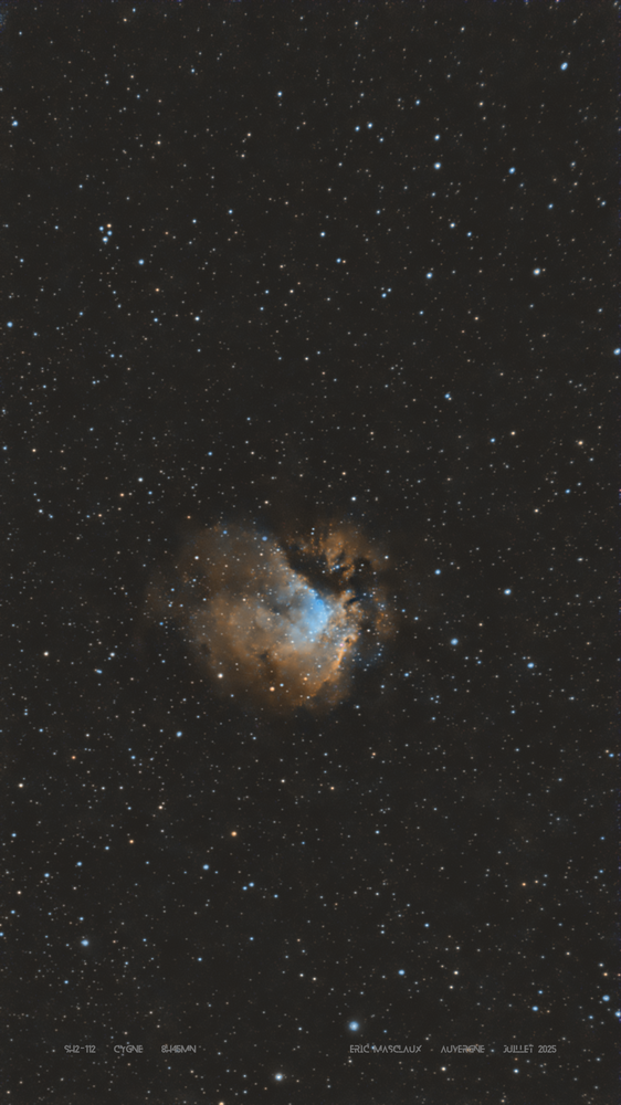 Bonjour à toutes et à tous, Comme de plus en plus souvent deux Seestar S50 en mode équatorial, avec cette fois des poses unitaires de 30 sec pour les deux instruments. Sh2-112 (Nébuleuse en émission - Cygne) Pradelles (Haute-Loire) 4 juillet 2025 Lune importante 70% - voiles en première partie de nuit L'astre ascendant est à 49° au dessus de l'horizon en début de session Seestar S50 x 2 Total d'acquisition de 8h45mn après rejets Traitement Siril , Astrosurface, Seti Cosmic Clarity & Gimp Je joins aussi une tentative en "palette Hubble" (autre cadrage & traitement) pour laquelle je mesuis efforcé de ne pas trop saturer les couleurs Eric "appiantiqua" La version "Palette Hubble"