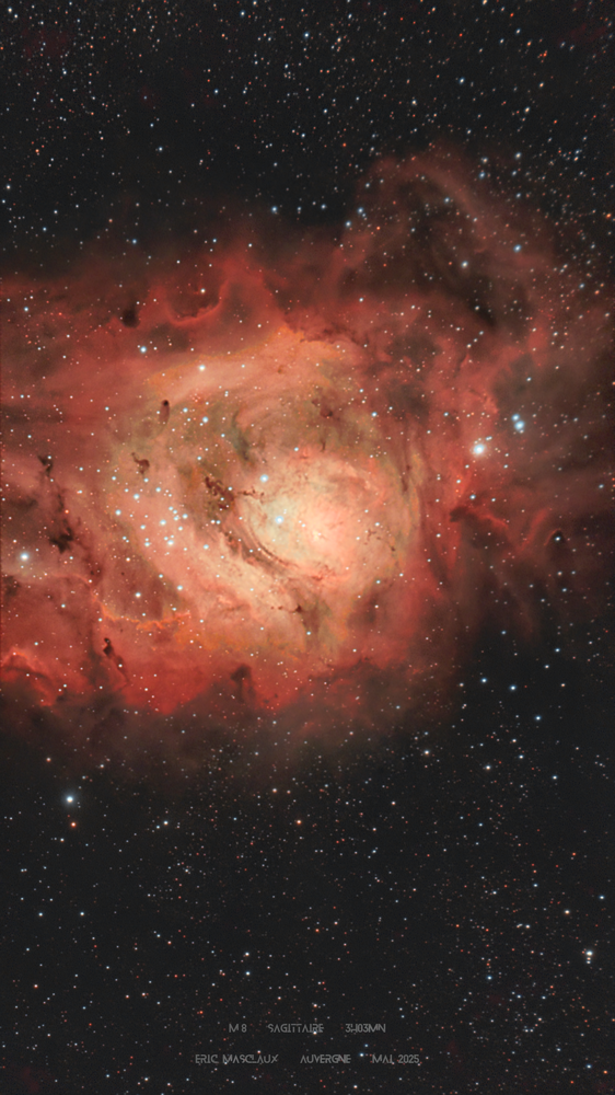 Bonjour à toutes et à tous, j'ai pointé mes deux Seestar S50 simultanément sur M 8 (sachant que le cadre de l'instrument, sur lequel je n'ai pas la main, tronque la cible ... je vais devoir y revenir en mode mosaïque) Au total j'ai récupéré 3h03mn de poses après rejets sous Siril. Je joins aussi l'image brute en sortie d'acquisitions. M 8 (nébuleuse diffuse - Sagittaire) Pradelles (Haute-Loire) 29 mai 2025 Pas de Lune- ciel dégagé Seestar S50 (x2) Total d'acquisition de 3h03mn après rejets Un des instruments avec des poses unitaires de 20 sec, l'autre à 30 sec Traitement Siril , Astrosurface, Seti Cosmic Clarity & Gimp Eric "appiantiqua"