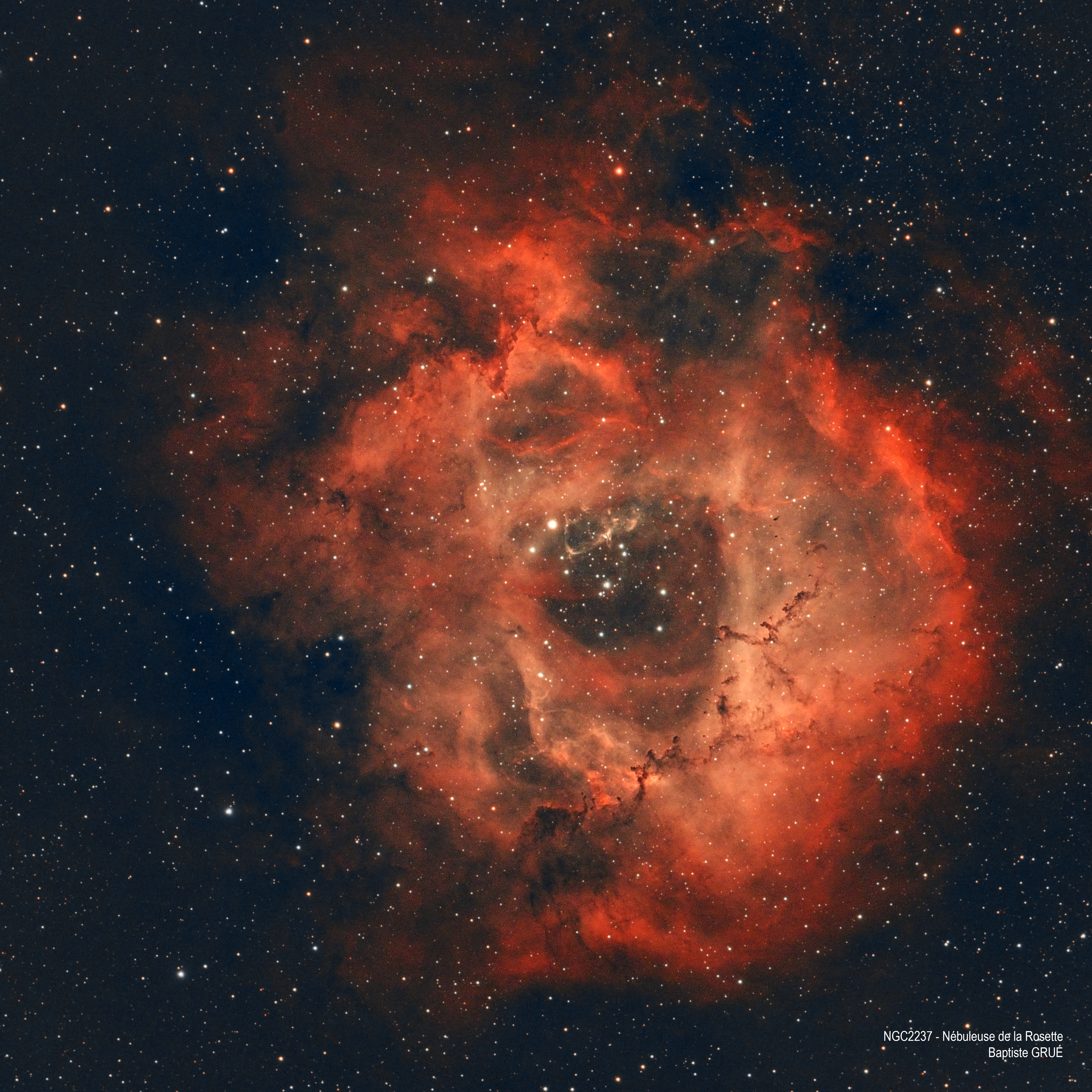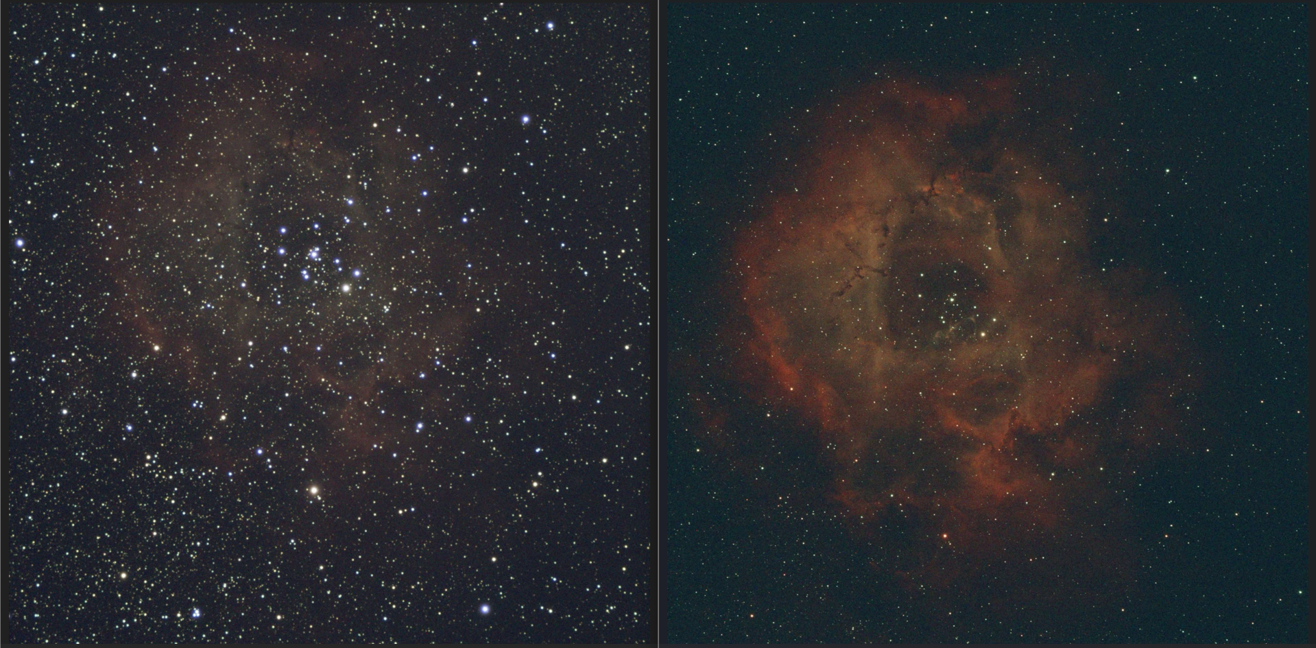 Chose promise, chose due 🙂 J'ai dernièrement travaillé sur NGC2237 - la nébuleuse de la Rosette. J'ai fait une première version (sans filtre) avec un problème de focus puis une 2nd version (toujours sans filtre) pour laquelle je n'étais pas mécontent. (je ne partagerai ces brouillons que sur demande 🤣) J'ai en suite reçu le filtre Altair Ha/OIII 6nm que j'ai pu essayer hier soir et Wahou ! Voici une capture d'un brute sans filtre (et sans lune) et un brute avec filtre (et avec lune) : J'ai donc revu mon pré-traitement (ajout d'un drizzle x2 dans Siril) et mon post-traitement sous photoshop et voici mon résultat : 60 x 180s (3h) 20 Dark / 100 Offset / 100 Flat 62ED Evolux/Réduc x0.90 ASI533mc Pro (-10°C et gain 101) Filtre Altair Ha/OIII 6nm Siril/Photoshop Je suis demandeur d'avis/conseils/remarques 😁 -