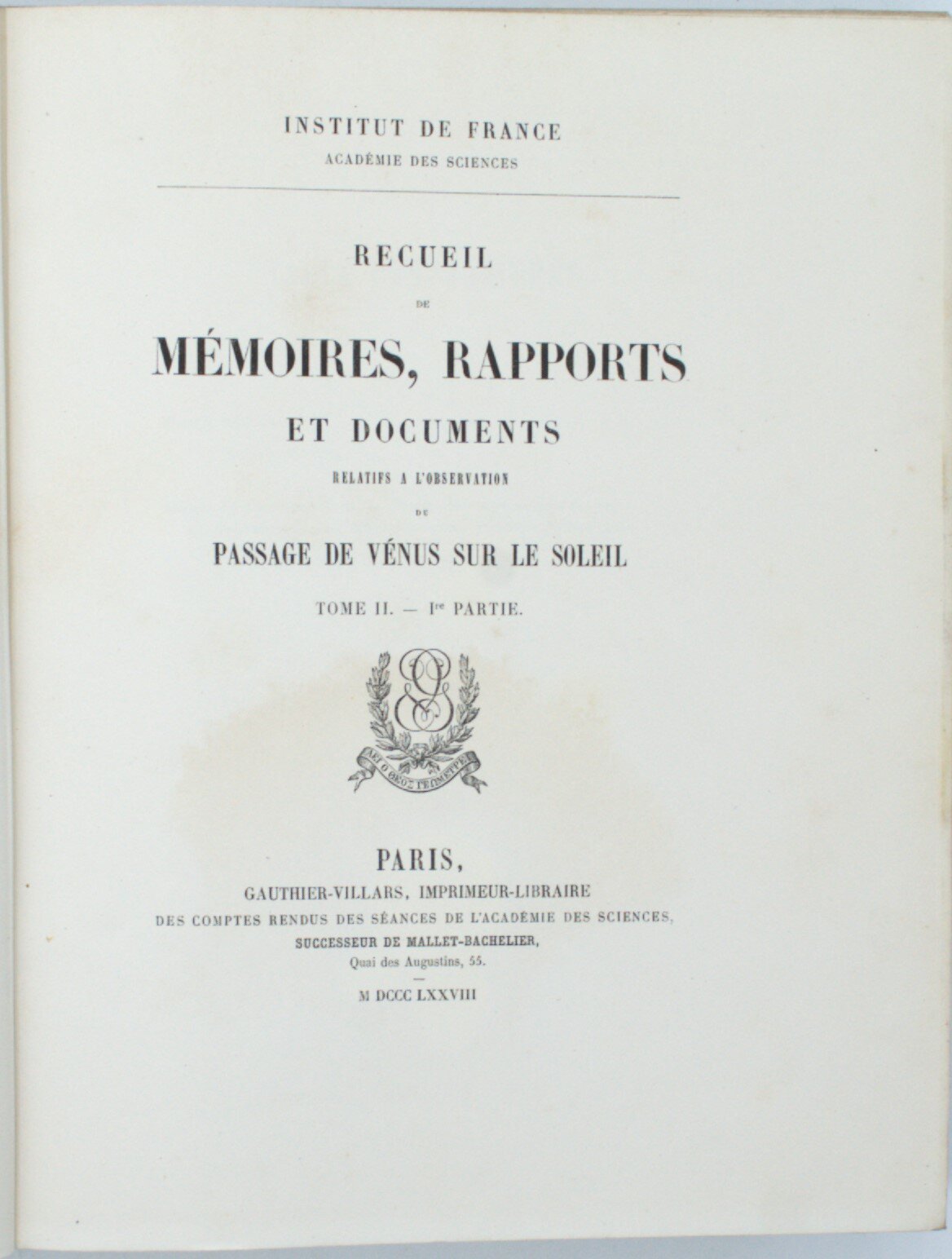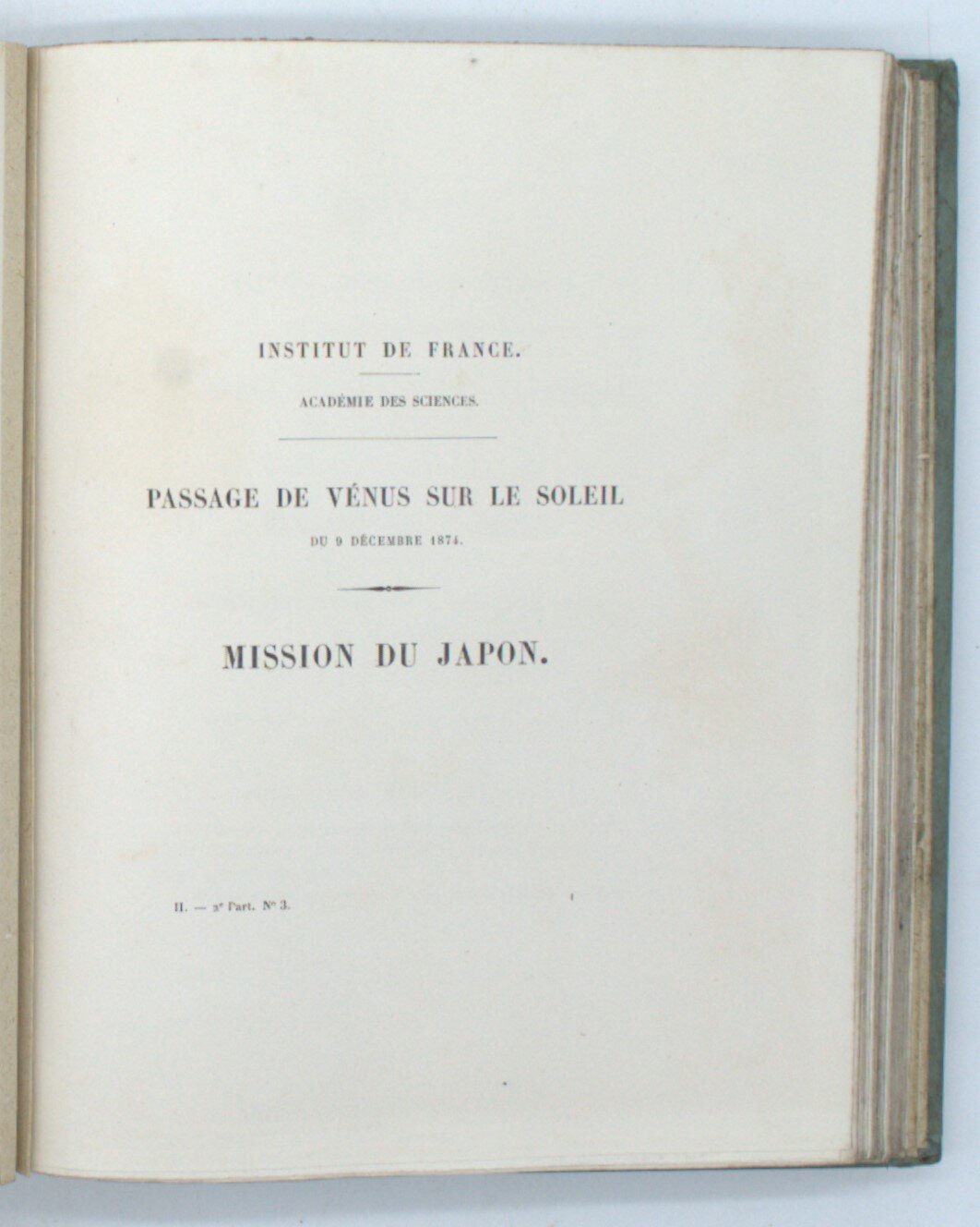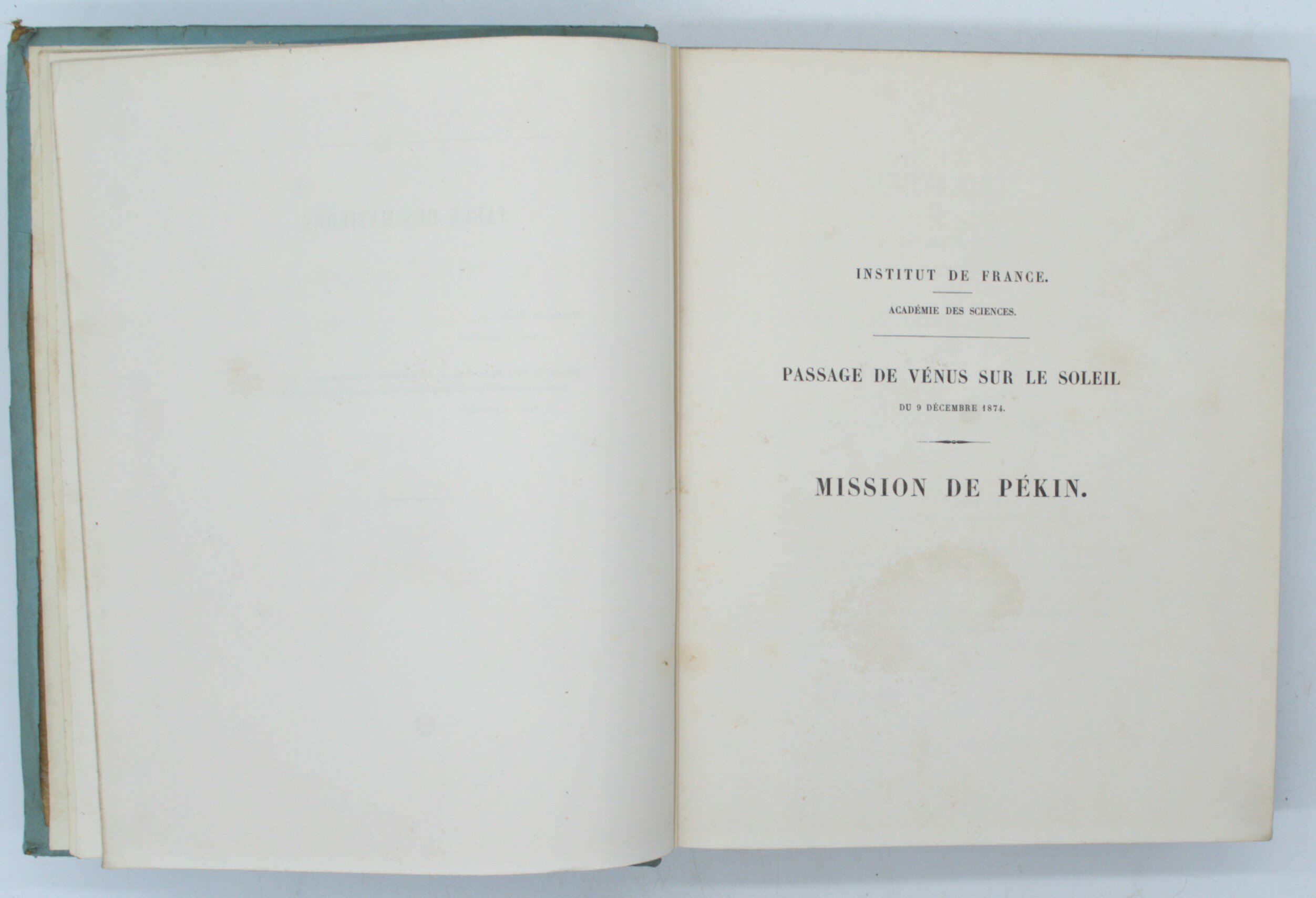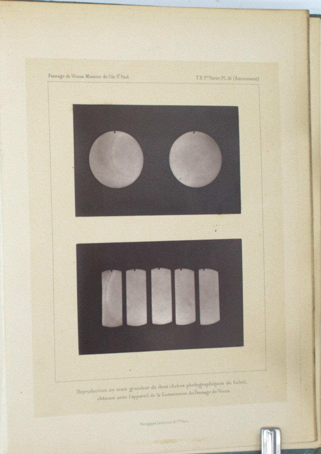 Firmin-Didot puis Gauthier-Villard, Paris, 1878-85, 5 volumes grands et forts in-4 (sur 8), tome 2, 1ere et 2eme partie relié cartonnage éditeur, tome 3, 1ere, 2eme partie et atlas, brochage éditeur, non coupé. Rare édition originale d'une des premières publications sur la photographie astronomique. 5 volumes sur 8, il manque ici la première partie en 2 volumes et l’annexe publiée en 1890. Tome II (2 volumes) relate les missions de Pékin, de Saint-Paul, du Japon, de Saïgon et de Nouméa ; illustré de 26 et 35 planches, dont des clichés photographiques originaux et plusieurs cartes et vues en lithographie, parmi lesquelles des représentations de l'Observatoire de Pékin. Tome III (2 volumes et 1 atlas) de la mission de l'île Campbell, île de l’océan Australe où la Mission pour l’observation du passage de Vénus se positionna, elle rendit ses recherches sur la géologie, la botanique, la zoologie : caractérisation des espèces terrestres, fluviatiles et marines et fouilles géologiques. Écrit par Henri Filhol (1843-1902), un scientifique français qui a servi comme naturaliste et médecin de l'expédition lors de l'expédition du Passage de Venus en 1874 vers l'île Campbell, à six cents kilomètres au sud de la Nouvelle-Zélande, composés de 8 planches, dont 2 cartes dépliantes et un atlas de 68 planches en lithographie d'études géologiques et zoologiques (55 planches de zoologie et 13 planches de géologie dont 10 d'observations microscopiques de roches, en couleurs et sous serpentes légendées).