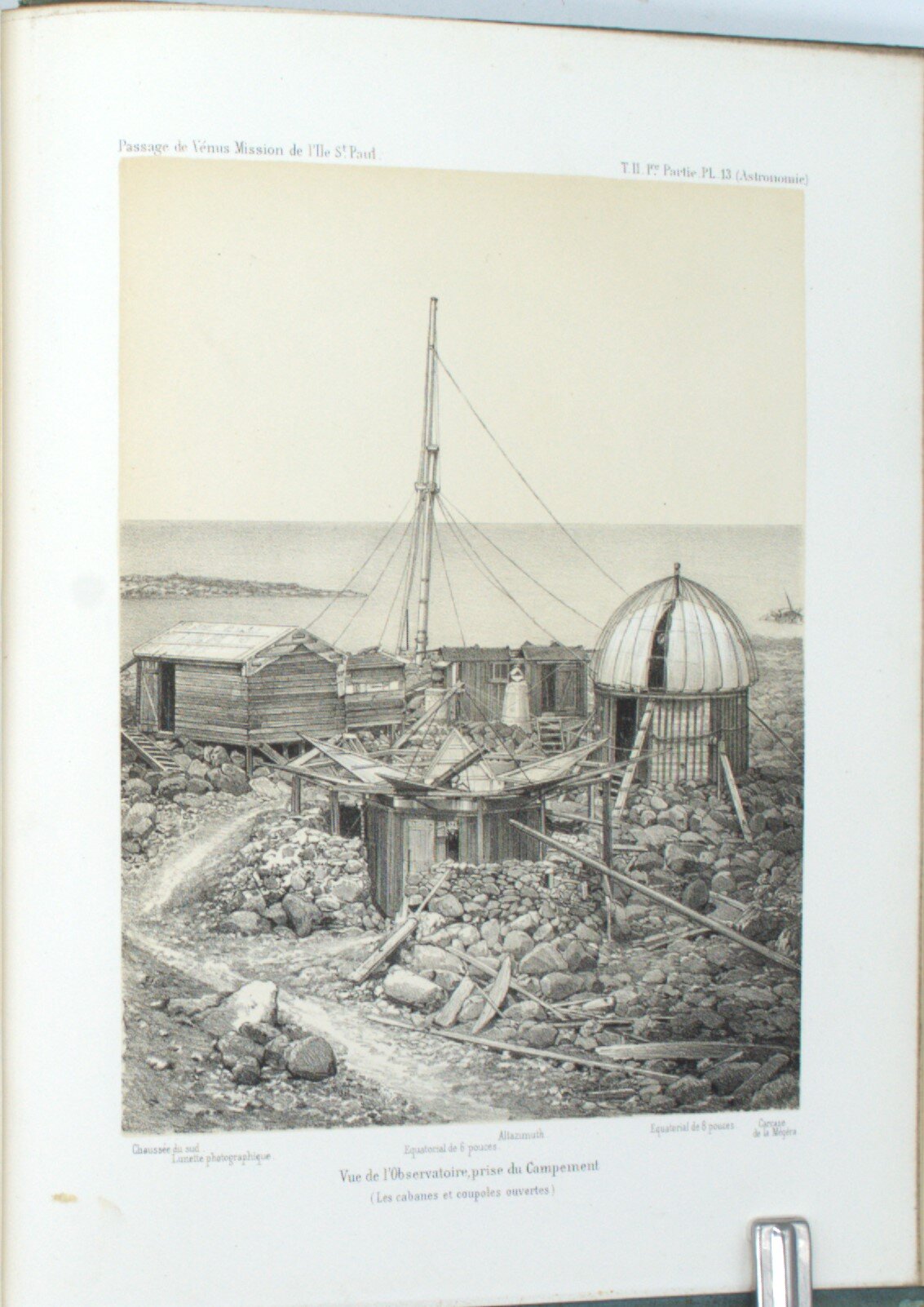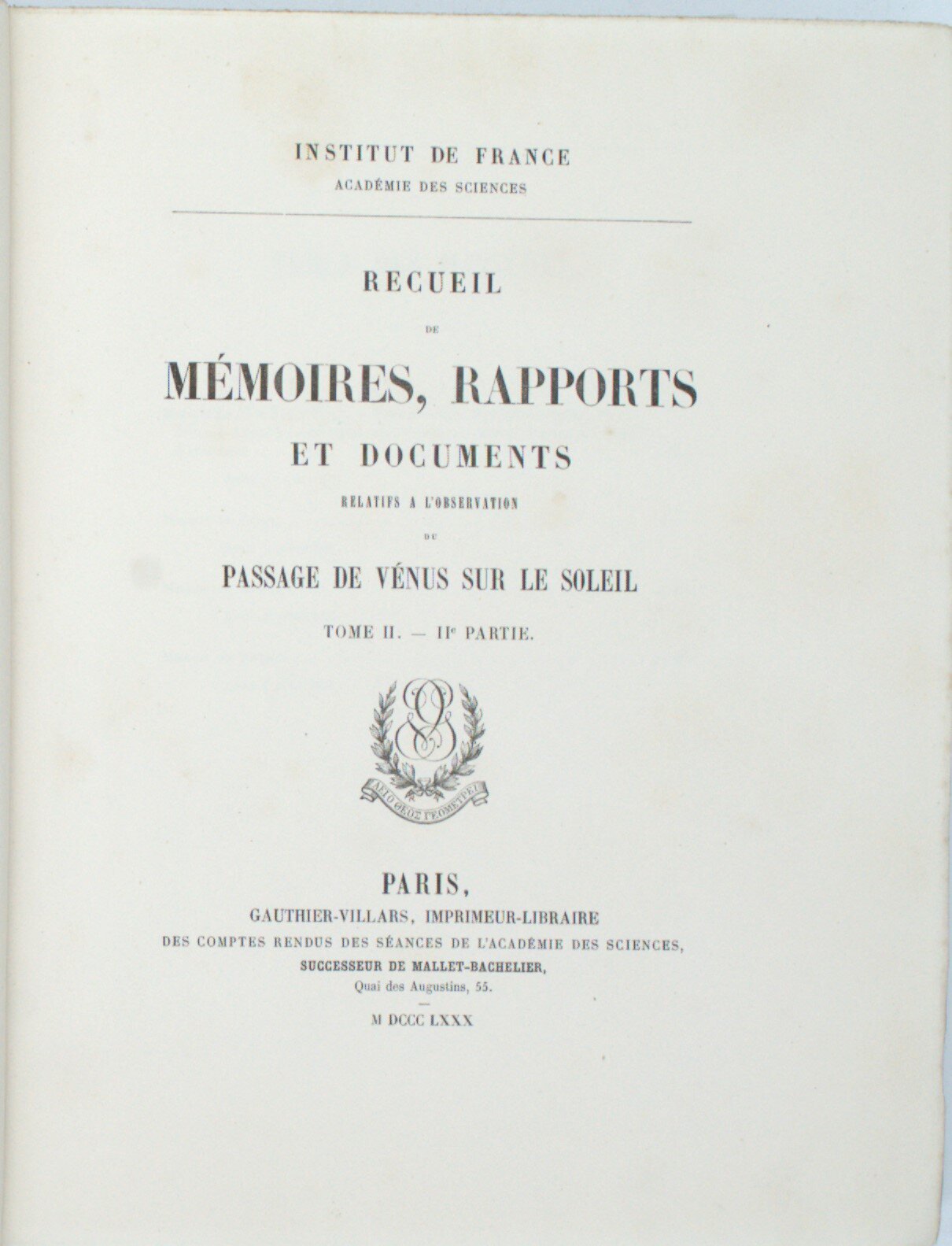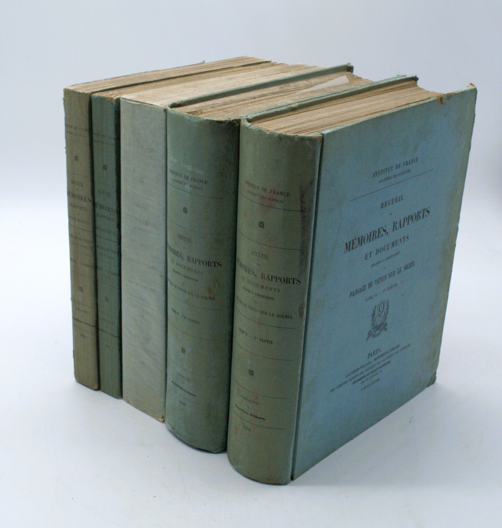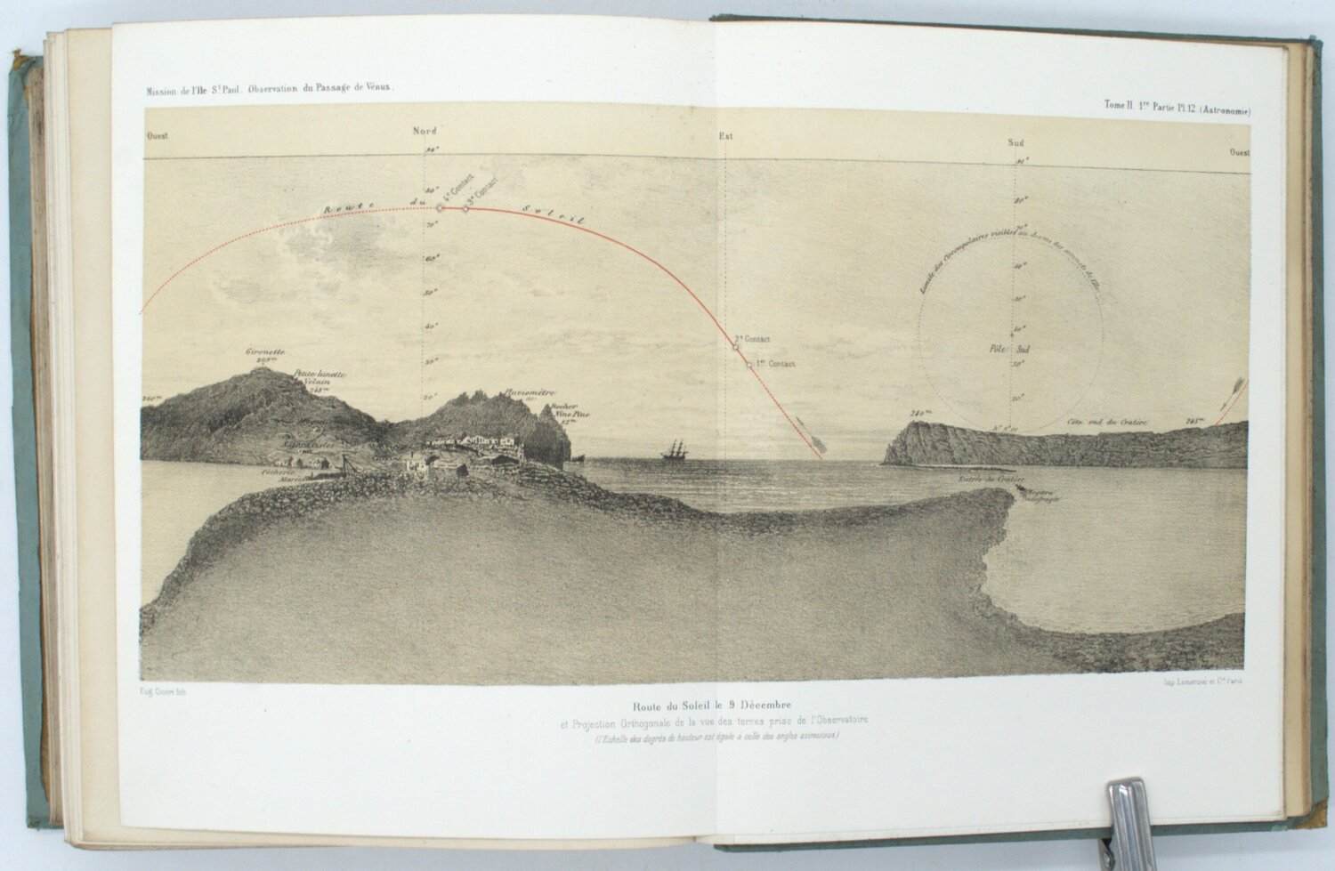 Firmin-Didot puis Gauthier-Villard, Paris, 1878-85, 5 volumes grands et forts in-4 (sur 8), tome 2, 1ere et 2eme partie relié cartonnage éditeur, tome 3, 1ere, 2eme partie et atlas, brochage éditeur, non coupé. Rare édition originale d'une des premières publications sur la photographie astronomique. 5 volumes sur 8, il manque ici la première partie en 2 volumes et l’annexe publiée en 1890. Tome II (2 volumes) relate les missions de Pékin, de Saint-Paul, du Japon, de Saïgon et de Nouméa ; illustré de 26 et 35 planches, dont des clichés photographiques originaux et plusieurs cartes et vues en lithographie, parmi lesquelles des représentations de l'Observatoire de Pékin. Tome III (2 volumes et 1 atlas) de la mission de l'île Campbell, île de l’océan Australe où la Mission pour l’observation du passage de Vénus se positionna, elle rendit ses recherches sur la géologie, la botanique, la zoologie : caractérisation des espèces terrestres, fluviatiles et marines et fouilles géologiques. Écrit par Henri Filhol (1843-1902), un scientifique français qui a servi comme naturaliste et médecin de l'expédition lors de l'expédition du Passage de Venus en 1874 vers l'île Campbell, à six cents kilomètres au sud de la Nouvelle-Zélande, composés de 8 planches, dont 2 cartes dépliantes et un atlas de 68 planches en lithographie d'études géologiques et zoologiques (55 planches de zoologie et 13 planches de géologie dont 10 d'observations microscopiques de roches, en couleurs et sous serpentes légendées).