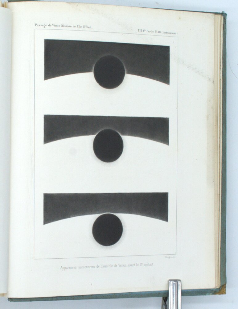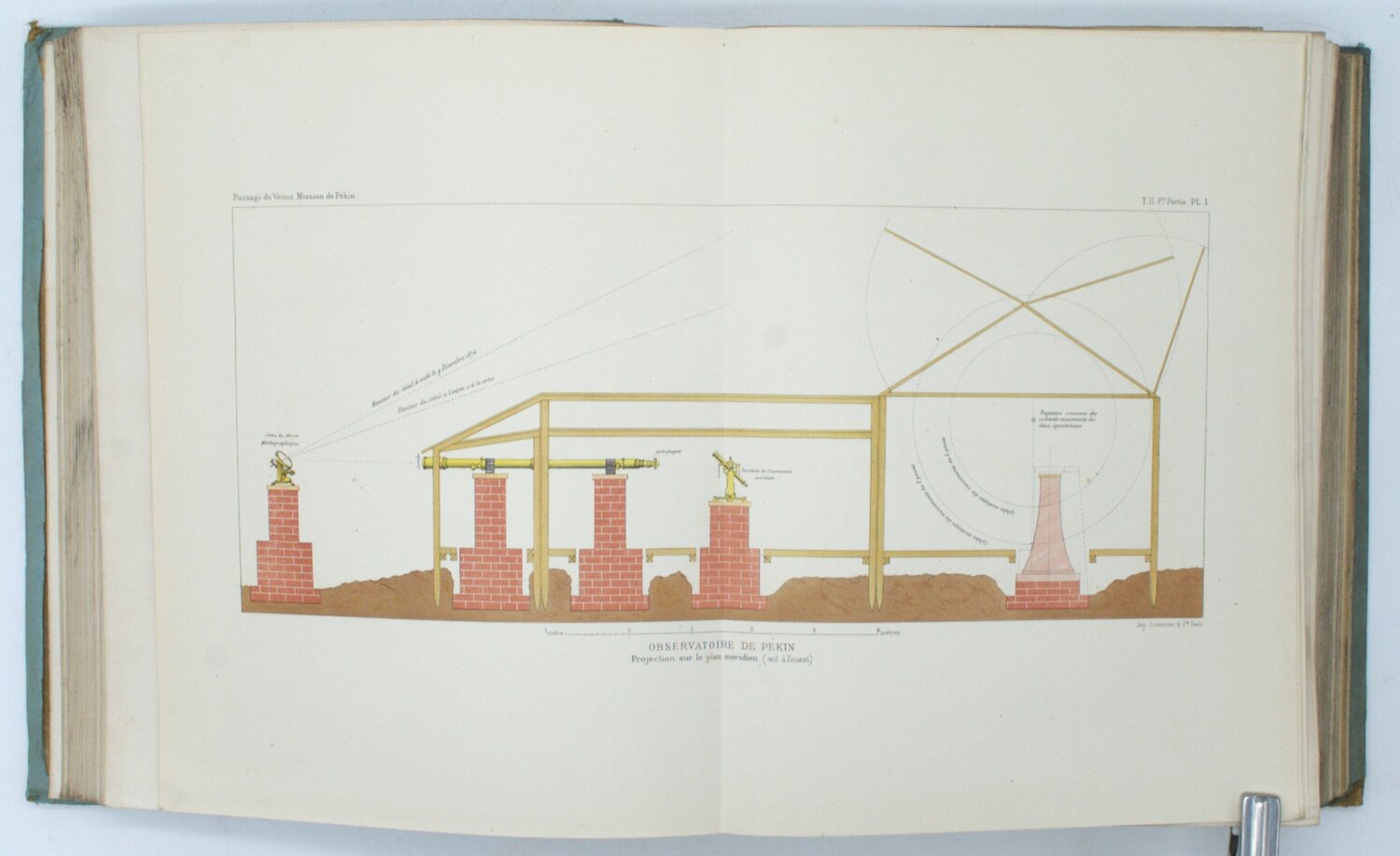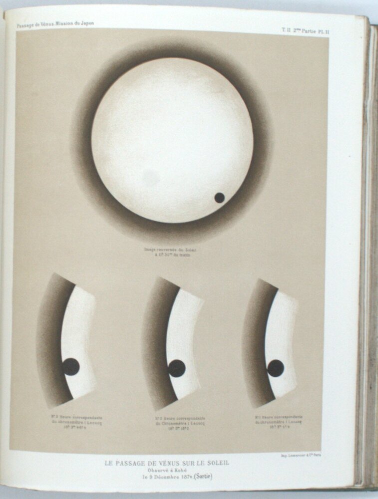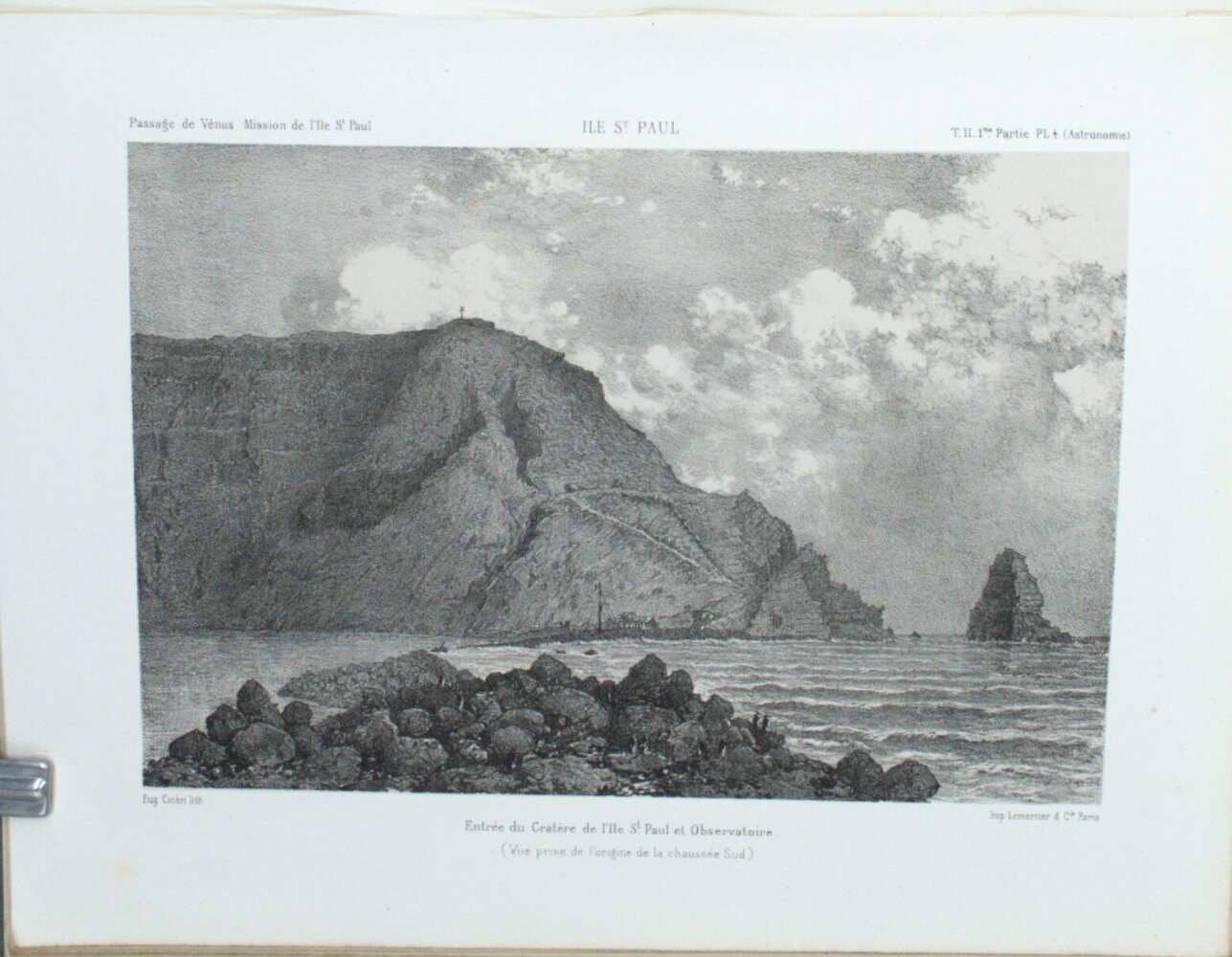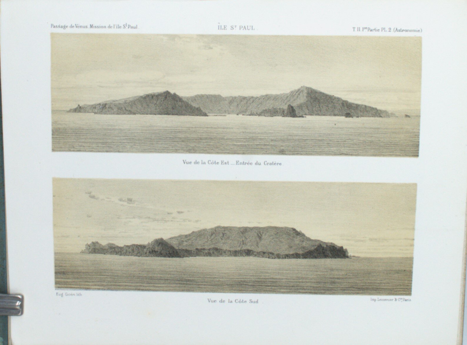 Firmin-Didot puis Gauthier-Villard, Paris, 1878-85, 5 volumes grands et forts in-4 (sur 8), tome 2, 1ere et 2eme partie relié cartonnage éditeur, tome 3, 1ere, 2eme partie et atlas, brochage éditeur, non coupé. Rare édition originale d'une des premières publications sur la photographie astronomique. 5 volumes sur 8, il manque ici la première partie en 2 volumes et l’annexe publiée en 1890. Tome II (2 volumes) relate les missions de Pékin, de Saint-Paul, du Japon, de Saïgon et de Nouméa ; illustré de 26 et 35 planches, dont des clichés photographiques originaux et plusieurs cartes et vues en lithographie, parmi lesquelles des représentations de l'Observatoire de Pékin. Tome III (2 volumes et 1 atlas) de la mission de l'île Campbell, île de l’océan Australe où la Mission pour l’observation du passage de Vénus se positionna, elle rendit ses recherches sur la géologie, la botanique, la zoologie : caractérisation des espèces terrestres, fluviatiles et marines et fouilles géologiques. Écrit par Henri Filhol (1843-1902), un scientifique français qui a servi comme naturaliste et médecin de l'expédition lors de l'expédition du Passage de Venus en 1874 vers l'île Campbell, à six cents kilomètres au sud de la Nouvelle-Zélande, composés de 8 planches, dont 2 cartes dépliantes et un atlas de 68 planches en lithographie d'études géologiques et zoologiques (55 planches de zoologie et 13 planches de géologie dont 10 d'observations microscopiques de roches, en couleurs et sous serpentes légendées).