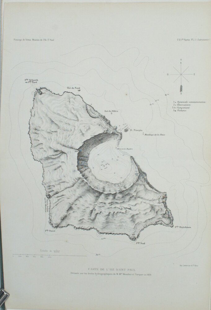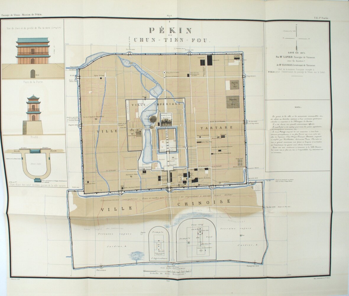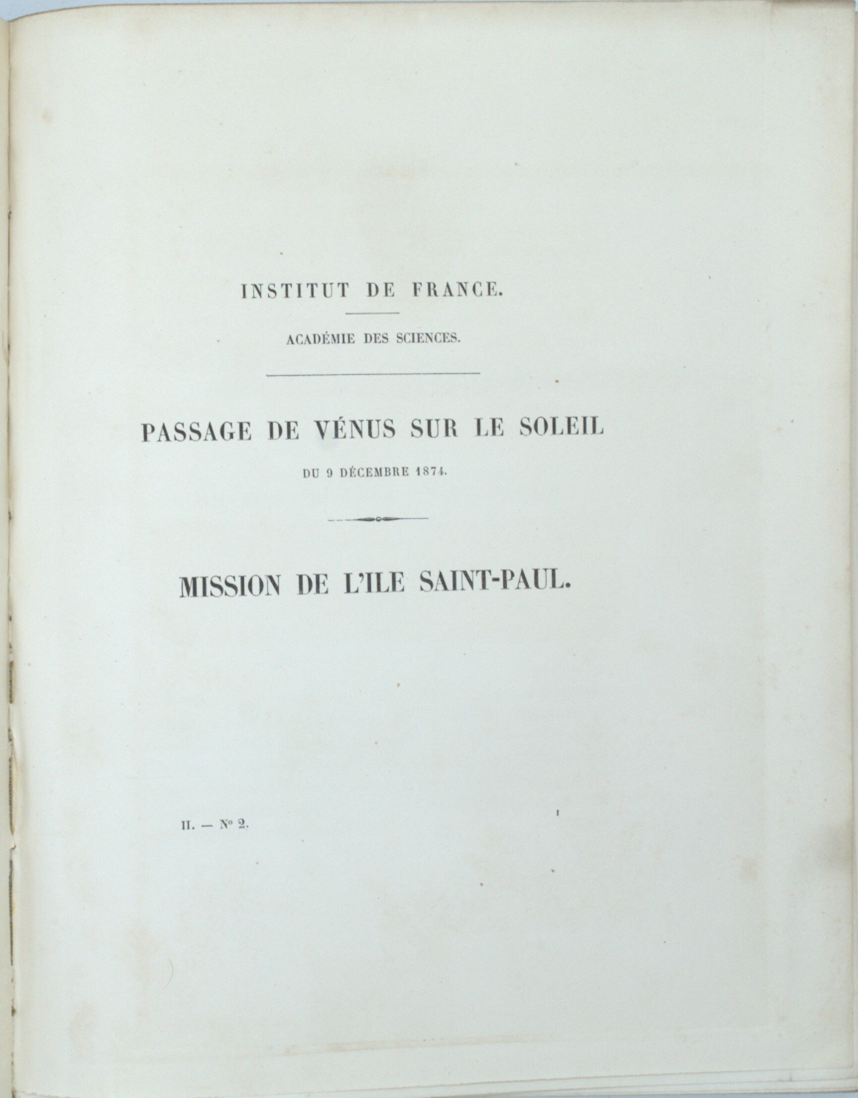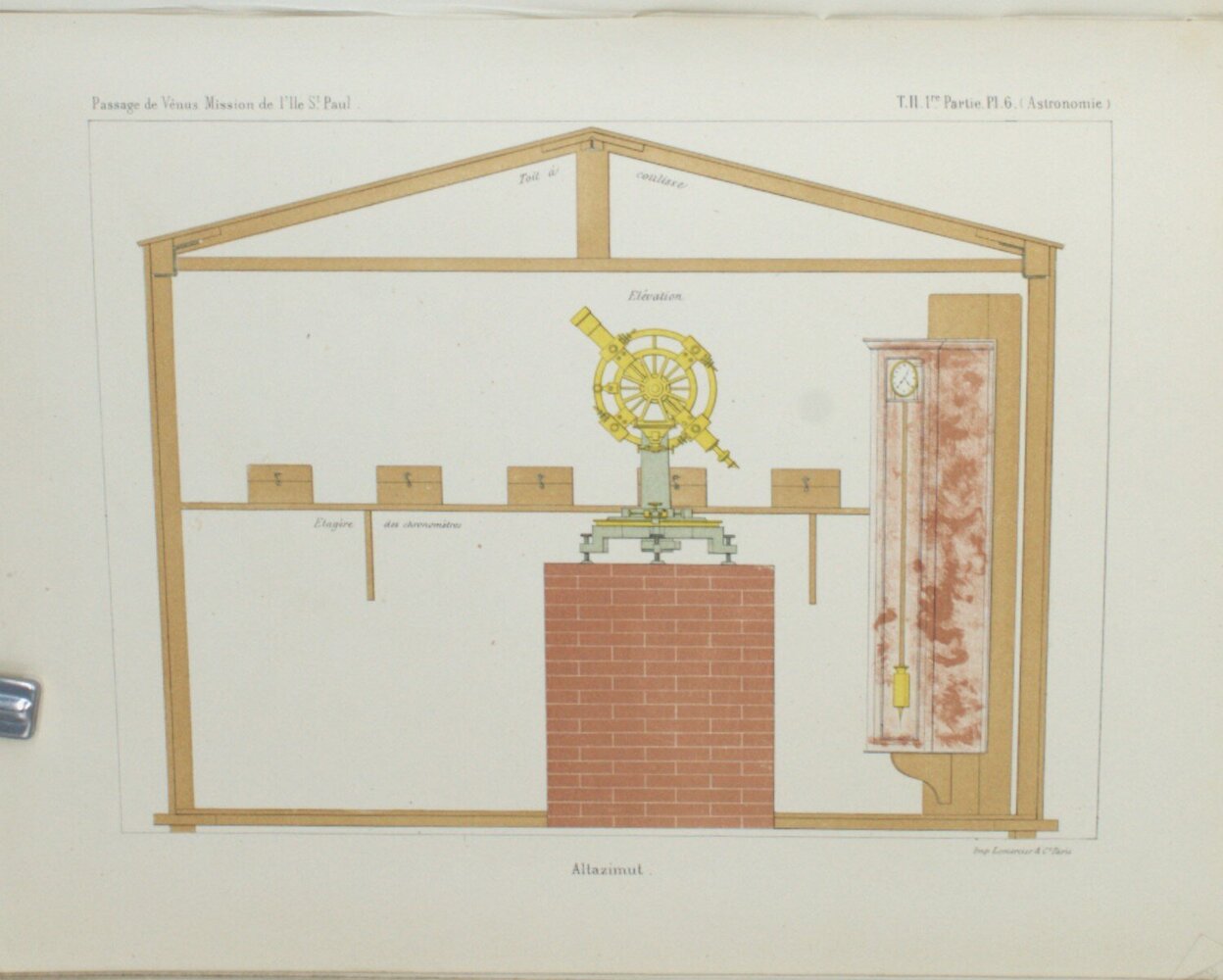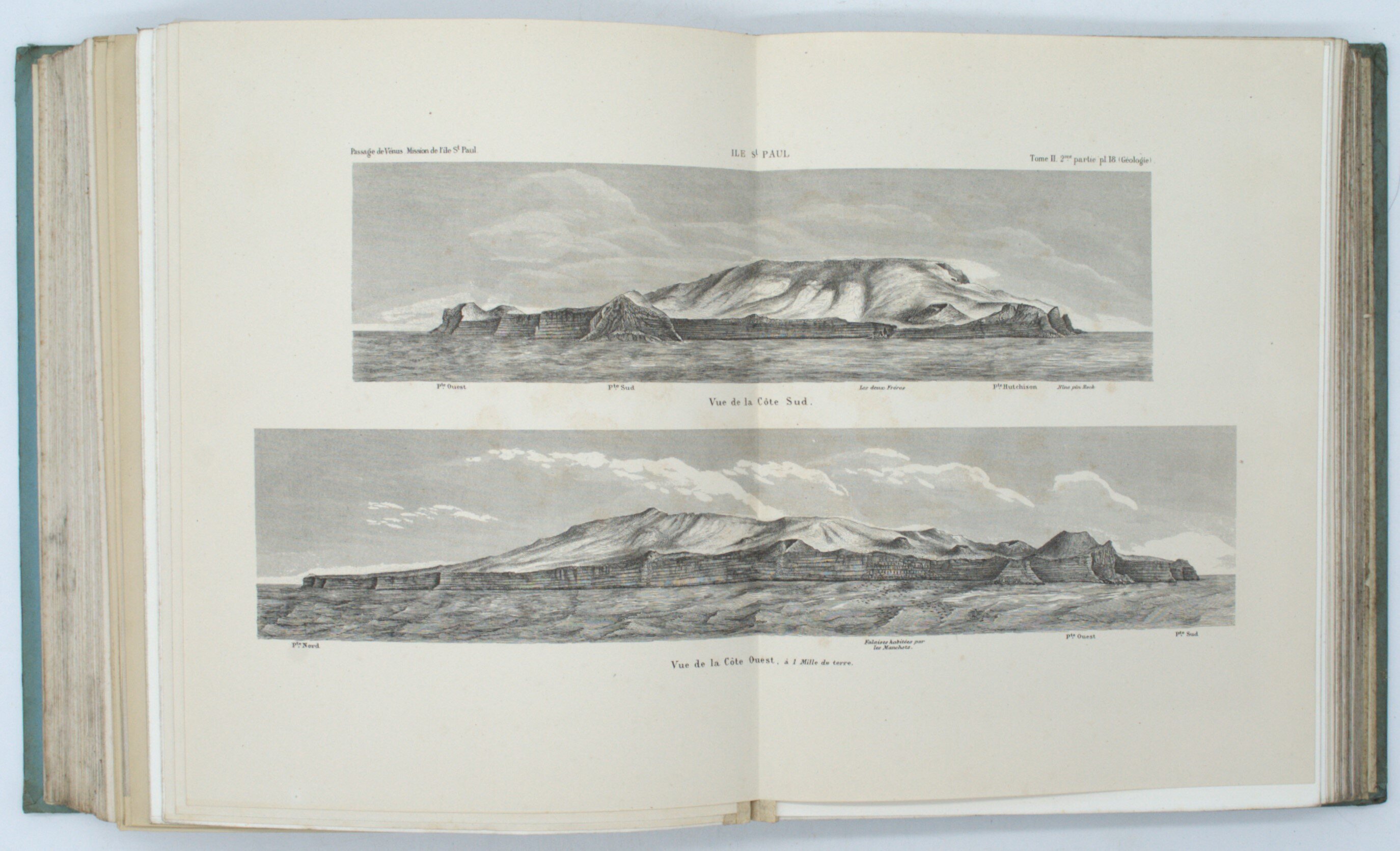 Firmin-Didot puis Gauthier-Villard, Paris, 1878-85, 5 volumes grands et forts in-4 (sur 8), tome 2, 1ere et 2eme partie relié cartonnage éditeur, tome 3, 1ere, 2eme partie et atlas, brochage éditeur, non coupé. Rare édition originale d'une des premières publications sur la photographie astronomique. 5 volumes sur 8, il manque ici la première partie en 2 volumes et l’annexe publiée en 1890. Tome II (2 volumes) relate les missions de Pékin, de Saint-Paul, du Japon, de Saïgon et de Nouméa ; illustré de 26 et 35 planches, dont des clichés photographiques originaux et plusieurs cartes et vues en lithographie, parmi lesquelles des représentations de l'Observatoire de Pékin. Tome III (2 volumes et 1 atlas) de la mission de l'île Campbell, île de l’océan Australe où la Mission pour l’observation du passage de Vénus se positionna, elle rendit ses recherches sur la géologie, la botanique, la zoologie : caractérisation des espèces terrestres, fluviatiles et marines et fouilles géologiques. Écrit par Henri Filhol (1843-1902), un scientifique français qui a servi comme naturaliste et médecin de l'expédition lors de l'expédition du Passage de Venus en 1874 vers l'île Campbell, à six cents kilomètres au sud de la Nouvelle-Zélande, composés de 8 planches, dont 2 cartes dépliantes et un atlas de 68 planches en lithographie d'études géologiques et zoologiques (55 planches de zoologie et 13 planches de géologie dont 10 d'observations microscopiques de roches, en couleurs et sous serpentes légendées).