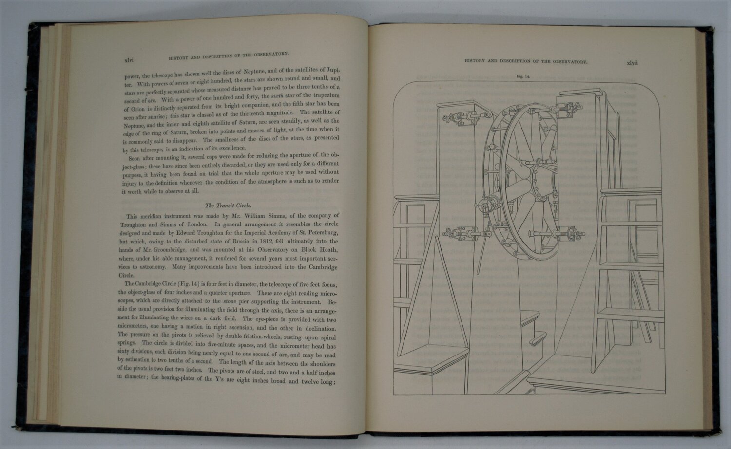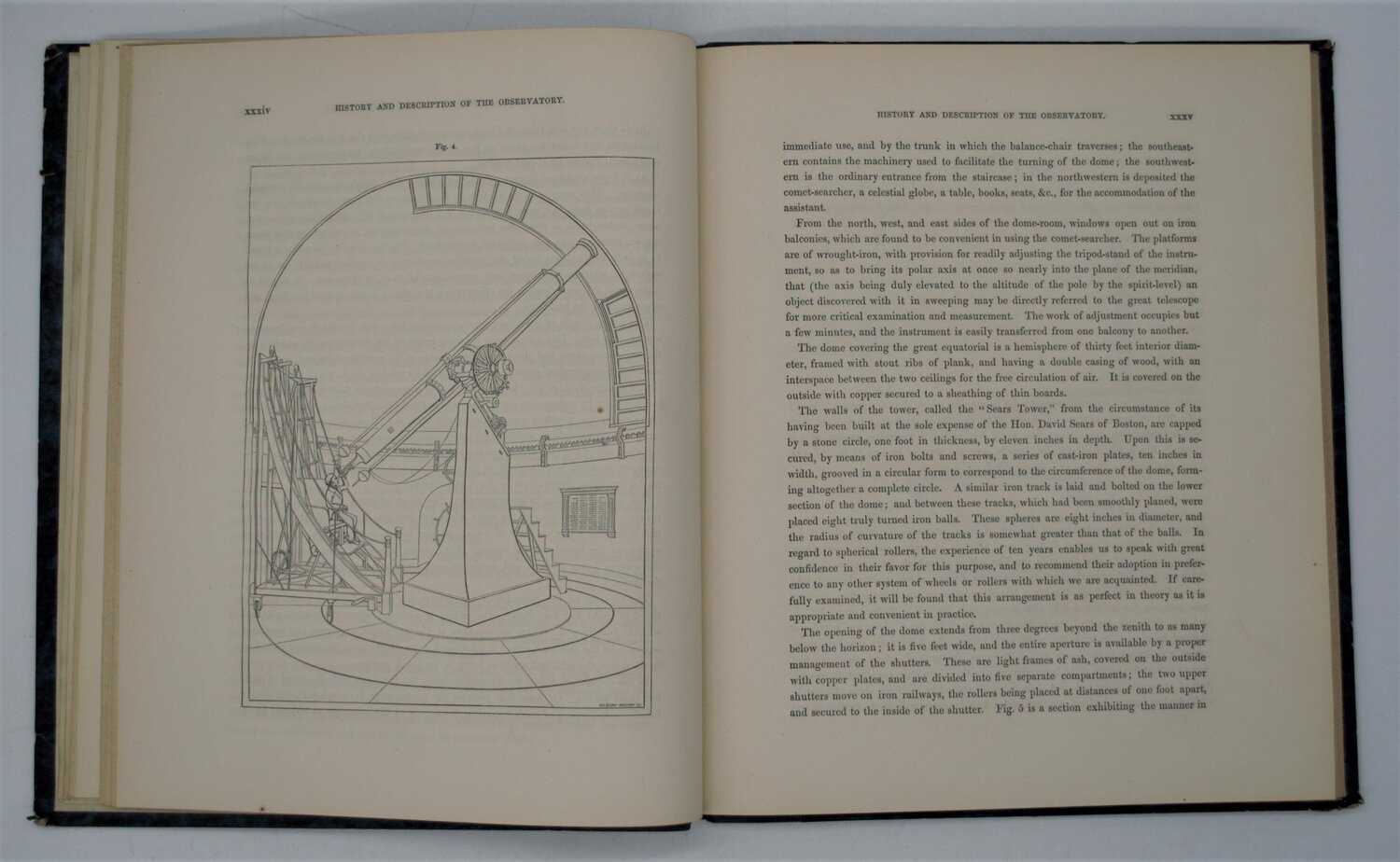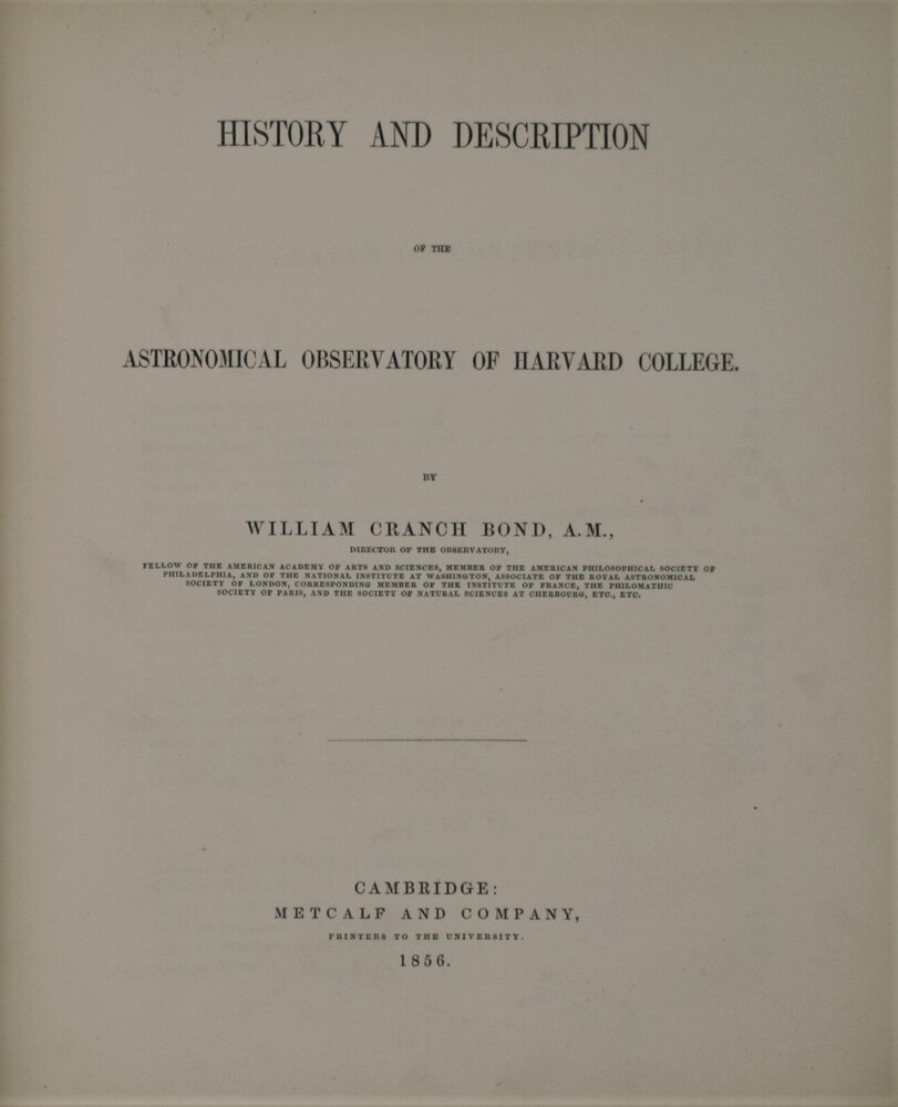 BOND ,Cranch William Annals of the Astronomical Observatory of Harvard College. Vol. I - Part I History and Description of the Astronomical Observatory of Harvard College Cambridge , Metcalf and company , 1856 , in-4° (285x245) , CXCI pp., bound half contempary cloth , illustrated with 19 figures ,description of the famous observatory with the machines , mission , statues , contributors , letters , reports, etc. William Cranch Bond, né à Portland (Maine) le 9 septembre 1789 et mort à Cambridge (Massachusetts) le 29 janvier 1859, est un astronome américain. Bien qu'il n'ait jamais eu d'éducation formelle, il devient le premier directeur du Harvard College Observatory, où il étudie Saturne et explique la nébuleuse d'Andromède. En 1848 il découvre, avec son fils George Phillips Bond, Hypérion, un satellite de Saturne qui a la particularité de ressembler à une cacahuète. William Lassell fait indépendamment la même découverte. Le père et le fils sont des pionniers de l'astrophotographie, en prenant le premier daguerréotype de l'étoile Véga en 1850 ainsi que la première photographie de la Lune. Jules Verne le mentionne dans son roman De la Terre à la Lune .