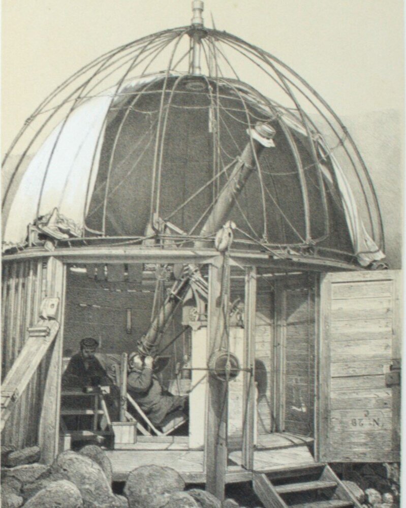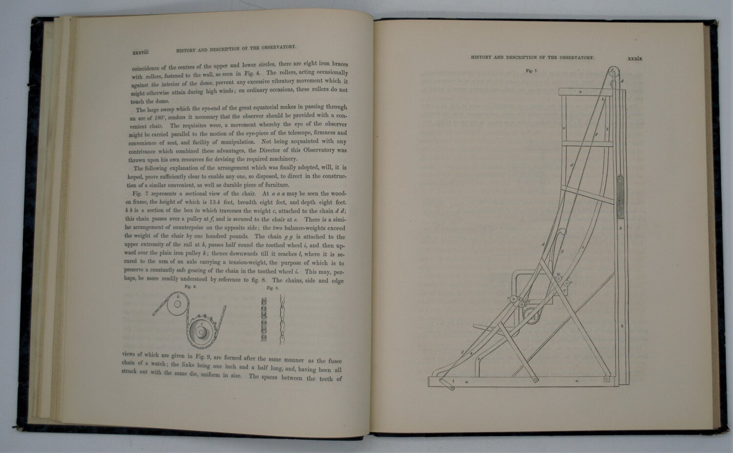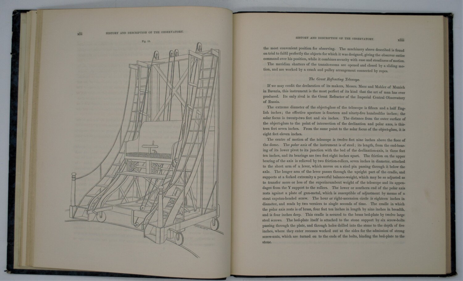 BOND ,Cranch William Annals of the Astronomical Observatory of Harvard College. Vol. I - Part I History and Description of the Astronomical Observatory of Harvard College Cambridge , Metcalf and company , 1856 , in-4° (285x245) , CXCI pp., bound half contempary cloth , illustrated with 19 figures ,description of the famous observatory with the machines , mission , statues , contributors , letters , reports, etc. William Cranch Bond, né à Portland (Maine) le 9 septembre 1789 et mort à Cambridge (Massachusetts) le 29 janvier 1859, est un astronome américain. Bien qu'il n'ait jamais eu d'éducation formelle, il devient le premier directeur du Harvard College Observatory, où il étudie Saturne et explique la nébuleuse d'Andromède. En 1848 il découvre, avec son fils George Phillips Bond, Hypérion, un satellite de Saturne qui a la particularité de ressembler à une cacahuète. William Lassell fait indépendamment la même découverte. Le père et le fils sont des pionniers de l'astrophotographie, en prenant le premier daguerréotype de l'étoile Véga en 1850 ainsi que la première photographie de la Lune. Jules Verne le mentionne dans son roman De la Terre à la Lune .