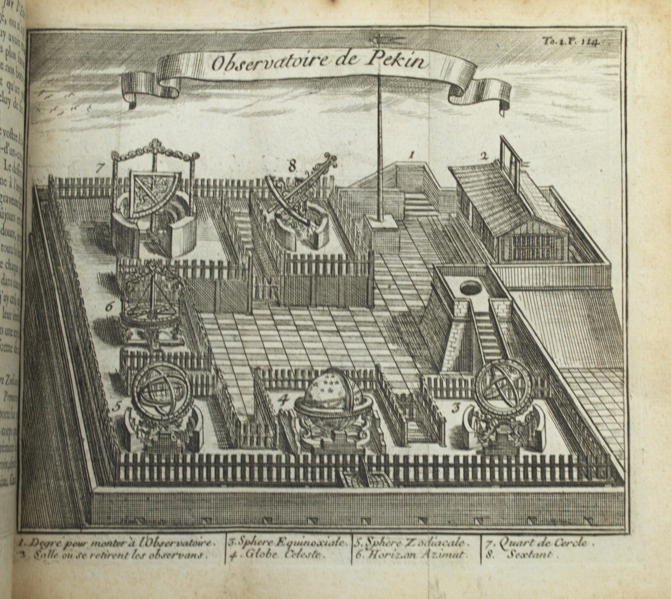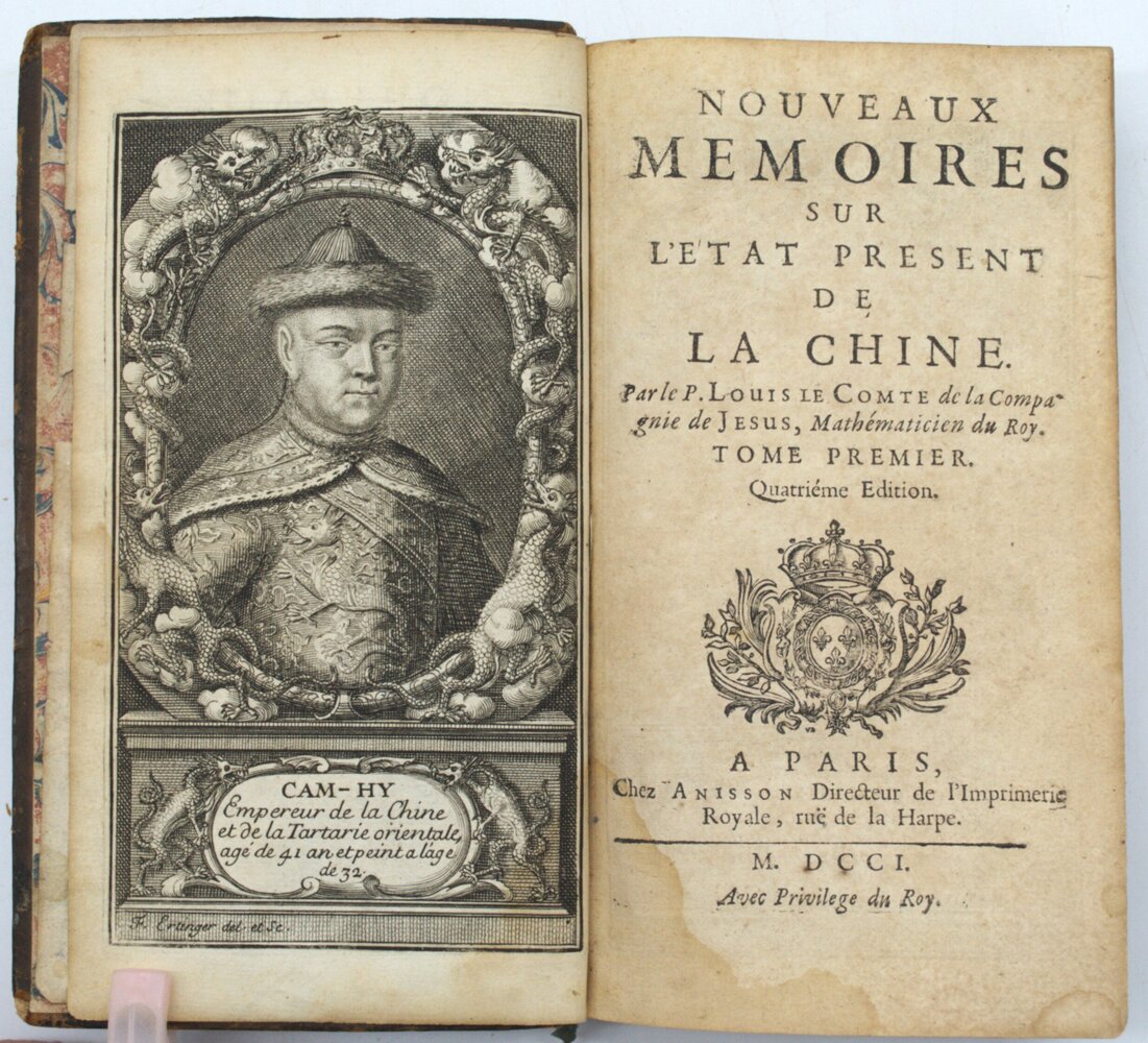 Paris, Chez Jean Anisson, 1701, 2 vol., in-12 Le Comte, jésuite, astronome et géographe était un des 6 missionnaires qui s'embarquèrent pour la Chine sous J. de Fontaney. Ning-po fut atteint en 1687 et Pékin en 1688. L. C. se rendit au Shan-si et à Shen- si... Ses Nouveaux Mémoires, un recueil de lettres, décrivent le voyage au Siam et à Pékin. Outre le portrait de l'empereur, les cuivres montrent également le trône impérial, des Chinois en costume national, des instruments, un plan et une vue de l'observatoire construit par les Jésuites à Pékin.-