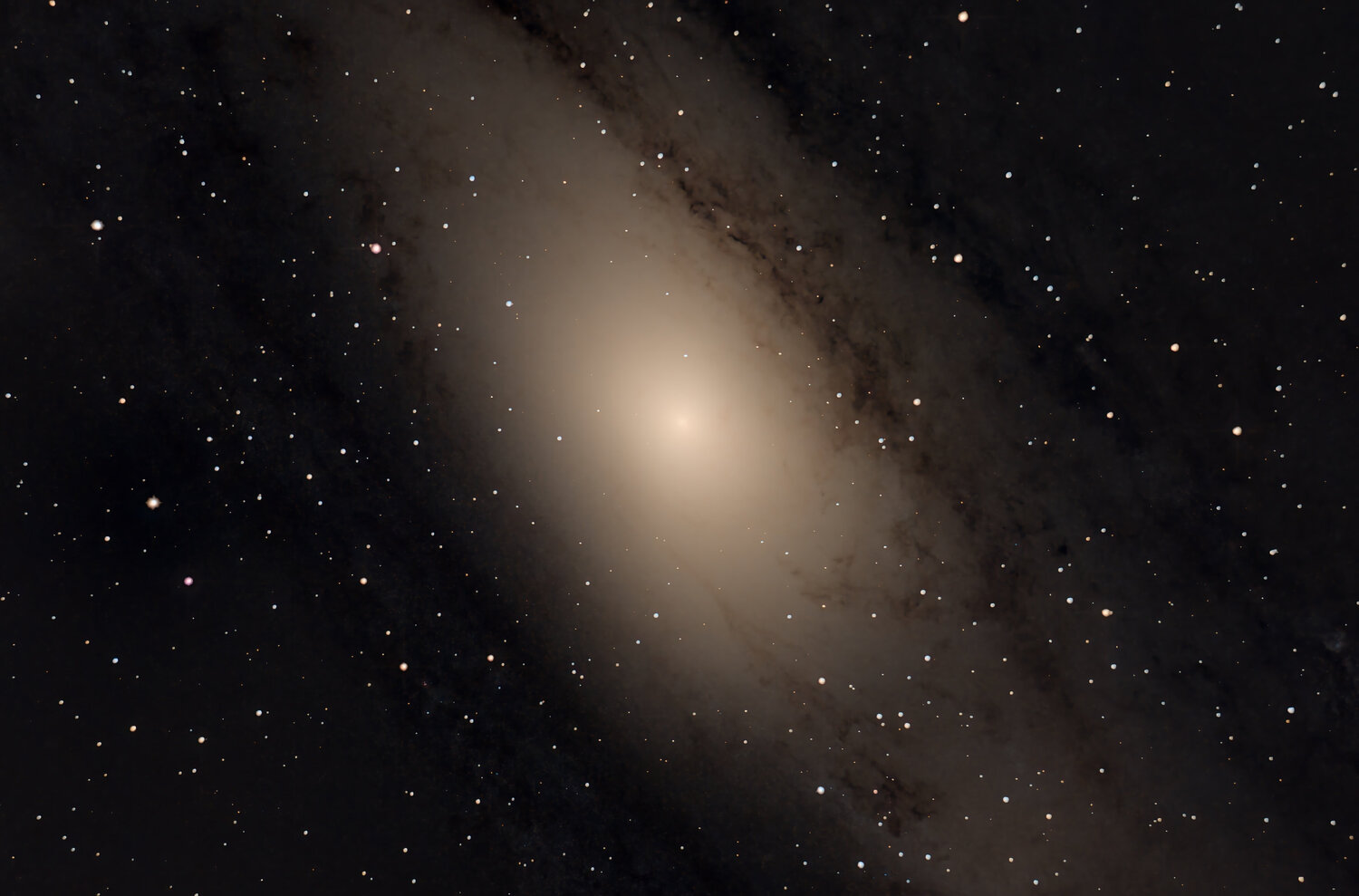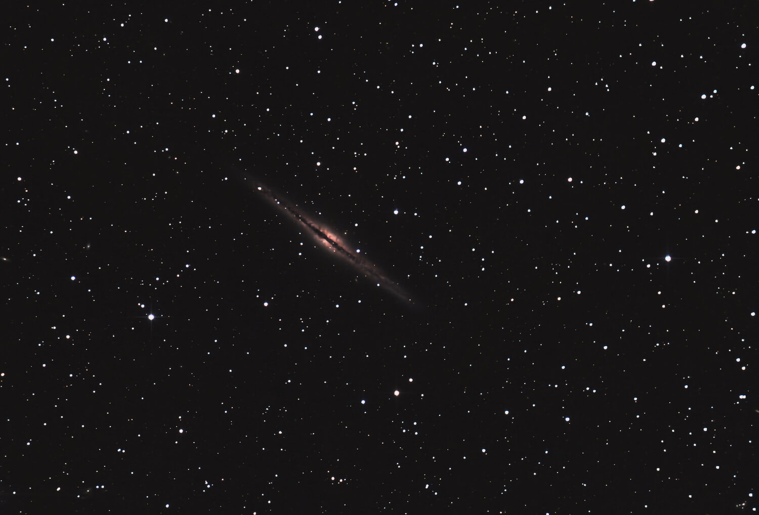 Et voilà NGC 891 après 457 poses de 4s. On peut facilement voir plusieurs petites galaxies dans le champs. -