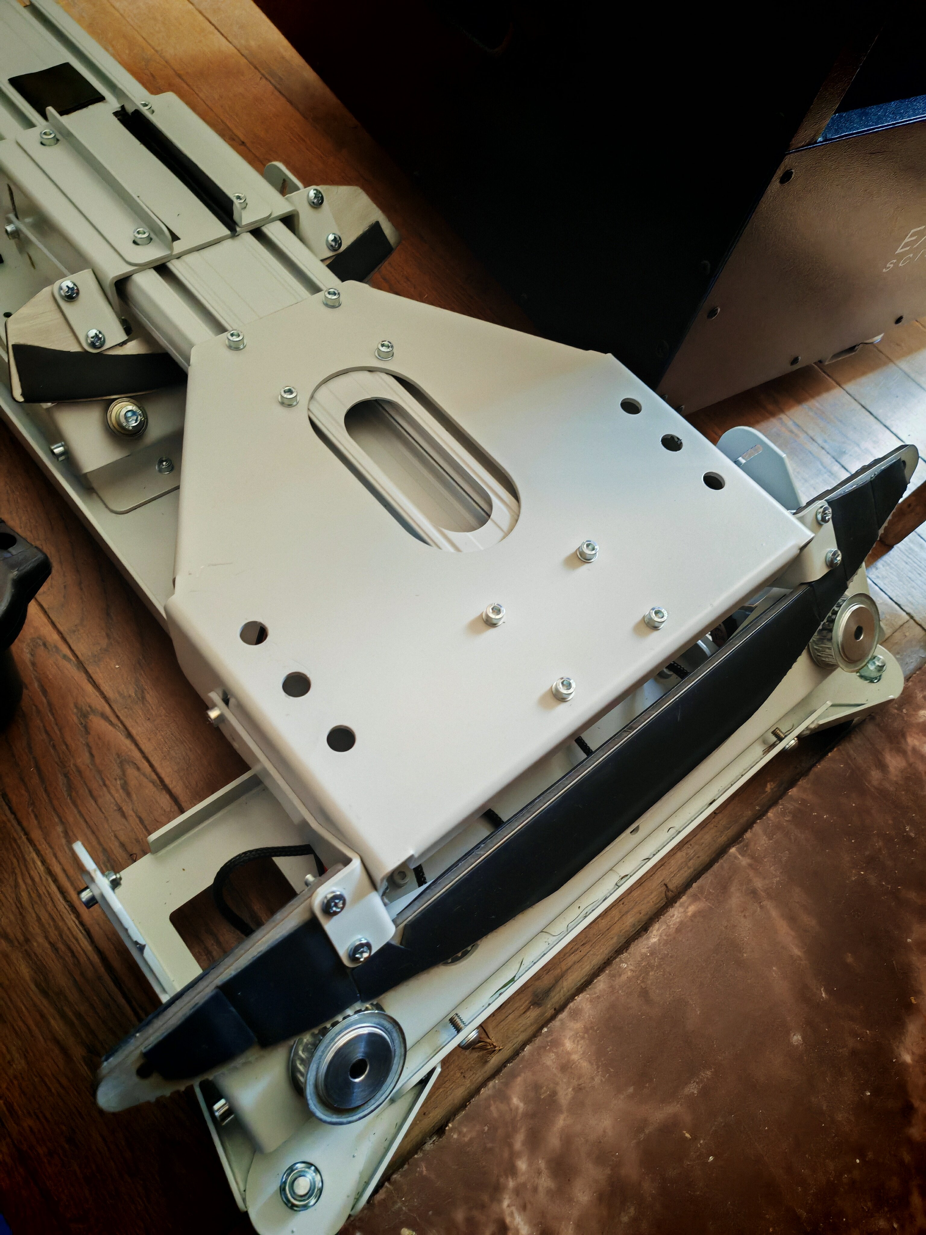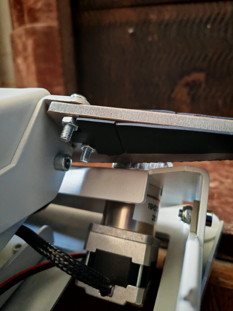 Bonjour à tous, J'ai acheté la dernière version (avec "roues engrenage") de la table équatoriale Géoptik Eartha. J'ai un problème de petites vibrations qui remontent jusqu'à l'oculaire, malgré un équilibrage qui me semble correct. Je pense que le problème viens du moteur qui génère des petits a coups à chaque pas et de la structure tout aluminium de mon Dobson (un ES 400 : le métal transmet les vibrations). J'ai posé quelques bandes anti vibrations (lames et support - voire photo) qui ont atténué le phénomène, mais sans le supprimer entièrement. Bien sur, c'est surtout à fort grossissement que les vibrations se voient sur les objets Dès lors, j'étudie plusieurs pistes pour trouver une solution et votre avis / ou retour d'expérience serait apprécié : 1 - changer de table (solution radicale ) - j'ai vu des tables SUD DOBSON sur mesure sur le forum qui ont l'air moins sujettes aux vibrations ; 2 - poursuivre les poses de bandes anti vibrations (solution sage). Mais où ? Si vous avez un retour d'expérience, je prends :-) 3 - trouver une référence de moteur plus fluide et sans à coup si cela existe pour remplacer ceux d'origine (16HS13-0604S-PG14) - j'ai posé la question au constructeur Géoptik et attends toujours sa réponse... 4 - autres idées bienvenues. Par avance, merci Didier