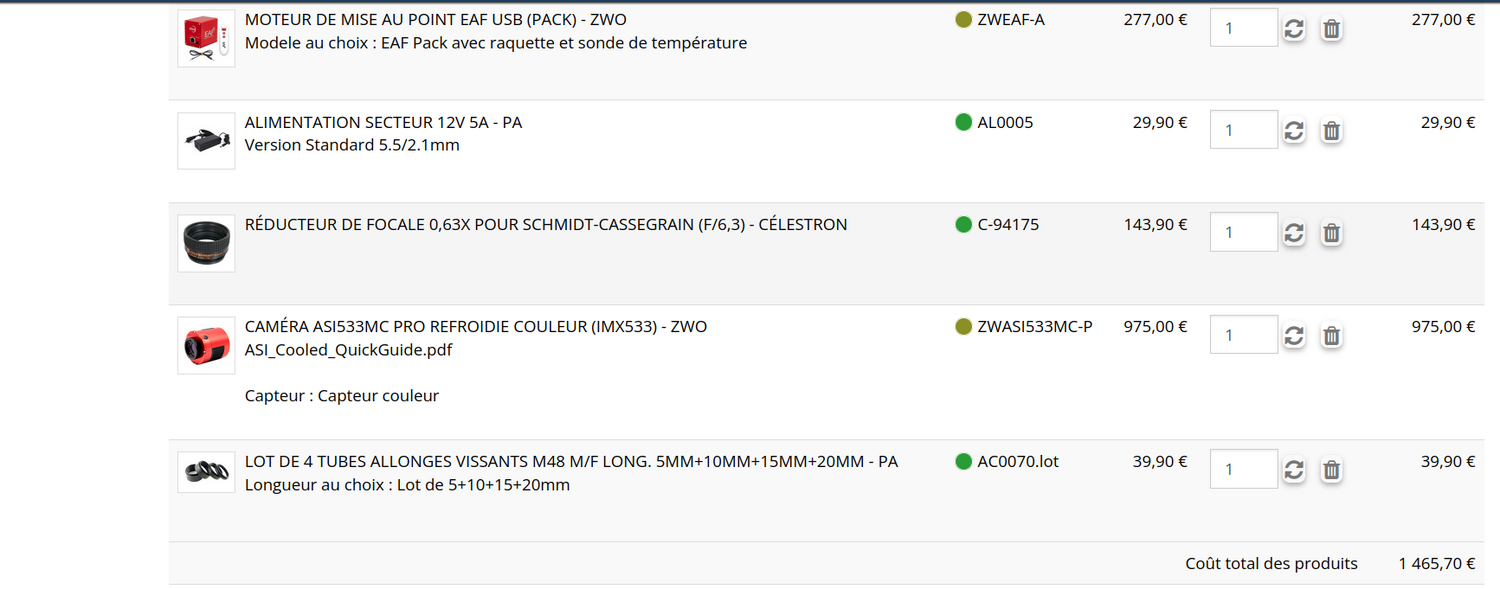 Bonjour, J suis allé voir les conseils chez Pierreastro. Le montage pourra se faire directement à l'arrière des mak 150 et 180 Sky-Watcher de dernière génération car ils sont équipés en standard d'un filetage pour Schmidt-Cassegrain (UNC 2"x24FPP) Le montage optique sera : e Maksutov-Cassegrain (sans son porte-oculaires) e Réducteur de focale C-94175 e Adaptateur SCT vers M48 ref SCT005 ou TSSC-M48 + tubes allonge M48 AC0070.lot (62mm en tout) e Une caméra astronomique ciel profond refroidie type ZWO ASI Cooled PRO (ASI533MC-P en particulier) avec toutes ses bagues et/ ou support filtre à tiroir (55mm de tirage en tout) Le tirage optimal à obtenir entre le réducteur de focale et le plan du capteur sera dans ce cas précis aux alentours de 120mm en tout pour ramener le rapport F/D du télescope à F/8. Quelle caméra ? Nous recommandons les caméras ASI533MC-P ou ASI533MM-P pour leur capteur de grande qualité et de relativement petite taille. En effet, le correcteur/réducteur Celestron n'étant pas prévu pour Maksutov-Cassegrain, les bords de champ au delà d'un certain diamètre seront dégradés. Quelles performances en attendre ? Les résultats obtenus avec une ASI533 sont tout à fait bons et permettent d'envisager de très bons résultats photographiques dans cette configuration. La plupart des télescopes type Ritchey-Chretien sont calés à F/8 et ont une obstruction monstrueuse ainsi que des aigrettes très prononcées (araignée supportant le secondaire). Les résultats obtenus sur ces petits Mak 150 ou 180 sera certes plus limité en termes de champ (équivalent à la ASI533 donc) mais tout à fait utilisable et avec des images très intéressantes. Les avantage de ce type de solution : e l'absence de nécessité de faire une collimation préalable (les Ritchey-Chretien sont une catastrophe à collimater.) e l'absence d'aigrettes sur vos images ainsi e Un accès relativement facile aux "petits" objets du ciel profond avec une focale de 1450mm environ (Mak 180 + réducteur). Etant donné le prix d'un réducteur de focale Celestron, l'essai vaut le coup ! Bon c'est pas donné, mais pouvoir montrer les objets aux petits enfants mérite que je rêve encore un peu ou que je me décide. http://www.astrosurf.com/uploads/monthly_2025_01/67910704e9d19_Capturedcrandu2025-01-2215-54-56.png.50ddf68f457899dde30820fe315e6c41.png https://www.pierro-astro.com/materiel-astronomique/cameras-astro/cameras-ciel-profond/caméra-zwo-asi533-pro-refroidie-couleur_detail https://www.pierro-astro.com/materiel-astronomique/accessoires-astronomie/alimentations-piles/alimentation-12v-5a-pour-montures-et-telescopes_detail https://www.pierro-astro.com/materiel-astronomique/accessoires-optiques/correcteurs-reducteurs/réducteur-de-focale-0,63x-pour-schmidt-cassegrain-c1191-célestron_detail https://www.pierro-astro.com/baader/08-accessoires-filetés-t2-et-pièces-auxilliaires/lot-de-4-tubes-allonges-vissants-m48-m-f-long-5mm-10mm-15mm-20mm-pa_detail Merci d'avance. Cordialement -