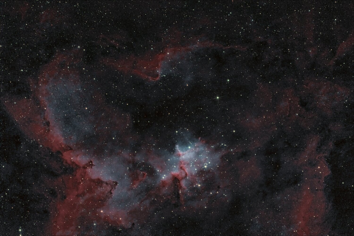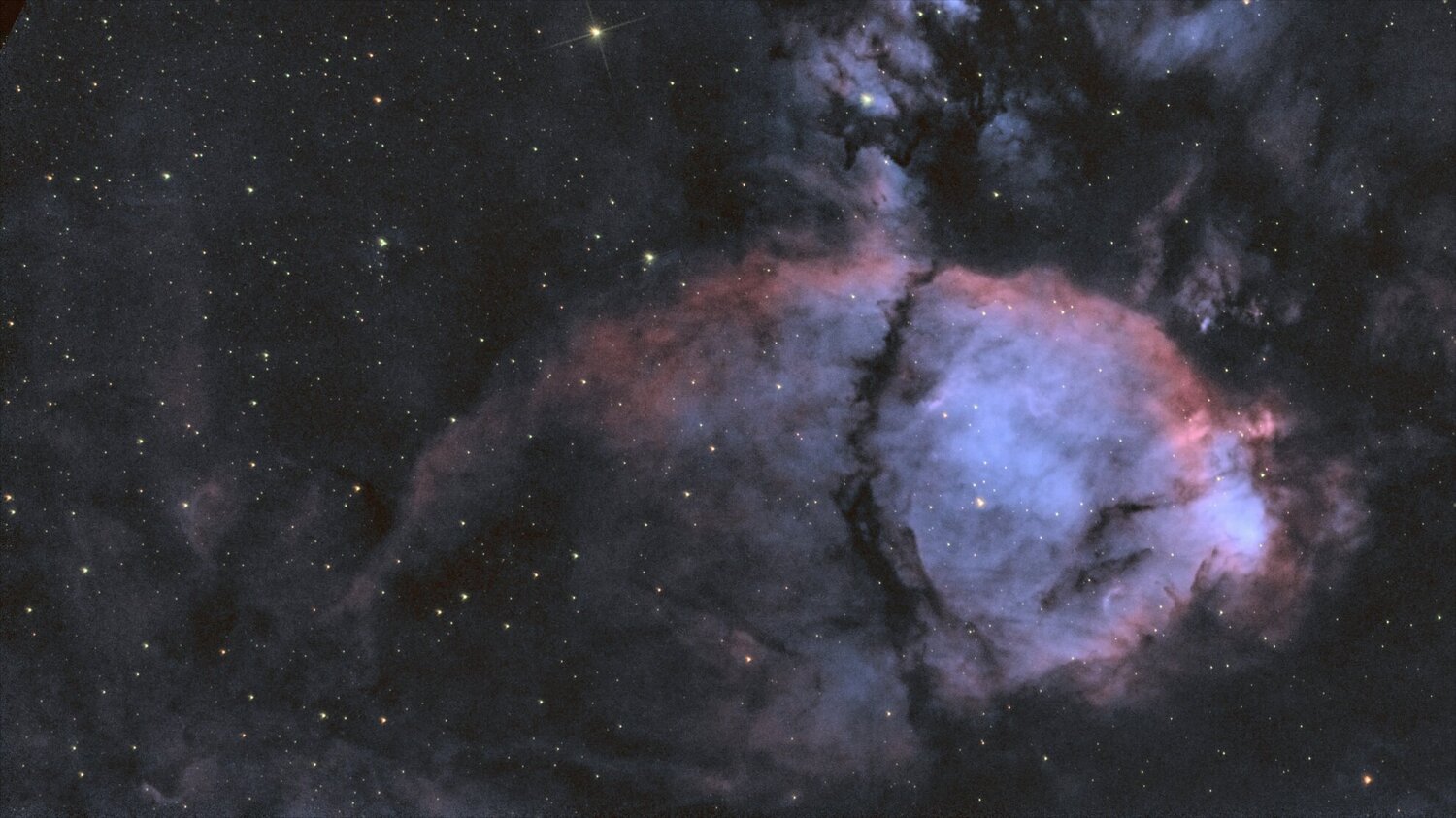Photos prises entre le 6 et le 17 octobre au foyer d'un SW 200/1000 (20 ans d'âge) avec correcteur de coma (focale équivalente 905mm) et filtre Optolong L-extrême dans un ciel de ville Bortle 7+ avec une lune assez gênante les premiers jours et une température extérieure de 10 à 15C pendant les poses. Autoguidage APT+PHD2 avec ASI 120 mini au foyer d'une lunette 60/240. Dithering à chaque pose. Utilisation selon d'une caméra ASI 585 MC pro refroidie à -10°C (20 flat/dark flat + 50 darks pris dans la bibliothèque de darks) ou d'un canon 1000d défiltré astro (20 flats/dark flat, 20 offset et 3 darks seulement! histoire de repérer les pixels défaillants sur SIRIL et de faire des corrections cosmétiques dessus) Technique de traitement, sur SIRIL exclusivement. Séparation des composantes Halpha et OIII par combinaison lineaire des images RGB (HOO) puis multiplication par 7 de la composante OIII (évidemment assez bruitée!) pour la couleur suivi d'un floutage (supression des plans d'ondelettes hautes fréquences 1 à 4) et enfin recombinaison LRGB ave le Halpha en Luminance pour garder un maximum de résolution. Pour simplifier on peut dire que la couleur mesure le rapport Halpha/OIII. Mais avec ces poses plutôt courtes pour ces cibles combiner un rendu colorimétrique fidèle, une bonne résolution, du contraste et un rendu pas trop bruité, j'ai un peu galéré (11h30 de poses cumulées sur ces 2 photos mais 20h de pause devant mon écran d'ordinateur!) . C'est plus facile de conserver la teinte rouge dominante de l'image brute après addition de la séquence. Pour les étoiles, j'ai conservé l'image prise avec le filtre L-extrême. Pour la tête de Poisson, la FWHM est d'environ 2,5" mais pour une raison que je n'ai pas tirée au clair, les étoiles sont déformées avec un halo/aigrettes plutôt rouge dans une direction diagonale. En plus pour une autre raison tout autant mystérieuse malgré un autoguidage satisfaisant (ecart type global < .6") mes étoiles commencent soit à bouger soit à s'allonger toujours dans la même direction lorsque le télescope arrive près de la position verticale (flexion différentielle mais encore ? Me problème est le même avec l'APN ou la caméra) La nébuleuse tête de Poisson combine 3h20 (40x5' sur 50 prises) de pose avec une caméra ZWO 585 MC pro et 4h10 (50x5' sur 50 prises) sur canon 1000d. Je ne donne pas le détail mais l'image de l'APN est beaucoup plus bruitée. L'image prise par la caméra seule n'est pas loin d'être d'aussi bonne qualité que l'image combinée. Pour la nébuleuse du coeur ou plutôt du ventricule droit c'est l'image de l'APN (36x5' sur 50 prises) qui est la plus convaincante et ma préférée. Avec la caméra le champ est trop petit, la lune presque pleine et haute dans le ciel associé à des problèmes de filé d'étoiles (cf plus haut), une pose cumulée n'ont laissé aucune chance à la caméra. -