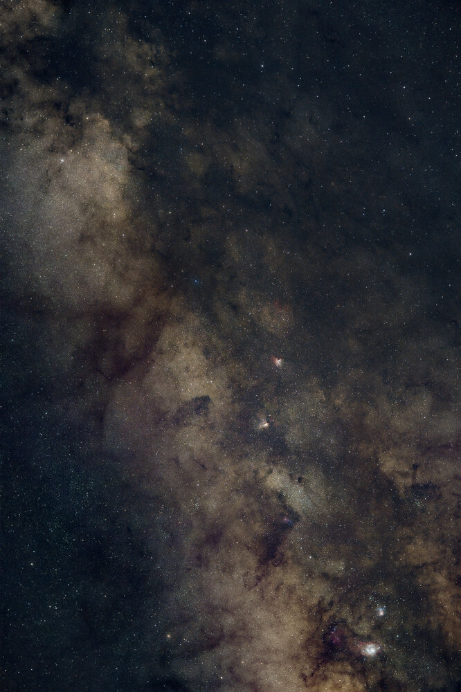 Une image qui date d'il y a 10 jours, d'un grand champ de la Voie Lactée. Un champ qui m'intéressait par sa beauté et sa richesse et qui à f/3.5 valait le coup en attendant de me pencher sur des nébuleuses quand les nuages seront partis.