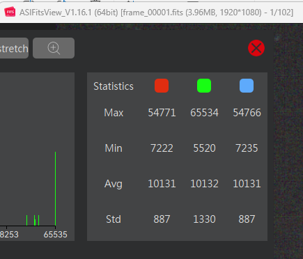 Je vais essayer de produire les masters dark/bias 32 bits et un brut raw ce soir. J'aurais peut-être un petit bout de ciel entre les nuages. Voici ce que j'ai produit à ma dernière session. Ce n'est sans doute pas tout à fait ce qui est demandé, je vois que tout ce que je produis est en 16 bits. Je commence tout juste à apprendre à gérer les DOF... et je galère. Les tutos ne manquent pas mais je m'y perds un peu entre les différentes subtilités et les configurations légèrement différentes. - le fits du stack liveview Sharpcap (dans les dernières minutes de la session, la galaxie était trop haute dans le ciel, mon télescope a commencé à viser le plafond du balcon). 402x 8s gain 253. Stack_16bits_402frames_3216s.fits - j'avais néanmoins activé l'option de sauvegarde des raws. J'ai donc un paquet de png dématricés que je ne sais pas encore utiliser. En voici un exemple. frame_00010.png - dans Siril, j'ai tenté un empilement, pour découvrir que cela se fait sans alignement. Voici le fit de l'empilement. lights_stacked.fit - avant la session liveview, toujours dans Sharcap, j'ai généré un master dark (8s gain 253). Cela a produit un master dark png que j'ai soustrait à la session liveview, sans effet notable. Je ne vois pas de rayon bleu sur ce dark, ce qui me corrobore me expériences précédentes : avec le capuchon, je ne vois plus le rayon bleu. MasterDark_22_04_01.png - et voici le master offset réalisé dans les mêmes conditions (gain 253, 0,0620ms) mais le matin. MasterOffset_253_11_36_31.png. -