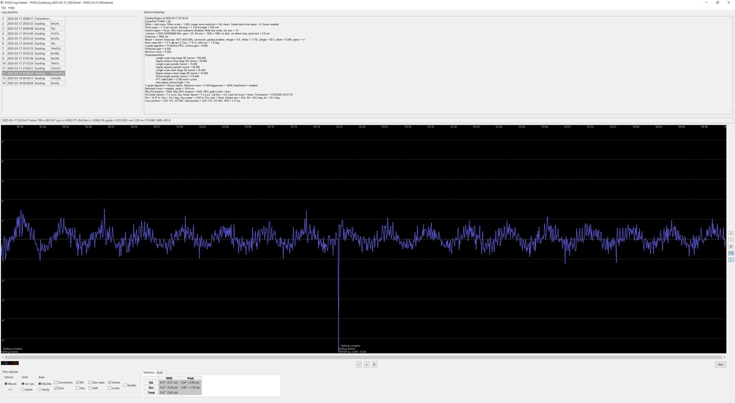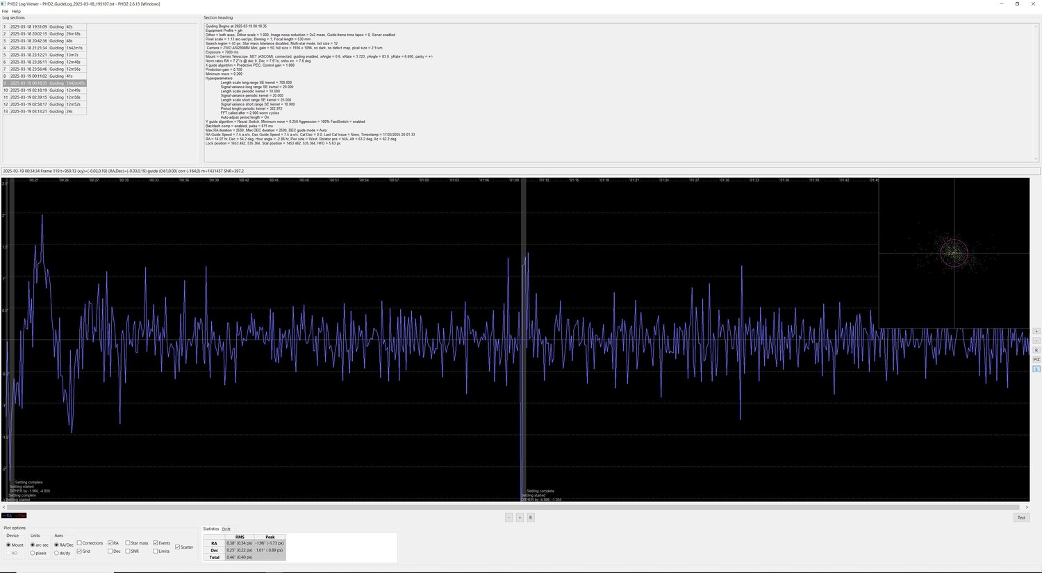 Bonjour, J'aurais besoin de conseils et d'aides... j'ai bcp amélioré mon guidage mais là je coince pour avancer plus loin. Je précise qu'hier le ciel était relativement turbulent et j'aurais peut-être du augmenter le temps pose mais pas sur que cela aurait changer qq chose. En RMS entre DEC et RA j'ai x1.8, je pense que c'est un poil limite. J'ai peaufiner ma mise en station pendant presque 2h pour arriver à 0.2' d'erreur sur chaque axe. Hors après 1h35mn PHD2 indique 3'... déjà je ne comprends pas ce décalage ne devrais-je pas avoir une mesure plus en rapport avec ce qu'affichait PHD2 lors des mesures de dérive? Ou bien est-ce du à la turbulence? J'ai aussi fait un PEC que j'ai activé. Et je vois que j’oscille encore pas mal en RA. J'ai utilisé PPEC et je n'ai pas l'impression que PHD ait progressivement mémorisé mon erreur qui semble quand même bien périodique. Dois-je augmenter le paramètre de correction de la prédiction qui est à 0.5 à plus? j'ai tout laissé par défaut sur les paramètres avancés et il à bien recalculé mon tour de vis sans fin (à peu de chose prêt). Je n'ai pas trop joué avec ces paramètres avancé mais je suis preneur de pistes... Voyez vous des pistes d'amélioration? je vais ré essayer ce soir mais j'imagine qu'il doit bien y avoir 1 ou deux paramètres pour "rapprocher" un peut mon erreur RA vers la DEC surtout que cela semble très périodique quand même. Merci de vos aides.