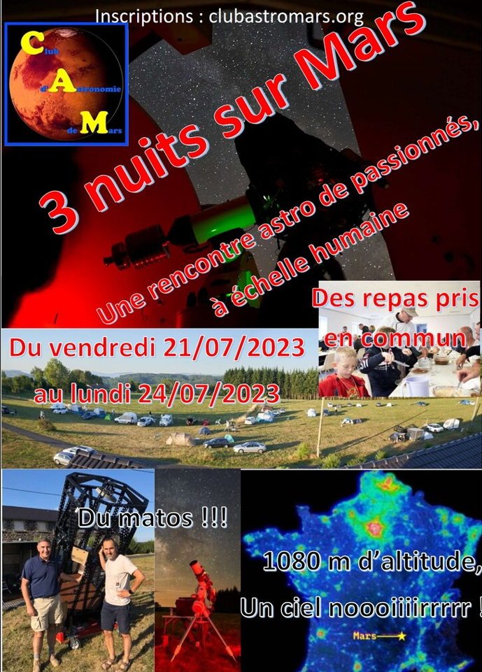 16. Pour sa 8ème année, le Club d'Astronomie de Mars organise les "3 Nuits sur Mars" du Vendredi 21 juillet au Lundi 24 juillet 2023 C'est pas une blague, les rencontres sont vraiment sur la commune de Mars ! Les rencontres très sympa, environ une quarantaine de personnes. Le ciel est bien noir, les repas pris en commun sont inclus dans le prix. Toutes les infos ici : https://www.clubastromars.org/animations/3-nuits-sur-mars-2023
