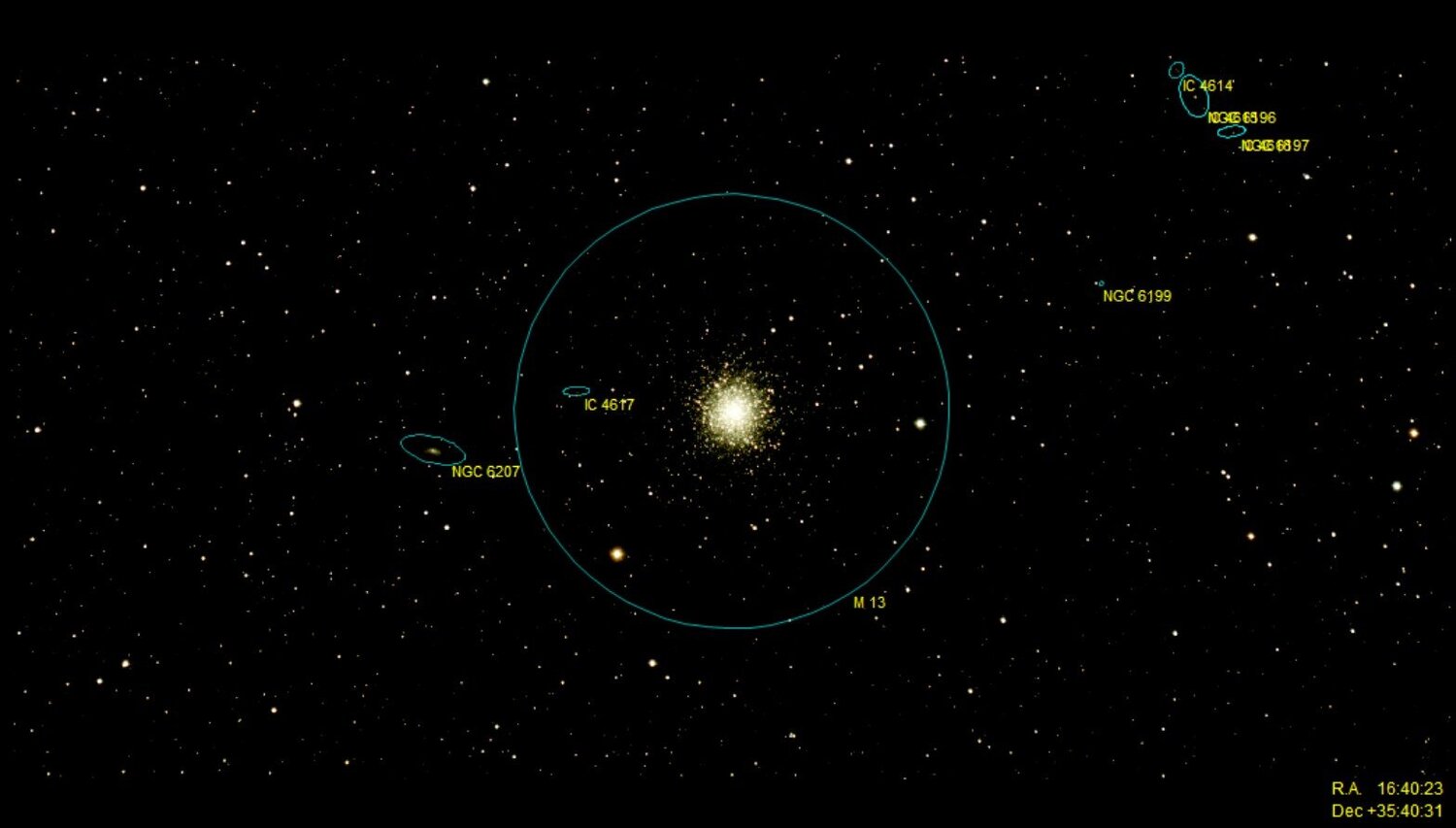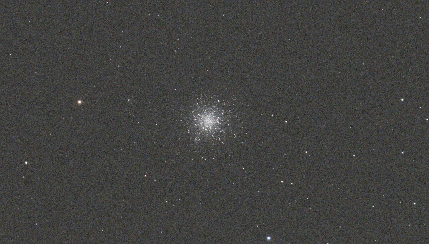 Hello, Autre grand classique, l'amas globulaire d'Hercule, le fameux M13 et son "Y" caché... M13 ou Messier 13, aussi catalogué NGC 6205 et très souvent appelé le Grand Amas d'Hercule, est un amas globulaire situé dans la constellation d'Hercule. Il est parmi les objets les plus imposants du catalogue Messier et il a été découvert par Edmond Halley en 1714. Charles Messier a ajouté cet amas dans son catalogue le 1er juin 1764. Les étoiles individuelles de M13 ont été résolues pour la première fois le 22 août 1799 par William Herschel. M13 est à environ 25 100 années-lumière (7,7 kpc) du Soleil et à 28 400 années-lumière (8,7 kpc) du centre de la Voie lactée. Son âge est évalué à environ 11,65 milliards d'années. D'un diamètre d'environ 145 années-lumière, M13 renferme plus de 100 000 étoiles. L'étoile la plus brillante est une géante rouge, l'étoile variable V11 aussi désignée comme V1554 Herculis dont la magnitude apparente est de 11,95. La densité d'étoiles près du centre de l'amas est environ cent fois supérieure à celle de la région entourant le système solaire. Dans cette région, les étoiles sont si rapprochées qu'elles entrent parfois en collision, créant ainsi une jeune étoile massive qu'on appelle une traînarde bleue. Lunette Skywatcher 80ED (80/600) + réducteur 0.8x @ 479mm Caméra planétaire Player One Neptune-664c + filtre Player One IRcut Anti-halos Monture HEQ5 kit courroie Rowan Autoguidage via lunette guide 60/270, Asi290mm / PHD2 Acquisition NINA 589 x 10s Gain 180 Traitement Siril, Pixinsight, Photolab 6. une brute de 10s:
