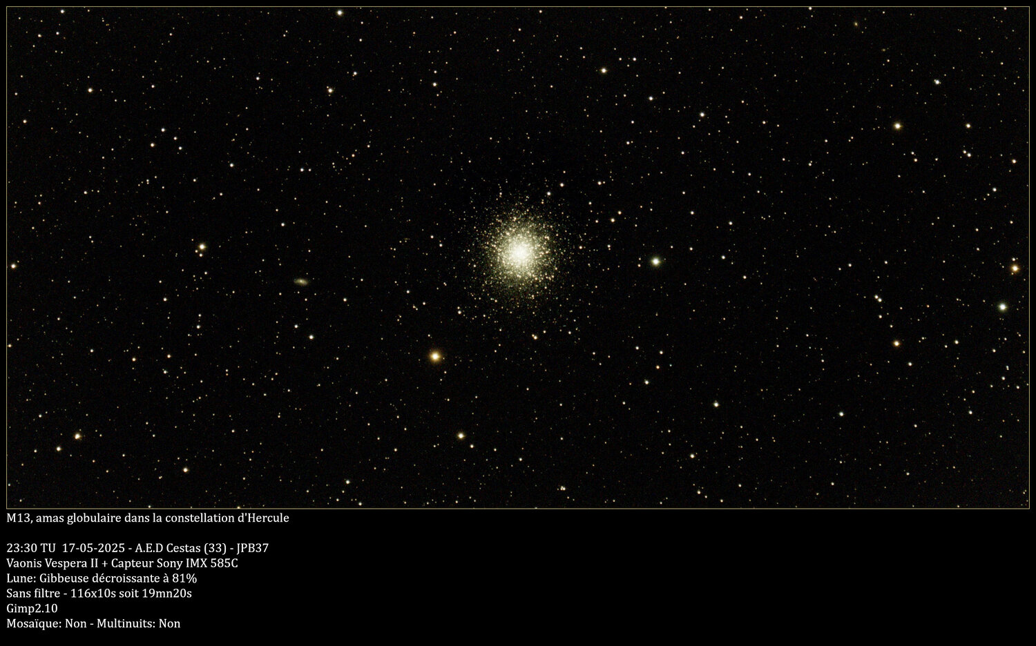 Petit retour en arrière dans la numérotation avec l'observation de M13 hier soir au club. Objet: M13 Constellation: Hercule Mosaïque: Non Multinuits: Non Date: 17 Mai 2025 Heure: 23h30 Lieu: A.E.D Cestas Images: 116*10s Temps: 19mn20s Filtre: Sans Humidité: 78% Température: 15° Lune: Gibbeuse décroissante 81% non levée Traitement: Gimp 2.10 M13 ou Messier 13, aussi catalogué NGC 6205 et très souvent appelé le Grand Amas d'Hercule, est un amas globulaire situé dans la constellation d'Hercule. Il est parmi les objets les plus imposants du catalogue Messier et il a été découvert par Edmond Halley en 1714[5]. Charles Messier a ajouté cet amas dans son catalogue le 1er juin 1764[6]. Les étoiles individuelles de M13 ont été résolues pour la première fois[7] le 22 août 1799[8] par William Herschel. Caractéristiques M13 est à environ 25 100 années-lumière (7,7 kpc) du Soleil et à 28 400 années-lumière (8,7 kpc) du centre de la Voie lactée[3]. Sa vitesse radiale héliocentrique est égale à −245,6 ± 0,3 km/s. Amas d'Hercule Contenu soumis à la licence CC-BY-SA 4.0. Source : Article Amas d'Hercule de Wikipédia en français (auteurs)