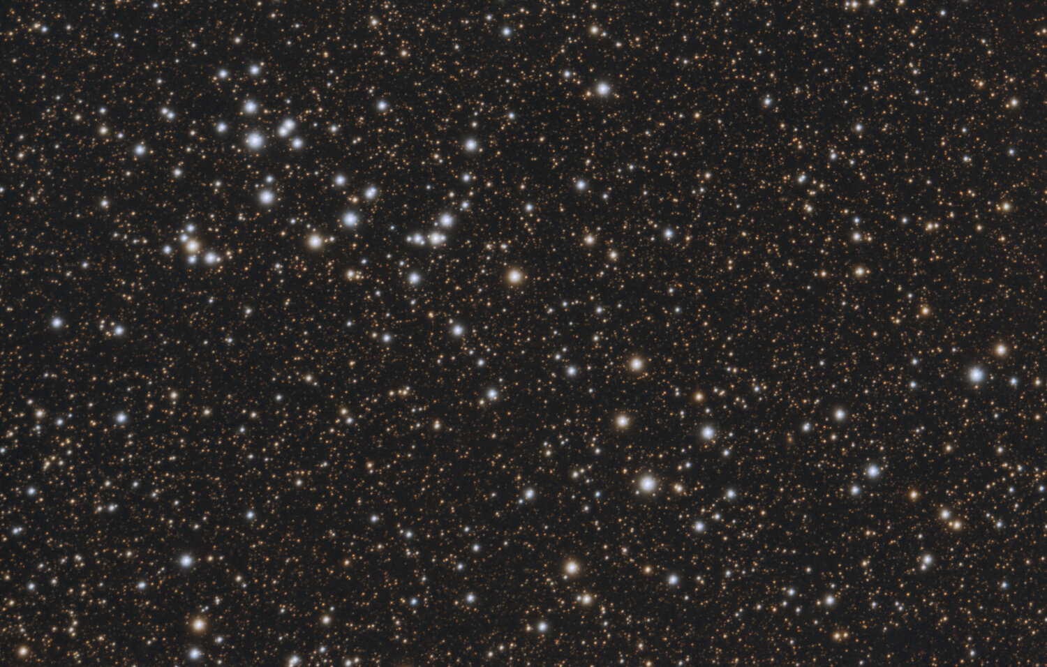 bonjour à tous, une image faite sur plusieurs nuits ( 28 - 29 - 30 Avril et 1er Mai ) , ce qui explique le nombre de pauses assez conséquente pour la luminance. L'amas est bien décentré car j'ai eu du mal à trouver une étoile correcte pour l'autoguidage ... et j'ai des aigrettes bizarres sur les étoiles brillantes en haut (peut-être dues au miroir du DO juste à coté dans le coin en haut à droite) ... bref, quelque chose me dit que le DO va bientôt se transformer en lunette d'autoguidage! C8/GP + réducteur 0.5 optec + filtres LRVB astronomik + atik460ex autoguidage avec DO ZWO et zwo178mm avec phd guiding 2 L : 60 x 180s avec artemiscapture en binning 1x1 R : 6 x 120s avec artemiscapture en binning 2x2 V : 7 x 120s avec artemiscapture en binning 2x2 B : 4 x 120s avec artemiscapture en binning 2x2 prétraitement imageviewCA, Siril traitements Siril, photoshop , graXpert, Seti astro image à la taille d'acquisition mais recadrée Annotation script Siril : a+ stéphane