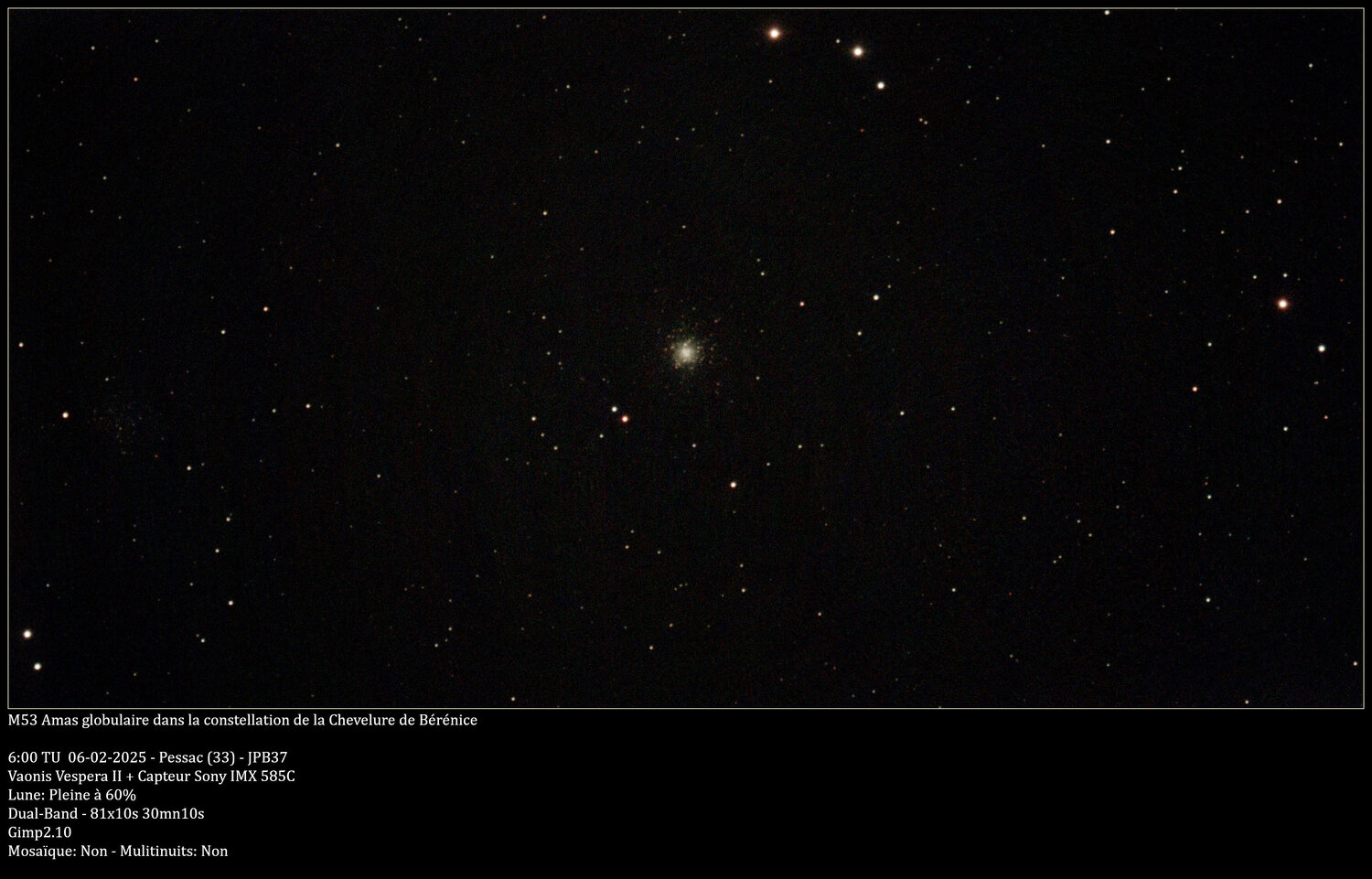 Bonjour à toutes et à tous, je recommence ma tournée des objets de Messier avec l'Amas globulaire M53, dans la Chevelure de Bérénice. Objet: M53 Amas globulaire Constellation: Chevelure de Bérénice Mosaïque: Non Multinuits: Non Date: 06 Février 2025 Heure: 6h00 Lieu: Pessac Images: 181*10s Temps: 30m10s Filtre: Dual-Band Humidité: 71% Température: 4° Lune: Pleine 60% Traitement: Gimp 2.10 M53 Coordonnées équatoriales (époque J2000): Ra (α):13h12.9m, Dec (δ):+18° 10' Magnitude apparente: 8,5m La distance au amas M53 au Soleil est de 61270 années lumière Taille apparente: 13' Class: V Dimensions externes amas M53 sont à propos de 230 années lumière. Poids estimé de l'amas: 750x103 soleils Découvreur: Johann Elert Bode, 03.02.1775 a. Désignation M53 dans d'autres catalogues: NGC 5024 Le grossissement optimal pour un télescope dans les observations de M53, en fonction de l'ouverture du télescope (D), est d'environ D/4-D. Des grossissements plus élevés ajoutent bien sûr des détails, mais conduisent à une forte baisse de la luminosité de l'image, ce qui la rend difficile à observer. Le meilleur mois pour observer M53 est mai. À ce moment, l'objet est à minuit près de son point le plus haut, c'est-à-dire qu'il est moins affecté par la lumière des lanternes et la distorsion atmosphérique. Pour les observateurs des latitudes septentrionales: le ciel nocturne de mai n'est plus très sombre, il est donc logique d'essayer d'observer M53 en avril. Bien sûr, en avril l'objet est à minuit non à son point culminant, qui fournit la moindre exposition et la distorsion atmosphérique. Mais, l'obscurité du ciel d'avril augmente considérablement le contraste. Plus l'emplacement de votre observation est situé au sud, plus le ciel d'été sera sombre.