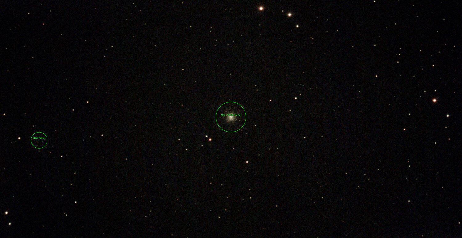 Hello, Voici le voisin de M53, présenté ici même la semaine dernière. NGC 5053 est un amas globulaire situé dans la constellation de la Chevelure de Bérénice à environ 21 500 a.l. de la Terre. Il a été découvert par l'astronome germano-britannique William Herschel en 1784. Lunette Skywatcher 80ED (80/600) + réducteur 0.8x @ 479mm Caméra planétaire Player One Neptune-664c + filtre Player One IRcut Anti-halos Monture HEQ5 kit courroie Rowan Autoguidage via lunette guide 60/270, Asi290mm / PHD2 Acquisition NINA 570 x 10s Gain 180 Traitement Siril, Pixinsight. une brute de 10s: