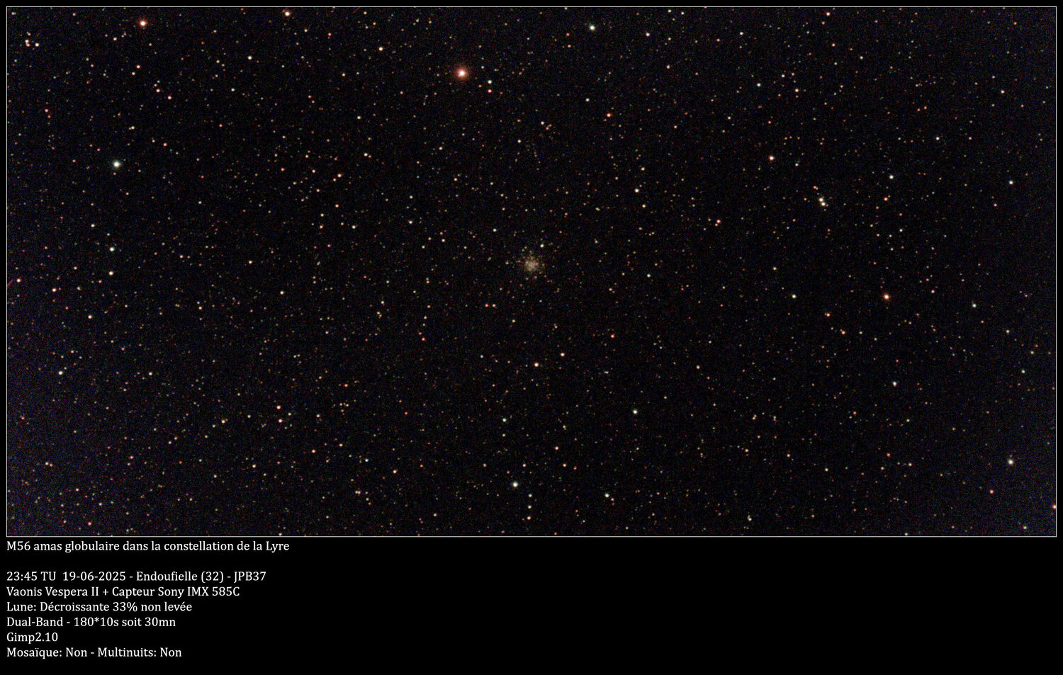 Je poursuis avec une des observations réalisées pendant mes vacances dans le Gers, avec l'Amas globulaire M56 dans la constellation de la Lyre. Objet: M56 amas globulaire Constellation: La Lyre Mosaïque: Non Multinuits: Non Date: 19 Juin 2025 Heure: 23h35 Lieu: Endoufielle Images: 180*10s Temps: 30mn Filtre: Dual-Band Humidité: 68% Température: 24° Lune: Décroissante 33% non levée Traitement: Gimp 2.10 L'astronome français Charles Messier a découvert cet amas globulaire et l'a ajouté à son catalogue le 23 janvier 1779. Il l'a décrit comme une faible nébuleuse sans étoiles. Caroline Herschel a aussi observé cet amas le 7 avril et le 4 mai 1783. William Herschel a observé l'amas le 5 janvier 1807. Il a été le premier à résoudre ses étoiles et il l'a décrit comme un amas globulaire très compact ayant de très petites étoiles. L'amas est graduellement plus dense vers le centre . Selon de récentes mesures effectuées par le satellite Gaia, la vitesse radiale héliocentrique de cet amas est égale à −136,97 ± 0,45 km/s[4],[5]. La base de données Simbad indique aussi une autre valeur récente de la vitesse, soit −122,0 ± 0,5 km/s ainsi que −154,0 ± 5,0 km/s d'une publication de l'année 1953. William W. Harris indique une vitesse semblable, soit −135,6 ± 0,9 km/s. La base de données Simbad indique une seule distance pour M56, soit environ 0,010 Mpc (∼32 600 al) et celle inscrite sur le site de l'Observatoire de Paris est de 32,9 kal. Ces distances sont semblables à celle donnée par Harris, mais légèrement plus grandes. Si on admet une distance d'environ 9,4 kpc et une taille de 8,8', un calcul simple montre que sa taille réelle est d'environ 78 années-lumière. Contenu soumis à la licence CC-BY-SA 4.0. Source : Article M56 (amas globulaire) de Wikipédia en français (auteurs)