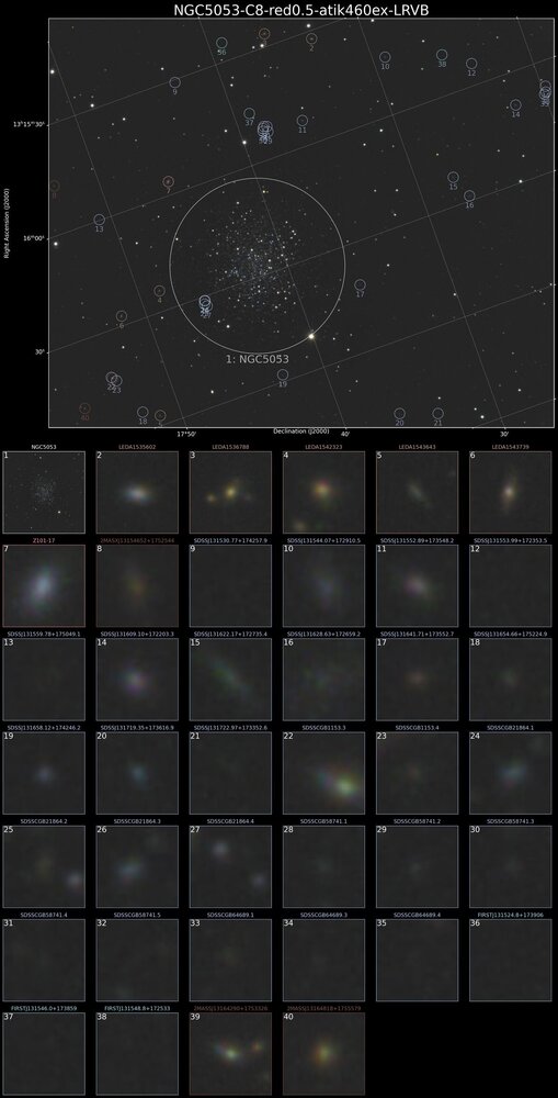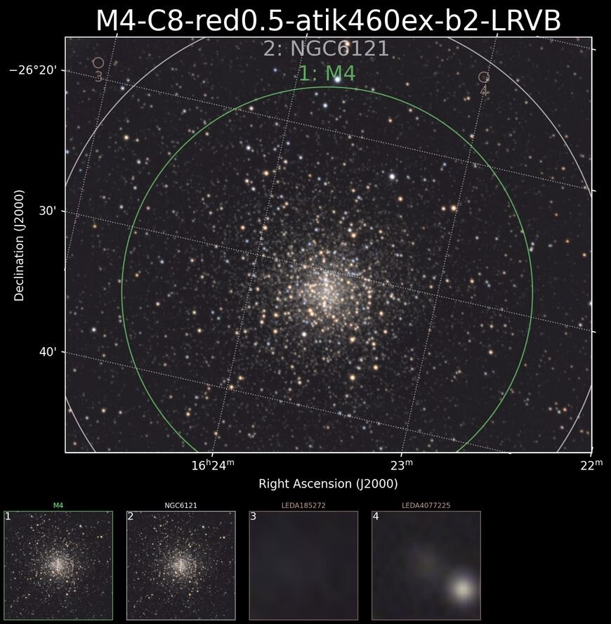 bonjour à tous, une image du 17 Mai dernier de cet amas globulaire peu imagé. Pourtant je le trouve plutôt esthétique, on dirait une galaxie naine Des étoiles bien rondes sur tout le champ pour cette image même si je ne sais pas comment je m'étais débrouillé ( quand le serrage du réducteur est correct, c'est tout de suite beaucoup mieux ) C8/GP + réducteur 0.5 optec + filtres LRVB astronomik + atik460ex autoguidage en // avec Evoguide 50ED et zwo178mm avec glasspath x1.7 L : 17 x 180s avec artemiscapture en binning 1x1 R : 8 x 120s avec artemiscapture en binning 2x2 V : 5 x 120s avec artemiscapture en binning 2x2 B : 7 x 120s avec artemiscapture en binning 2x2 prétraitement imageviewCA, Siril traitements Siril, photoshop , graXpert, Seti Astro A la taille d'acquisition, légèrement recadrée Annotation sript Siril : a+ stéphane