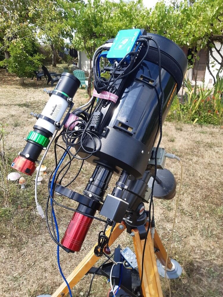 bonjour à tous, en ce 11 Juillet, j'innovais une nouvelle configuration d'imagerie pour mon C8. Tout d'abord, j'avais reçu ma bague (rotative) de 12mm pour atteindre la bonne distance (théorique) entre le capteur et le réducteur. Comme j'ai toujours des problèmes de serrage (et donc de tilt), je ne trouve pas le résultat sur les étoiles très probant mais Siril me dit maintenant que la focale résultante de mes images est de 997mm, donc ça doit être bon Et puis, j'avais reçu aussi mon moteur de mise au point Gemini que j'ai adapté sur ma molette de mise au point Starizona microfuser. D'où, aussi, ma première utilisation de NINA pour automatiser la mise au point. J'ai réussi à avoir une hyperbole pas trop moche pour mon premier essai, je l'ai gardé pour ces acquisitions. Et enfin, j'ai remonté le hub usb sur le tube (faut que je rachète des câbles usb plus courts maintenant) ; il n'y a plus que 2 cables qui pendouillent maintenant ( l'USB et l'alim du HUB) ; ça pourrait être utile pour un futur retournement au méridien automatisé A noter que j'ai pesé l'ensemble qui avoisine maintenant les 10 Kgs ... La GP étant donné pour un poids max en charge de 7kgs , je suis, comme qui dirait, hors limite Et puis j'ai pointé l'amas M71 pour tester tout ça ( ça permet d'avoir pleins d'étoiles pour la MAP ). C8/GP + réducteur 0.5 optec + filtres LRVB astronomik + atik460ex autoguidage en // avec Evoguide 50ED et zwo178mm avec glasspath x1.7 L : 17 x 300s avec artemiscapture en binning 1x1 RVB : 7 x 180s avec artemiscapture en binning 2x2 prétraitement imageviewCA, Siril traitements Siril, photoshop , graXpert image à taille d'acquisition mais toujours fortement recadrée a+ stéphane