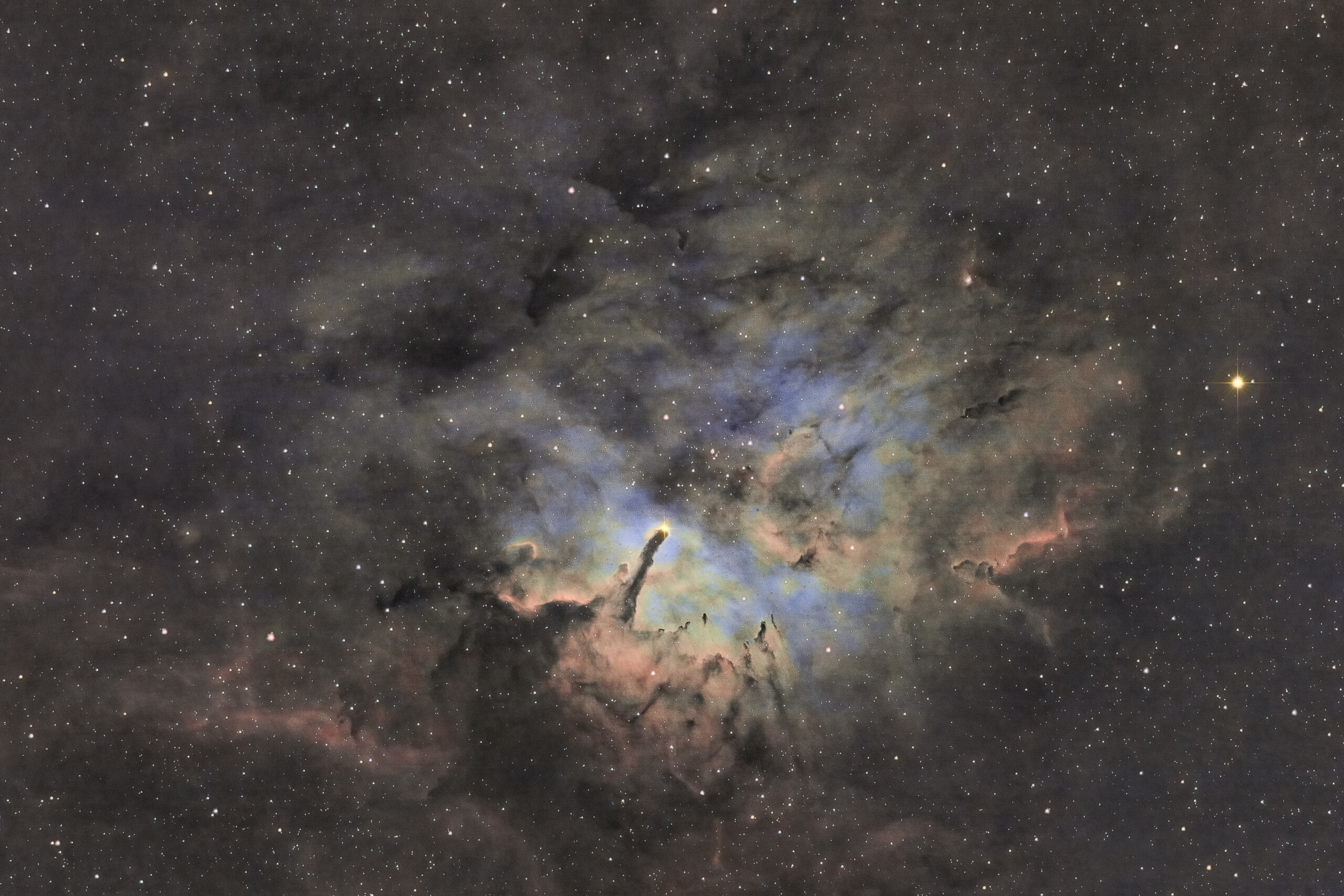 NGC 6823 est un très jeune amas ouvert situé dans la constellation du Petit Renard. Nuits du 17, 18, 24 et 25 Août 2025 Monture HEQ5 + Polemaster Lunette TS PHOTOLINE 80 / 560 avec coma TS2,5 : 566 mm à F/7 Caméra : Altair-Astro 183 MM ProTec refroidie à -15° Baader H-alpha 7nm : 60 x 300 sec Bin 1x1 -> 5H00 Baader O3 8.5nm : 60 x 300 sec Bin 1x1 -> 5H00 Baader S2 8nm : 59 x 300 sec Bin 1x -> 4H55 ZWO ANTLIA Rouge : 11 x 120 sec -> 0H22 ZWO ANTLIA Vert : 9 x 120 sec -> 0H18 ZWO ANTLIA Bleu : 9 x 120 sec -> 0H18 Exposition totale 15 heures 51 minutes Traitement Siril + Photoshop