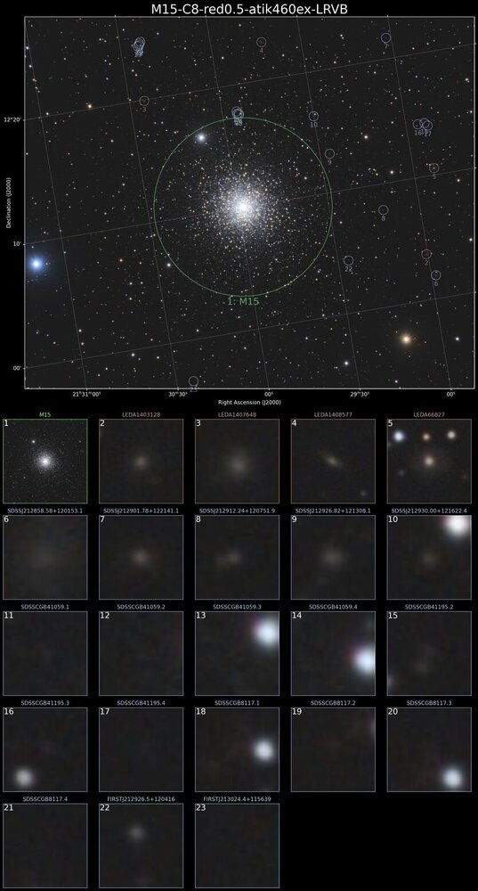 bonsoir à tous, En ce 26 Juillet, j'avais jeté mon dévolu depuis ma Beauce sur M15 , un amas globulaire de la constellation de Pegase. Eloigné de 34000 AL, c'est l'un des AG les plus compacts connus ... et j'ai eu la bonne idée de laisser mes réglages par défaut, et donc le coeur est un peu cramé! Et, en périphérie, mes étoiles sont toujours déformées malgré le recadrage. C8/GP + réducteur 0.5 optec + filtres LRVB astronomik + atik460ex autoguidage en // avec Evoguide 50ED et zwo178mm avec glasspath x1.7 L : 13 x 300s avec artemiscapture en binning 1x1 RV : 7 x 180s avec artemiscapture en binning 2x2 B : 6 x 180s avec artemiscapture en binning 2x2 prétraitement imageviewCA, Siril traitements Siril, photoshop , graXpert, Seti Astro A la taille d'acquisition, recadrée Annotation script Siril : Et Pease 1, dans tout ça? Pease 1 (ou PK 65-27.1) est une petite ( 1" d'arc ! ) nébuleuse planétaire se trouvant dans M15, découverte en 1927. Depuis, seuls 3 autres AG ont été vus avec une NP à l'intérieur. Avec mon petit 1m de focale, pas évident que je puisse la repérer sur mon image. A 300%, je vous laisse chercher Pour le coup, j'ai superposé l'image faite par Hubble par dessus pour aider Pas de doute, elle est ... ( je pense que la réponse est ... NON ) Plus d'info sur Pease 1 pour arriver à l'observer : https://www.deepskycorner.ch/obj/m15.en.php https://www.deepsky-drawings.com/pk-065-27-1-t254-vs-t508 a+ stéphane