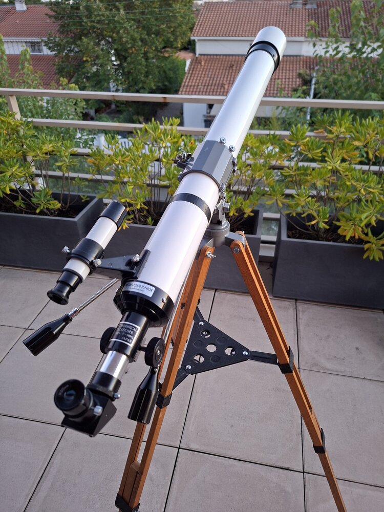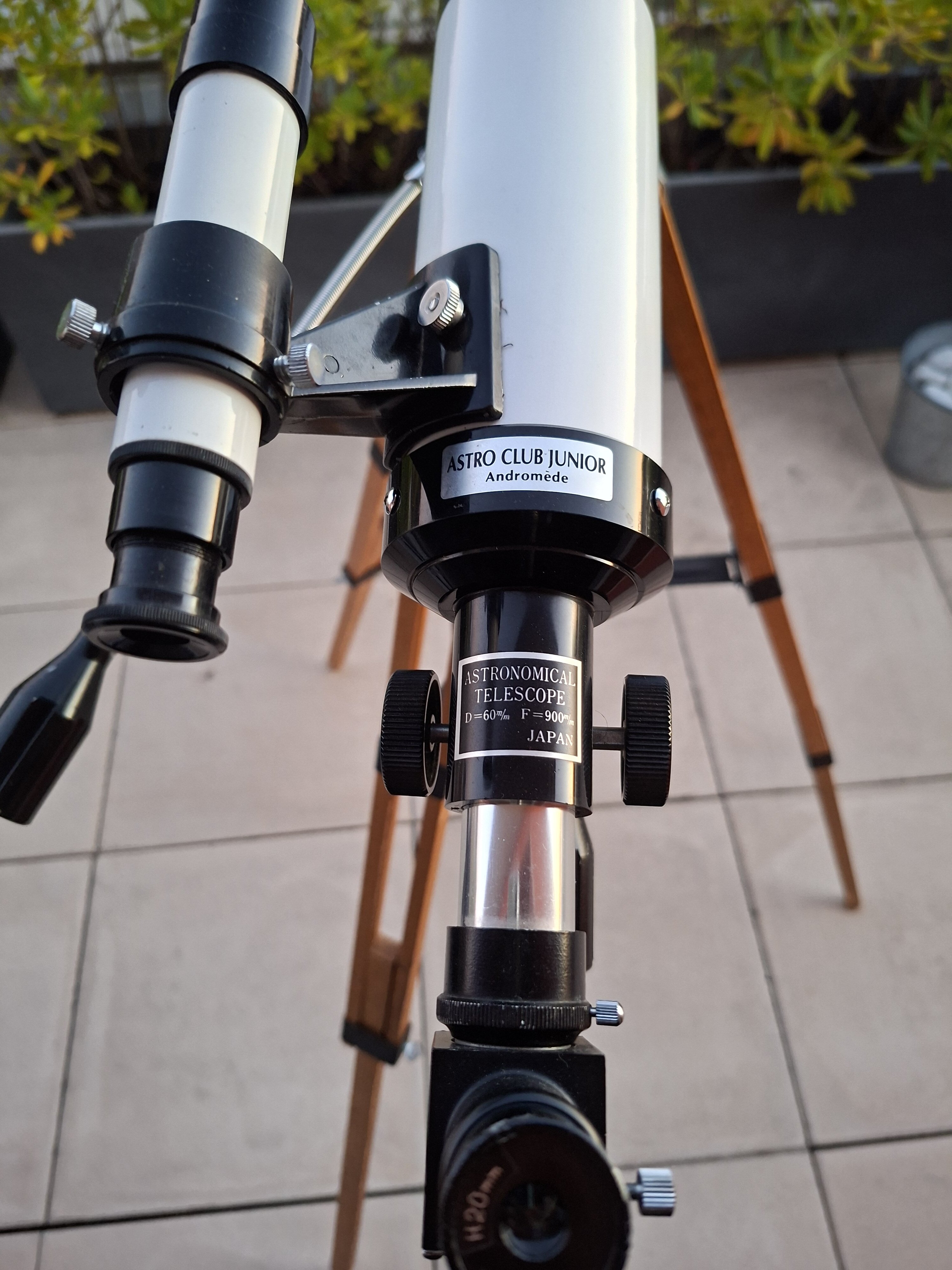 Voilà après un achat auprès du Bon Groins, moins de 20 euros, j’ai sauvé cette lunette qui n’est pas si mal pour faire de l'initiation sur du planétaires ( c'est la saison qui commence). Conception Made in Japan, année 80/90, tube résine (que mon peintre carrossier à redonné de son éclat). Fabrication Japonaise, mais "badgée" à la Française Astro Club Junior ANDROMEDE, et ce qui a fait cet achat , c’est que vraisemblablement elle sortirait de chez VIXEN, j'ai déjà de ce fabricant Japonais une Tachyon en 60/800 ( passée entre les mains de Lyl ) et on retrouve les mêmes indications sous le porte oculaires , le fameux KD. Sur les photos, ce n’est pas sa monture mais elle fait le taf, en attendant de trouver une occase comme une AZ3. -