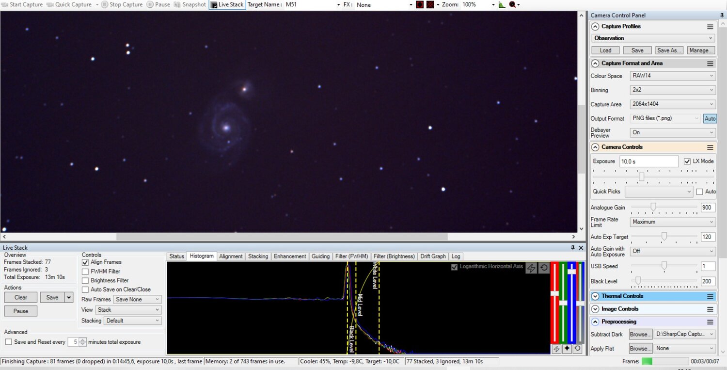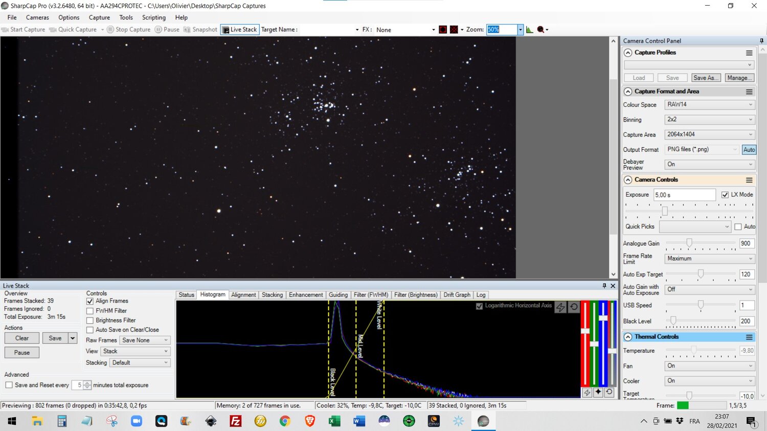 Bon, je partage avec vous mes premiers pas : il y a beaucoup de choses à apprendre pour sortir quelques images, spécialement quand on observe sous un ciel tout pourri de région parisienne Quand je suis à la campagne, à l'oeil nu, j'ai l'impression qu'on m'a greffé des jumelles sur les yeux Donc, avec une caméra et en cumulant les poses, je n'imagine même pas ce qu'on doit pouvoir voir !! En attendant, mes quelques modestes images donneront peut-être espoir aux citadins comme moi qui aimeraient observer un peu plus que le ciel orange pollué, car bien sûr, en visuel pur, c'est encore plus la misère ! Et sans aller jusqu'à l'astrophoto où, en plus de la haute technicité, du matériel et du savoir-faire... eh bien, on n'observe plus (à mon goût) et on fait surtout de l'informatique, de la technique et du traitement d'image. C'est certes superbe et j'admire les pros du domaine... mais pour moi on est alors bien loin de l'observation visuelle. Trêve de blabla, voici ce que l'on peut voir en branchant une caméra sur son instrument, en quelques minutes, avec une mise en station approximative (je ne vois pas la polaire, de mon jardinet de ville), sous les lampadaires et et entre les maisons et immeubles voisins. Premiers essais... en février dernier... sur M42 (le truc qui se voit le plus dans le ciel)... Admirez la MES pourrie (les grosses bandes noires sur les côtés de l'image) et le réglages WTF? de l'histogramme dans SharpCap : N'empêche que j'étais bien content de voir ça en quelques minutes, par rapport à la vague tachouille que l'on devine en visuel, dans la pollution lumineuse ambiante ! Et avec 5mn de traitement dans StarTools pour "sortir" les photons cachés, on obtient ça !!! Version flashy ! Mais avouez que ça pète !!! Pour 10mn de pose + 5mn de "révélation", pour faire ressortir les photons cachés dans la prise de vue, je ne vous fais pas le comparatif avec ce que l'on voit à l'oeil nu, à l'oculaire, de chez moi !! Et on est loin des heures de pose de l'astrophoto - même si on est aussi très loin de la qualité d'image, mais là on parle d'observation directe, à l'écran, et de ce que l'on obtient en quelques minutes de traitement, souvent sur la base d'une simple image PNG (au début je n'avais même pas de darks non plus)... Un autre soir, toujours à mes débuts (qui ne sont pas si loin que ça, donc je m'estime toujours débutant, à l'heure qu'il est !) : un petit amas globulaire ? M38, en 5mn... C'est vrai qu'on les voit déjà bien à l'oculaire, les amas globulaires, mais si on peut faire sortir plus d'étoiles, c'est aussi bien, non ? Et après un rapide traitement (de débutant) dans StarTools, voilà ce que cela donne : 5mn de pose + 5mn de traitement, sous un ciel tout pourri, et avec une mise en station komessapeu Et ça marche aussi avec un amas... double ? Le fameux "Double Amas". Allez ! En 3mn (et mal centré, tant pis, je le referai plus tard)... Hop, un petit coup de StarTools, qui booste les étoiles mais aussi le gradient provoqué par les lampadaires Un essai (très) optimiste sur NGC 891... "Il ne savait pas que c'était impossible, alors..." ...Alors, pas évident !!! Même après 12mn... on ne voit pas grand chose. Pourtant, elle est là, cachée comme une aiguille dans une botte de foin ! Merci StarTools, qui permet de l'exprimer un peu mieux... Même si ce n'est pas super beau, c'est quand même "dans la boite" !! Allez, soyons fous ! Cela donne quoi sur M97 ??... Au bout de 12mn... Elle est là, pas super colorée, mais présente ! Et avec un petit coup de StarTools : sympa ! Et une jolie spirale barrée, genre M109, ça donnerait quoi ? En 49 x 5s = 4mn05 (je n'ai pas fait la copie d'écran de SharpCap)... Et la "révélation", avec StarTools : En moins de 5mn de stacke, c'est bien je trouve... Une autre galaxie ? NGC 2903... Pas évidente non plus, pour moi qui débute. La voilà après 11mn de stacke (par poses de 10s)... Et après StarTools (pas évident de trouver la juste couleur !!)... Enfin, vous voyez ce que l'on peut obtenir sous un mauvais ciel, après juste quelques sorties... et une grande marge de progression !! Allez, je termine cette présentation avec une star : M51... Première fois que je pouvais la voir ! L'été dernier, en visuel : impossible !! Et cet hiver, elle était derrière l'immeuble d'à côté... Et là, à 2h du mat, le 1er avril (pas une blague !), je vois M51 sortir de derrière le mur !!! Tant pis pour la fatigue et le travail du lendemain, j'ai stacké quelques images. Après 13mn... (poses de 5 et 10s) Et mon "save as seen" ("vu comme à l'écran"), après 900 secondes de pause (15mn) : Bon, faut pas comparer avec ce que d'autres voient dans le même temps à la montagne ou sous un ciel bien noir, mais j'étais déjà bien content. Et plus encore quand j'ai vu ce que StarTools m'en a révélé : Sûrement pas le meilleur traitement, ni la meilleure image de base, mais quand j'ai vu ces belles couleurs, alors qu'à l'oeil nu (au télescope, hein, quand même !) la zone est vide, on ne voit strictement rien : c'est quand même une superbe surprise ! Et c'est là qu'on aime le Visuel Assisté !