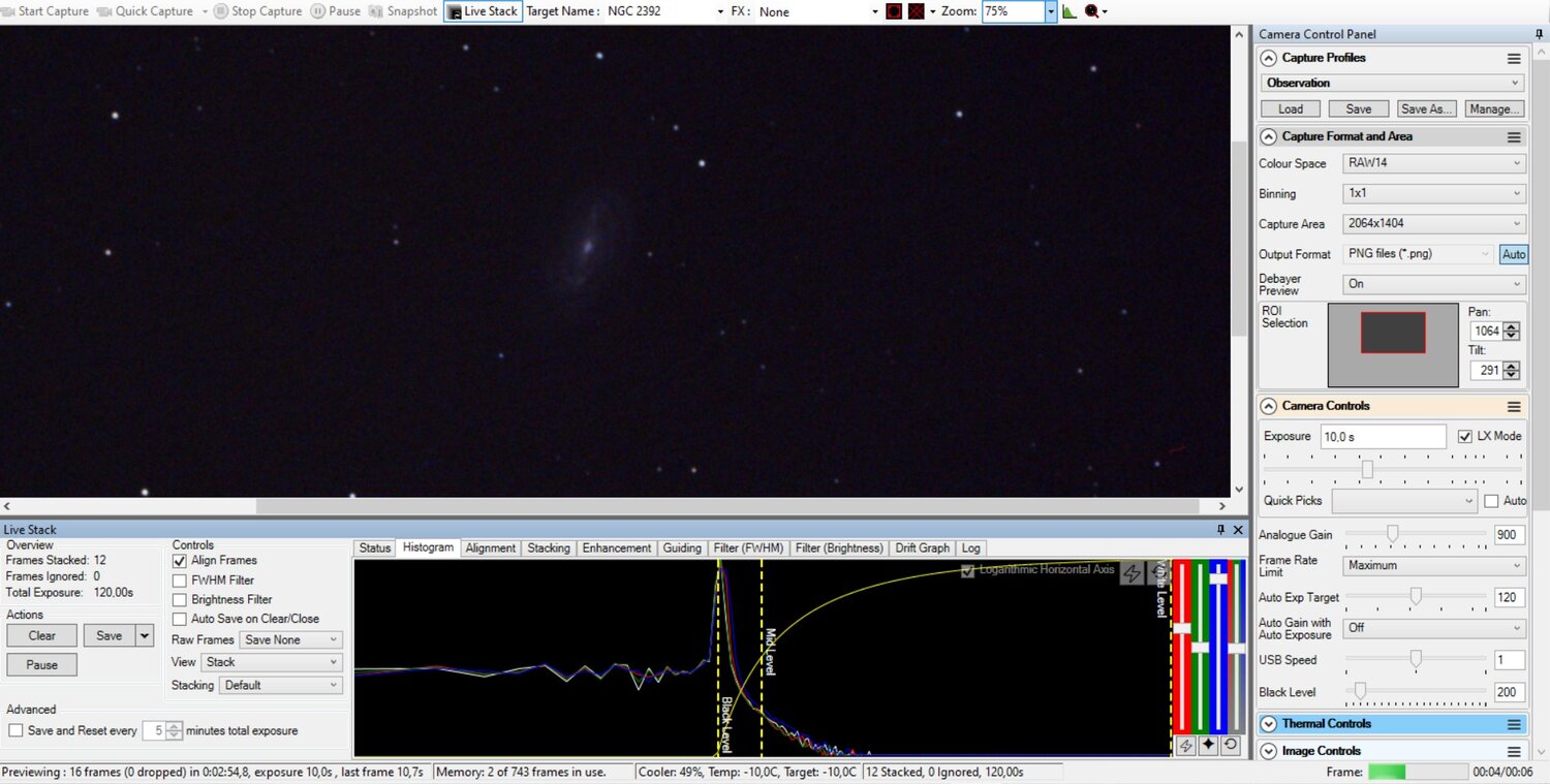 Bonjour à tous un petit crova au départ pour vérifier la correction du tilt, je suis content j'approche du but, j'ai aussi vérifier la mise à niveau de la monture, pour la mise en station précise je ne voyais pas sur Nina que la mise eu point était dans les choux , la mise en station avec 3 étoiles echoait sans arrêt j'ai arrêté Ensuite Test sur M37 enfin un FWHM en dessous de 4 temps de pause 4 sec 43% pour le gain toujours avec la lunette TS 80 photoline version en live sharcap empilement FWHM NGC2392 en live à 250% il manque du diamètre mais sympa aucun traitement mais la derive est sensible M42 en 4 mn mais manque de signal le fond du cielt très blanc avec cette lulu présente l'installation du mini PC sous ma lulu une bombe I7 de dernière génération commandé depuis mon pc portable par connexion à distance enfin le tilt sur une brute Version traitée Siril GIMP 400 images de 4sec