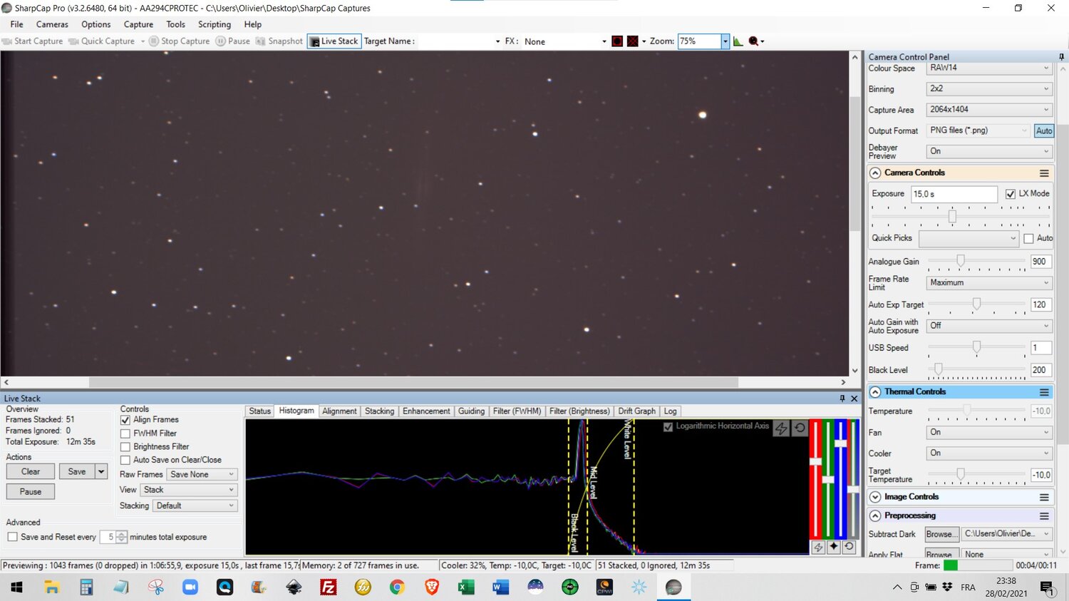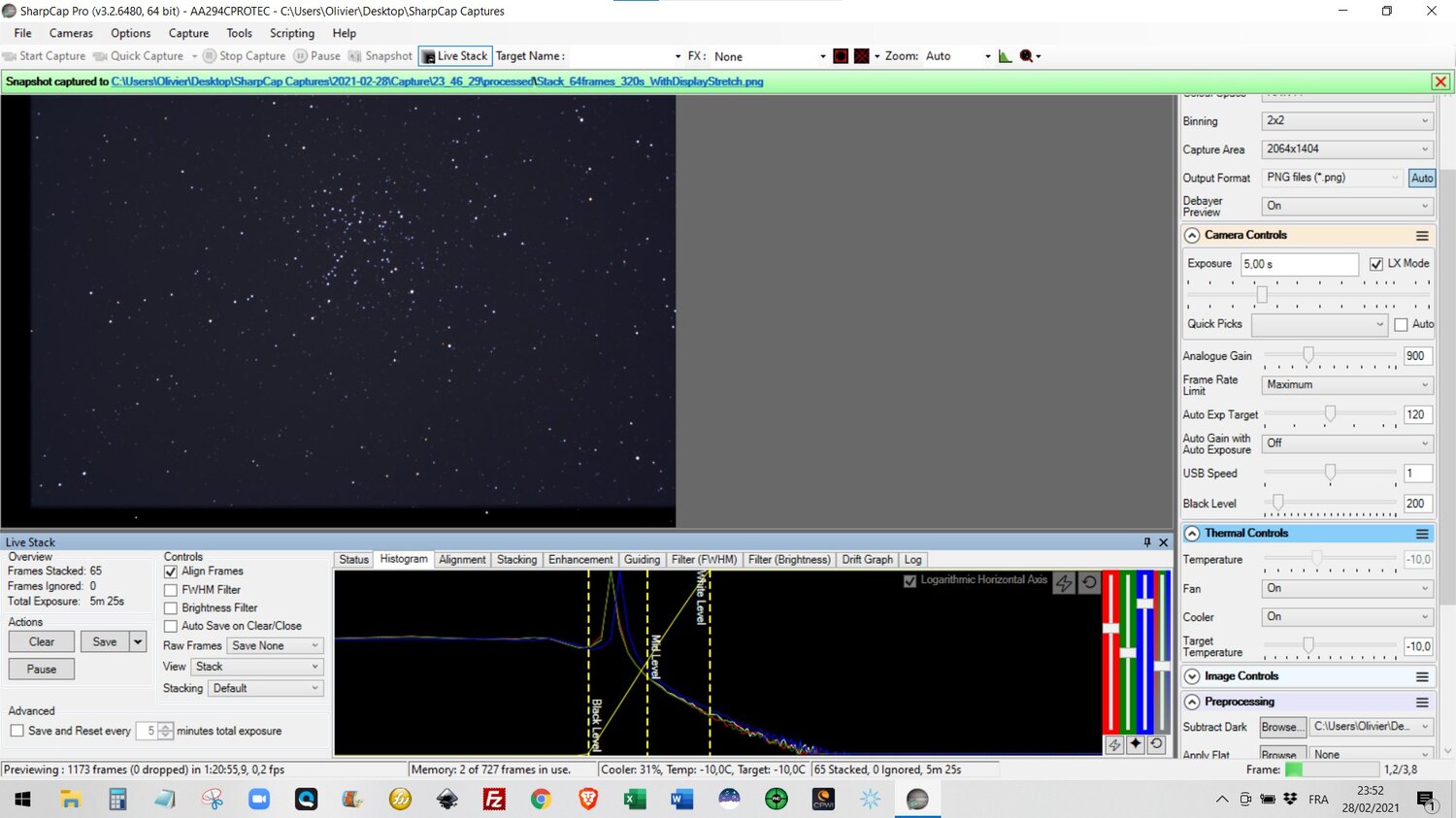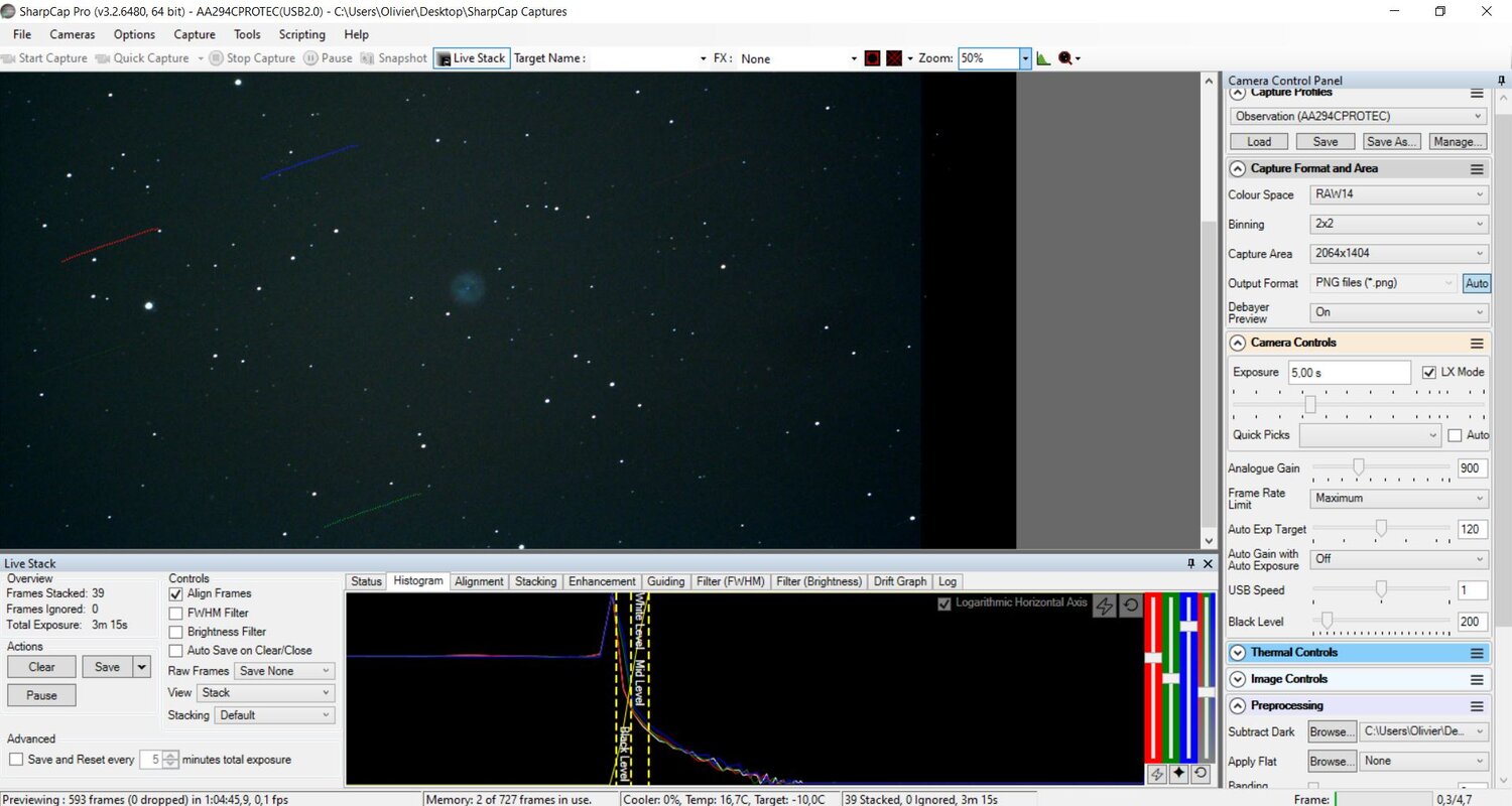 Cette fois j'ai essayé d'utiliser l'outil "cerveau" dans l'histogramme de sharpcam, après sensor analyse de la caméra Sharcap arrive a déterminer le meilleure temps de pose , le gain, l'offset Je pense que c'est une bonne aide pourtrouver le réglage approprié Résultat afin un gain plus faible que d'habitude mais un temps plus long 9.82 sec gain 355 (650max) offset 12, 2896 sec soit 48 mn 16 secondes, dark , flat traitement depuis le stack sharpcap, siril, garXpert astrosurface crop