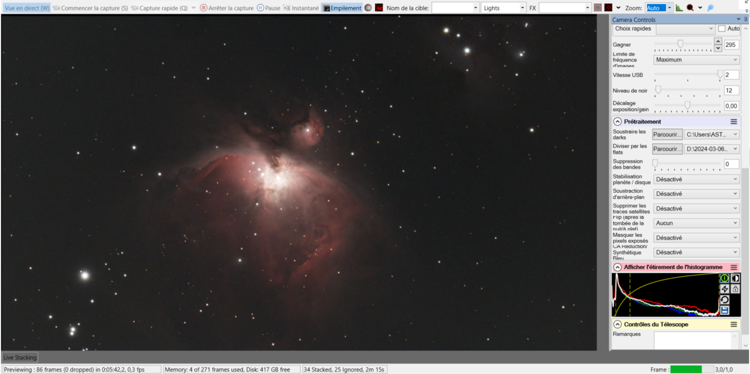 Grace aux conseils avisés @sebseacteam et @zeubeu, je pense que mes résultats s'améliorent Toujours avec ma TS photoline 80mm F7 , réducteur correcteur TS 0.8X et camera SVBONY SV705 IMX585 Capture faites toutes hier soir entre 19H30 et 03H30 le lendemain Dark fait régulièremenr durant la soirée toutes les 40 mn environ (entre chaque capture) > je vous laisse juge , il me reste à régler le tilt assez important Pour le traitement , j'ai pris le résultat de l'empilement sur sharcap, puis traitement sur Siril + graXpert c'est tout A vos critiques http://www.astrosurf.com/uploads/emoticons/wink.png Je m'aperçois après validation que le image sont un peu sombre, j'ai deux PC et celui de capture malgré un réglage de la colorimétrie il a un résultat fond du ciel plus clair vous me direz ce que vous en pensé M51 et ces copines : 400 images gardées 1H18mn42S par 6 sec crop NGC2903 : 389 images de 6 sec Siril n'affiche pas lPGC27249 mag 15.74 en haut et UGC 5086 mag 16.79 crop celle ci manque de piqué, capture un peu tôt Une partie de la chaine Markarian M86 au centre : 414 images de 6 sec, là aussi Siril en oublit , PGC 40636 sous NGC 4388 par exemple mag 15.65 et UGC 7500 au dessus mag 15 M42 cette fois 400 ms et 1028 images , belle trame hélas en bas à droite côté du tilt d'ailleurs et au dessus de la maison du voisin J'ai arrêté de pousser les curseur mais il reste du signal Magnitude sur Markarian 17.9 bortle 4 chez moi au mieux -