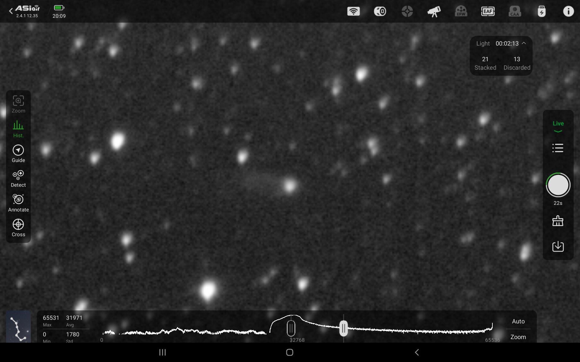 Toujours lunette TS 80 photline F 5,6 avec reducteur TS, IMX585 et premier guidage avec lunette 40 F4 et IMX290M , je n'avais pas fait de calibration ni l'assistant de guidage c'était un essai stack avec ASTAP avec alignement par astrométrie , je trouve que j'ai des meilleurs résultats que sur Siril et en plus il ne compile pas le gradient sans avoir besoin d'agir 1885 secondes soit 31 mn et 25 secondes => temps par pose 25,8 sec / frame d'abord l'image en vrai Va copie de sharcap (CROP) je saos pas si je ne la préfère pas à celle traitée Astrométrie magnitude maximale 18,4 M64 maintenant 35 mn 2 sec à 10 s / frame en VA un crop traitement identique au précédent CROP -