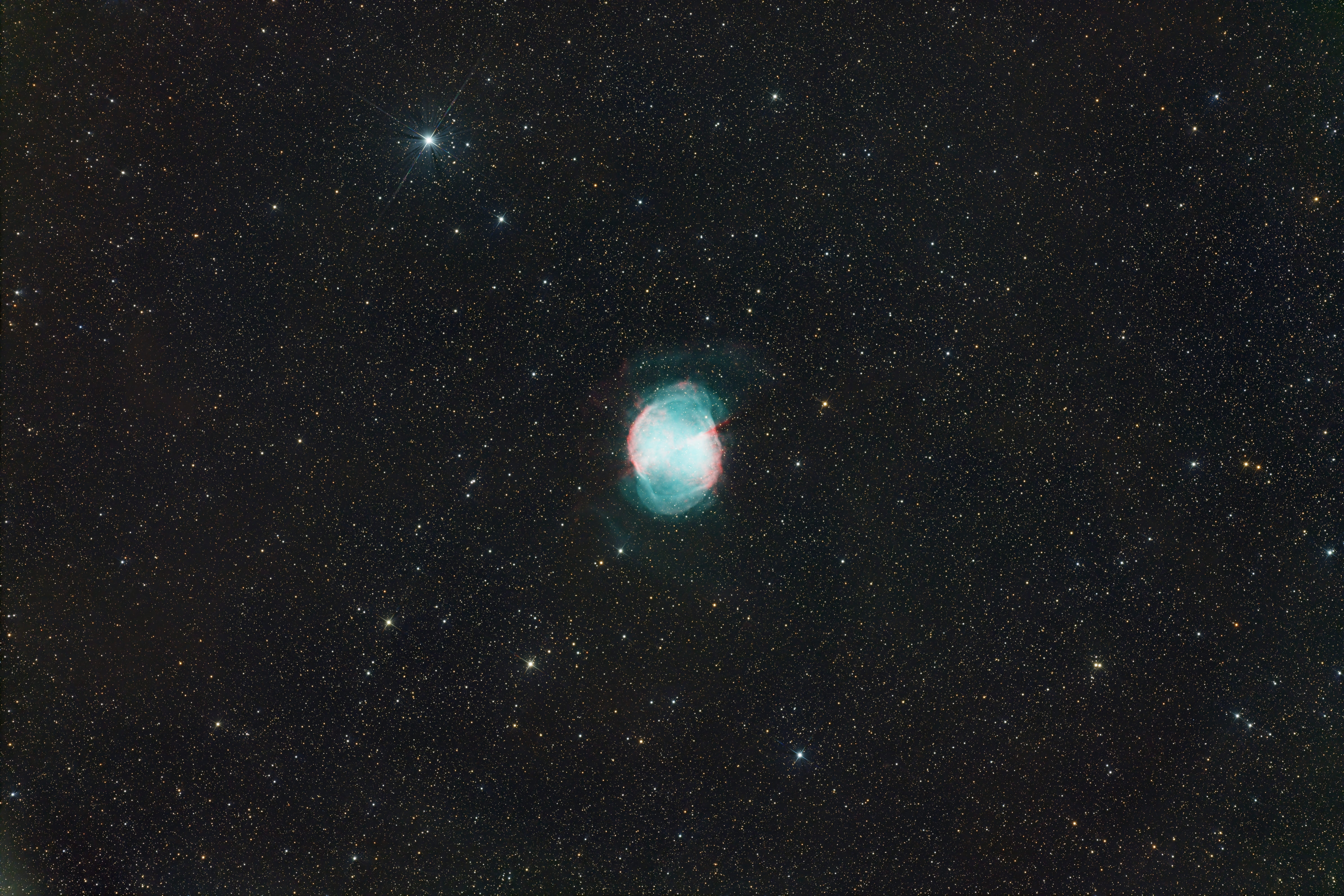Je l'avais vue sur Astrobin : ngc6894 sur Astrobin et je voulais l'avoir avec ce voile en Ha, mais c'étais mission impossible sous mon ciel pollué : sur l'empilement avec plus de 3 heures de poses, on ne devine même pas ce voile. Alors la voilà toute seule en HOO :