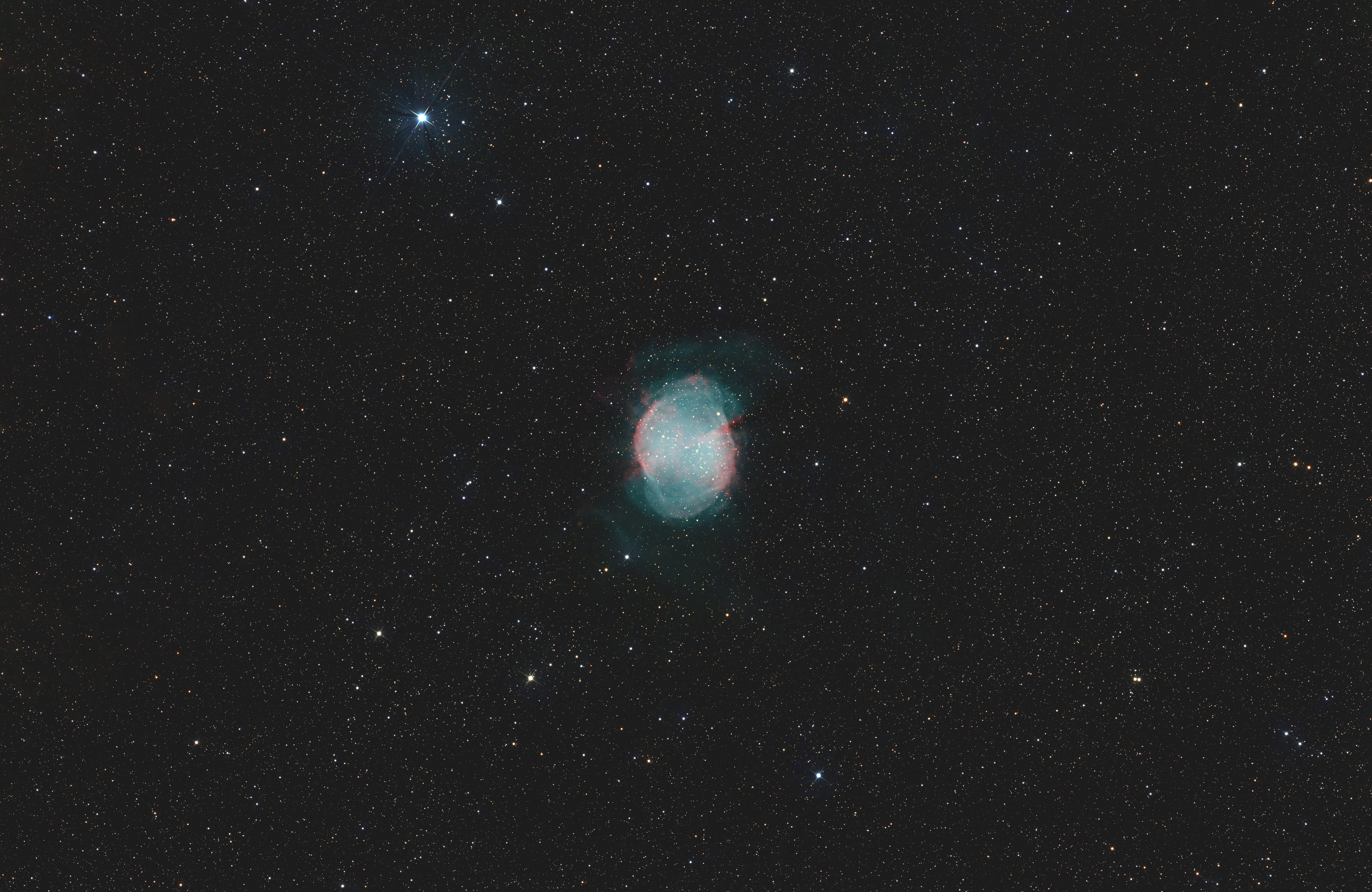 Hello, J'ai eu la chance de pouvoir passer un petit week-end dans le Morvan sous un splendide Bortle 3, d'avoir 1 nuit de ciel dégagé et d'avoir mis le matos dans le coffre 🥳 Le matériel n'a pas été très coopératif entre le WiFi du mini PC qui faisait un peu des siennes et le WiFi de la loc pas vraiment opérationnel non plus j'ai un peu shooté à l'aveugle en priant très fort que le guidage (entre autres) ne tombe pas en rade. En attendant que les Pléiades veulent bien pointer le bout de leur nez j'ai visé une petite heure sur M27. 20 subs de 3mins à -10° avec le IDAS LPS-D3 (pas d'UV/IR cut sur l'Uranus C Pro). Pas simple à traiter super lumineux un petit coup de HDR Multiscale Transform a fait le job on va dire et oui j'ai appliqué une sévère réduction d'étoiles : Les pléiades ensuite. J'ai pu lancer une séquence de 60subs de 3 minutes toujours même filtre même température (un jour il faudra que je me fasse des librairies de darks ... pas comme s'il allait faire beau ces prochain(e)s jours (semaines)...) Traitement pas simple non plus avec des halos résiduels au niveau d'Atlas (quoi que m'en suis pas trop mal sorti au final) et Alcyone qui m'ont donné du fil à retordre: Bon sur ce je m'en vais convaincre mon employeur et mon banquier que le Morvan c'est top et qu'il faut que je déménage rapidement 🤣
