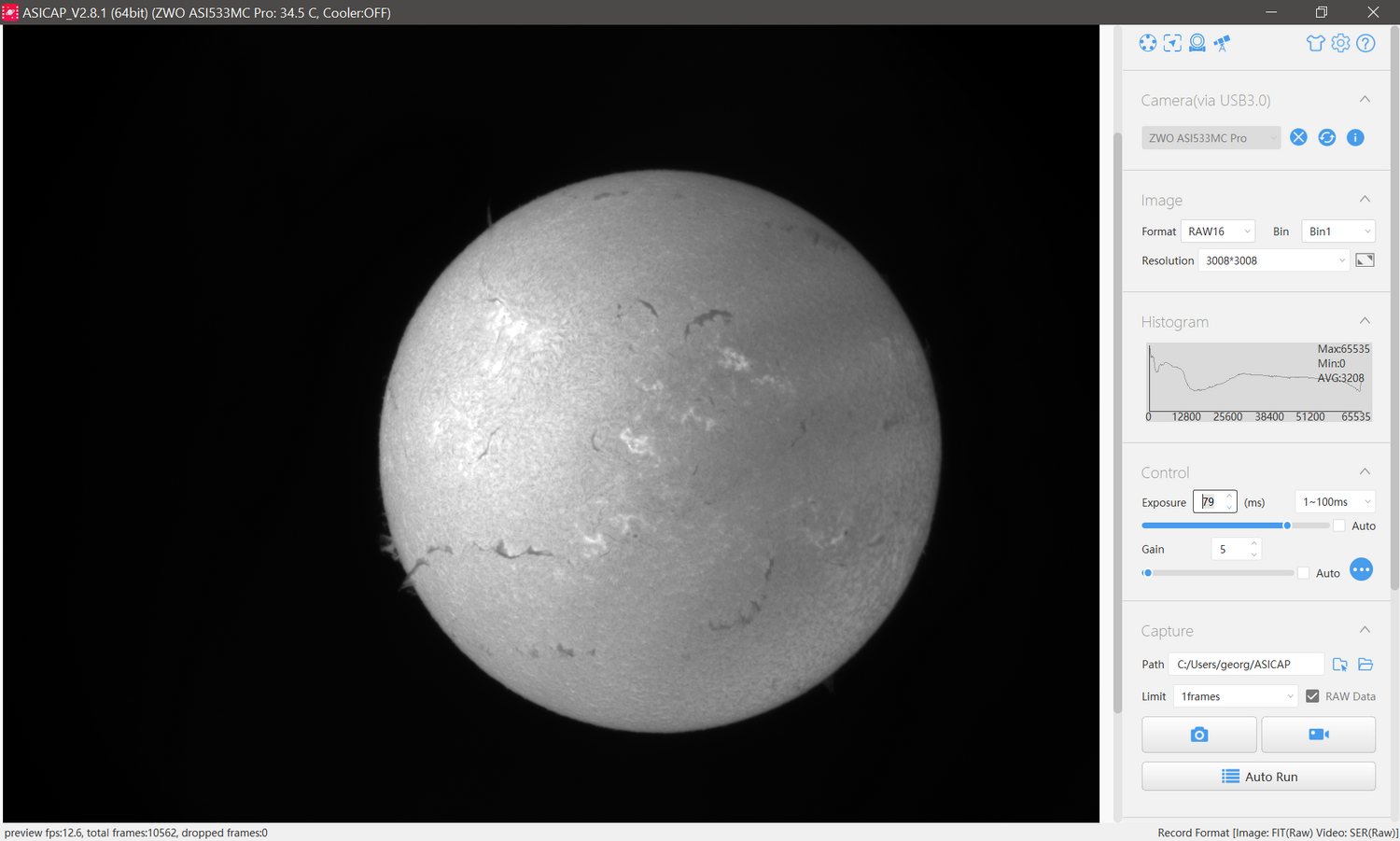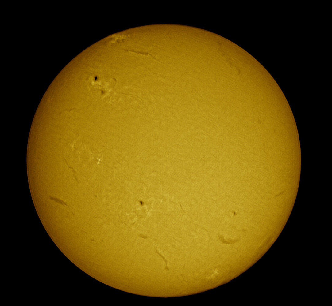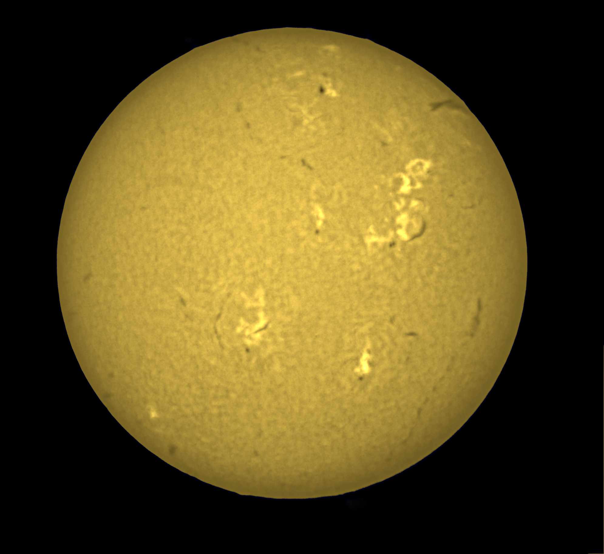 Après avoir vu les premières photos du Soleil faites avec cette lunette sur le site, j'ai opté pour m'en procurer une vu son prix attractif. Un peu de visuel un dimanche matin à la journée des associations. Et vrai sortie pendant une quinzaine, en cours, en Dordogne. La photo solaire est plus ardue qu'il n'y paraît. La mise au point n'est pas des plus simples, sans compter le réglage du Fabry-Perot. Bref, tâtonnement et essais et premières images. film de 500 images avec un ASI183MM. 50 et 100 images retenues avec Autostakkert 4, puis passage dans Registax6, l'inusable ! Colorisation avec GIMP. Il y a IMPPG qui est dédié au solaire, il suffit de s'y pencher. https://greatattractor.github.io/imppg/index.html