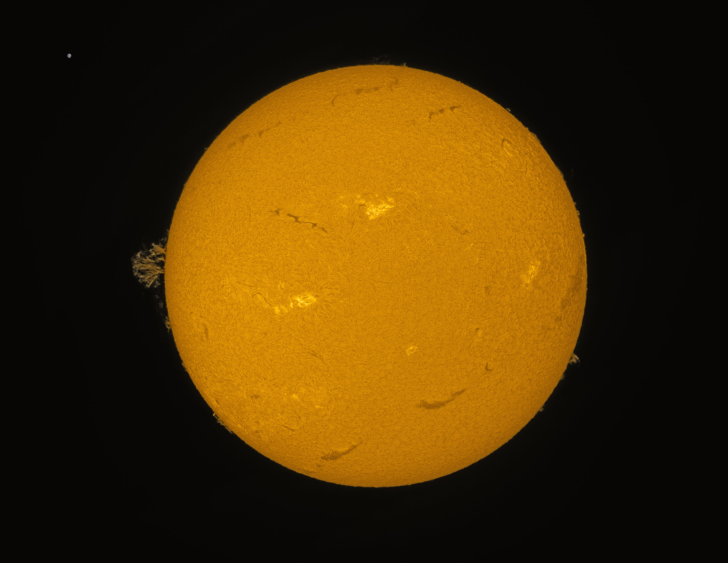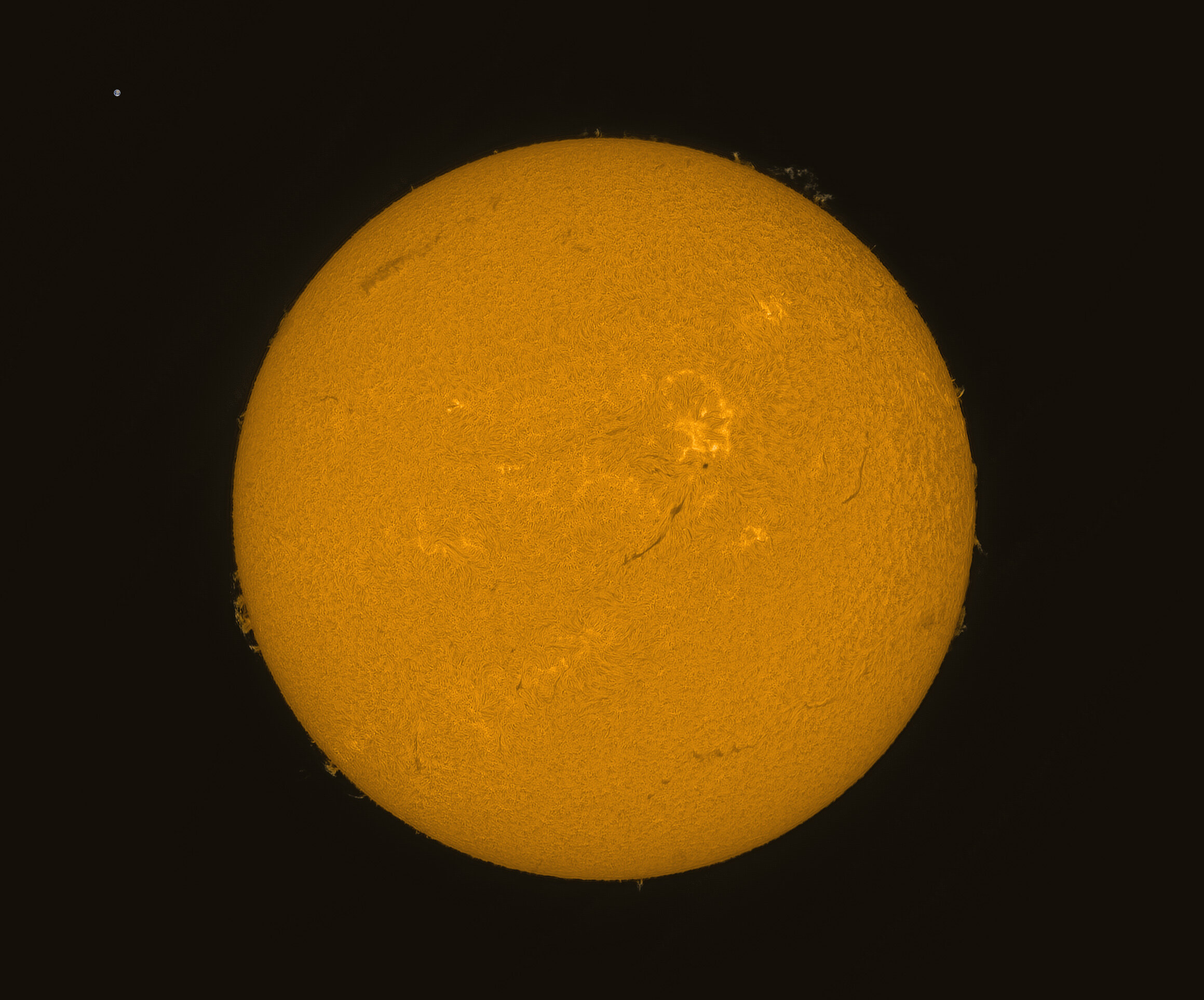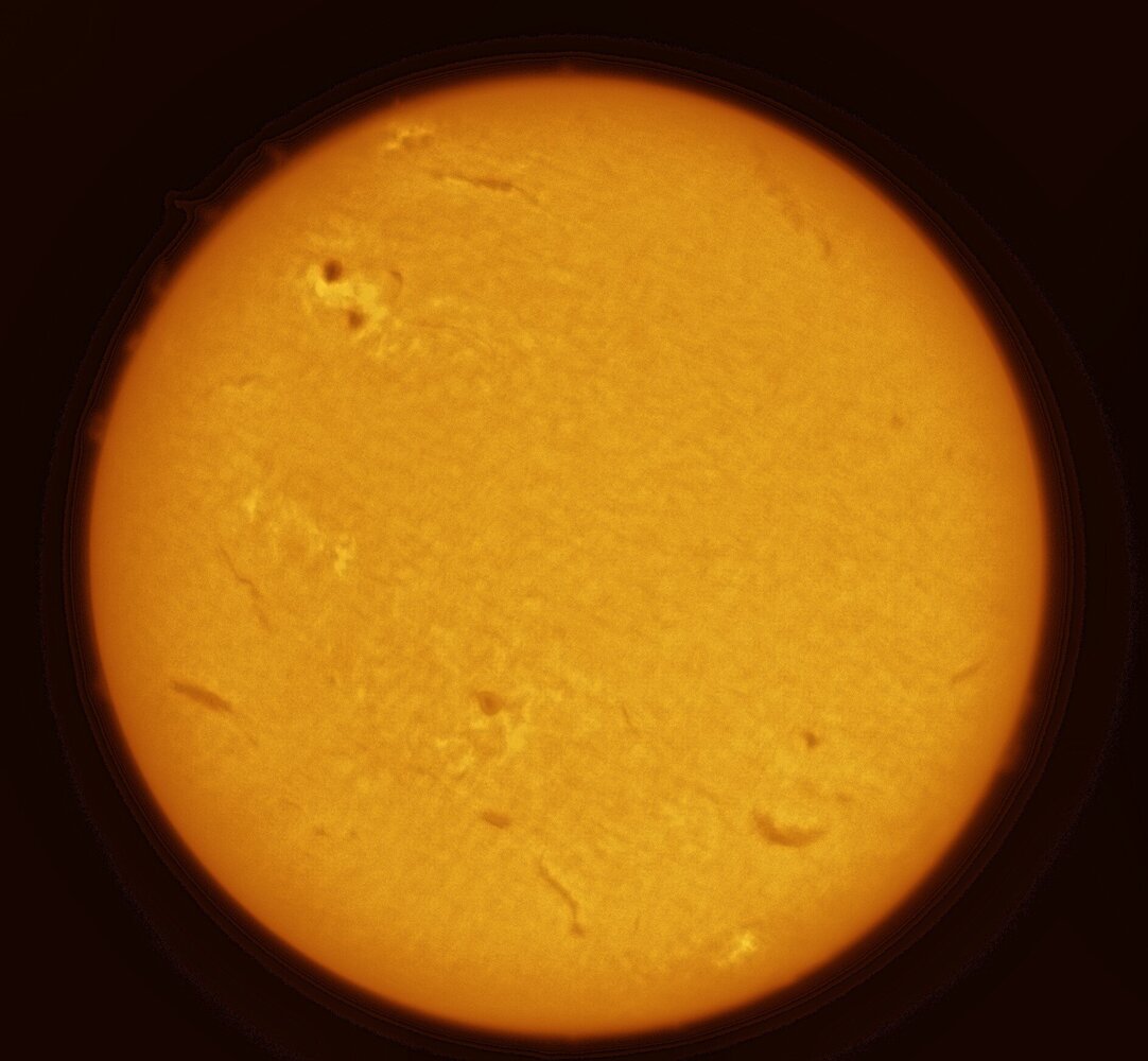 Bonjour, Reçu hier après-midi la lunette solaire H-Alpha Acuter Elite Phoenix 40/400mm. A peine déballé impossible de ne pas vite l'essayer entre les nuages. Malheureusement pas de grosse éruptions de chromosphère. Visuellement c'est très ludique de voir le soleil en temps réel. J'ai ensuite monté la camera ZWO ASI678MM à la place de l'oculaire. Et vite fait avec le logiciel de la camera que je ne connais pas encore AsiCapture. J'ai fais quelques vidéos avec les réglages par défaut. Une était un peu meilleure. J'ai donc stacké la vidéo avec Autostakkert que je ne connais pas vraiment (utilisé 2 fois sur la Lune). Le résultat probablement très perfectible est fini dans darktable et GIMP sous Linux. C'est donc un travail de débutant pressé de sortir une première image de son matériel (je n'ai même pas tourné le soleil dans le bon sens (je crois) 😊- 33 réponses